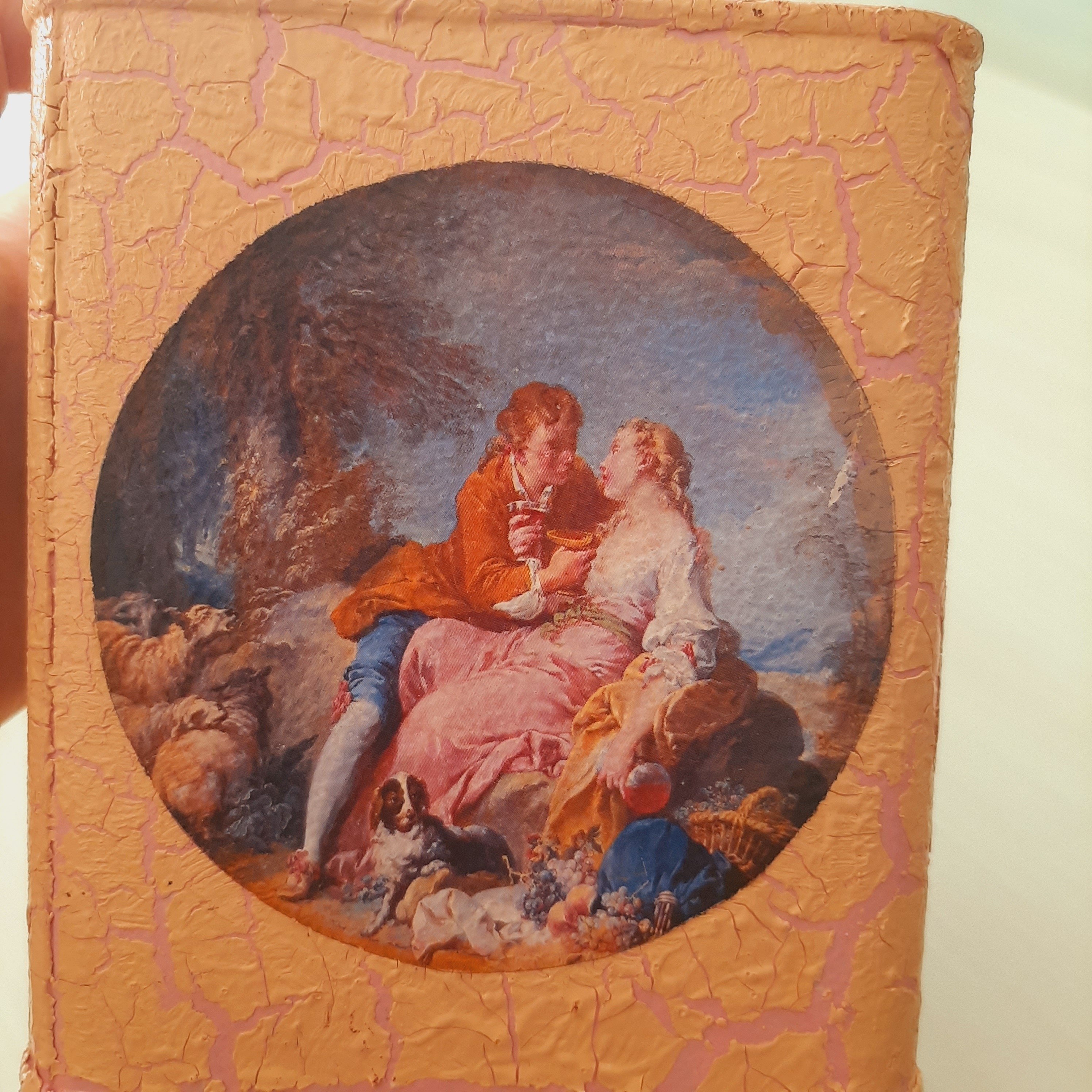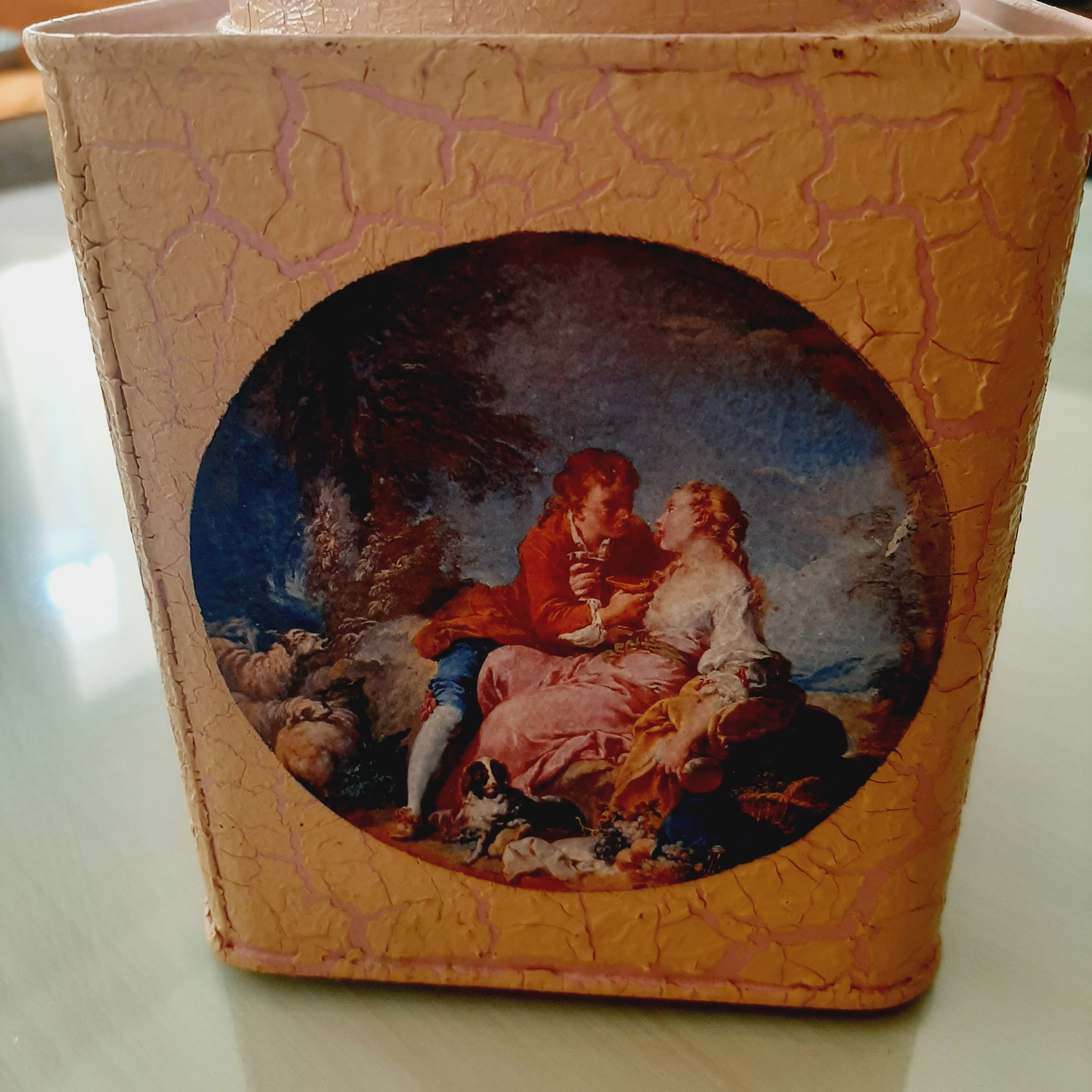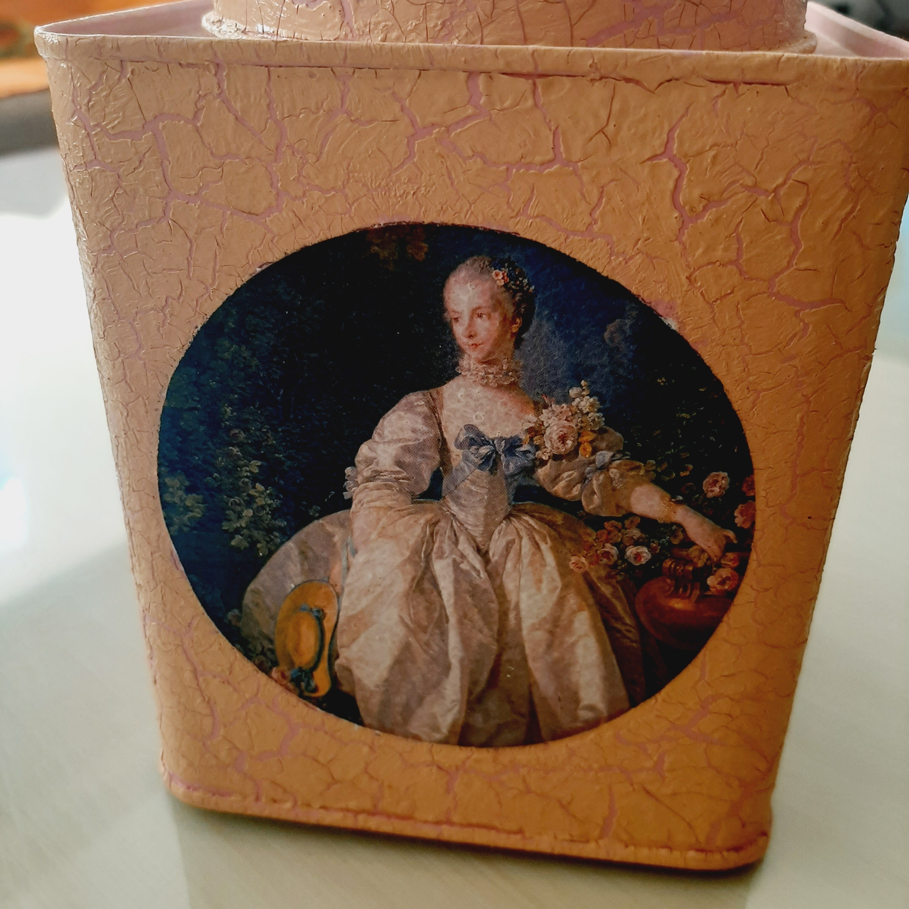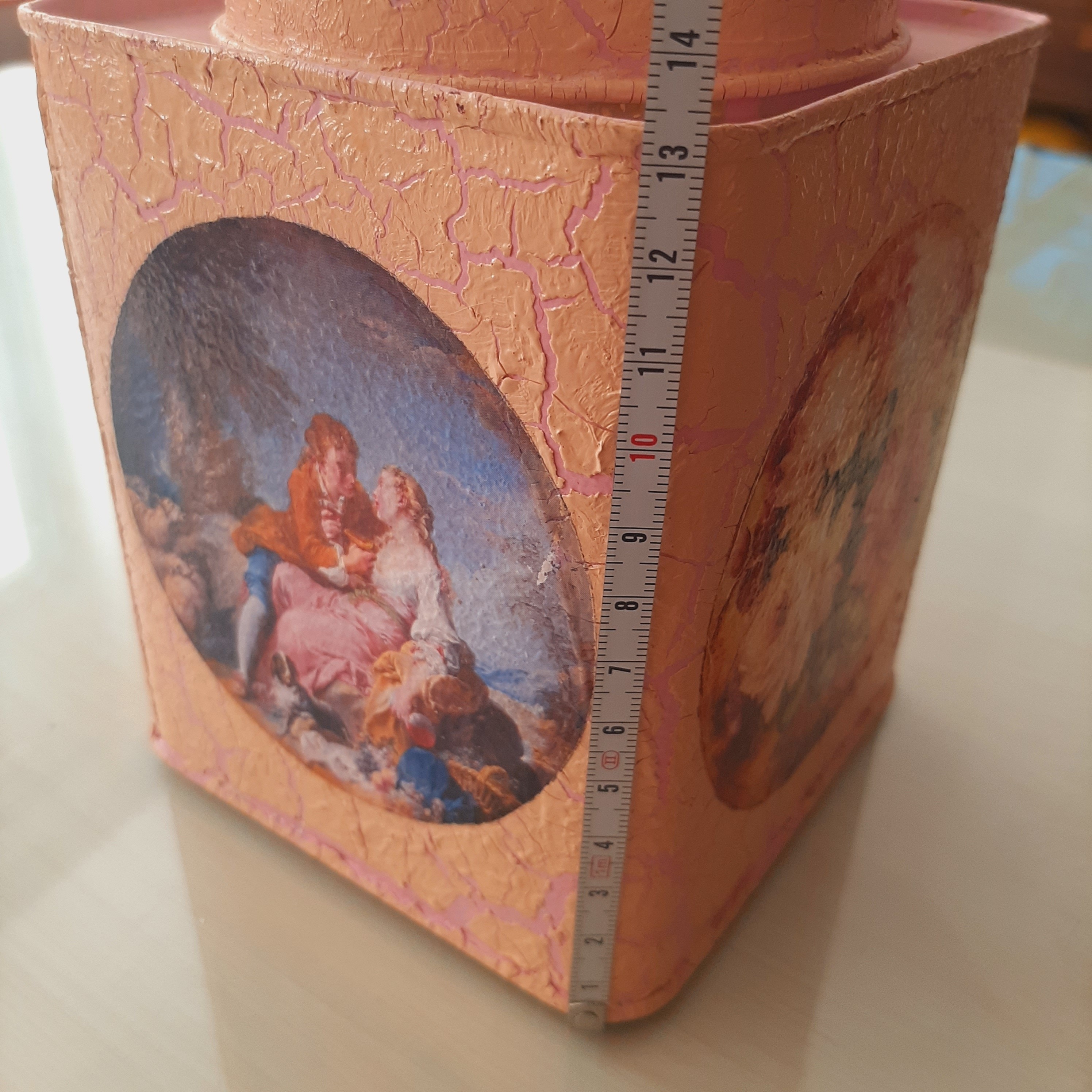 قوطی فلزی دکوری طرح پتینه فرانسوی در قوطی باز نمیشود ارتفاع قوطی بدون حساب کردن در 13 سانتیمتر و عرض 11 سانتیمتر کار دست رنگ صورتی گلبهی