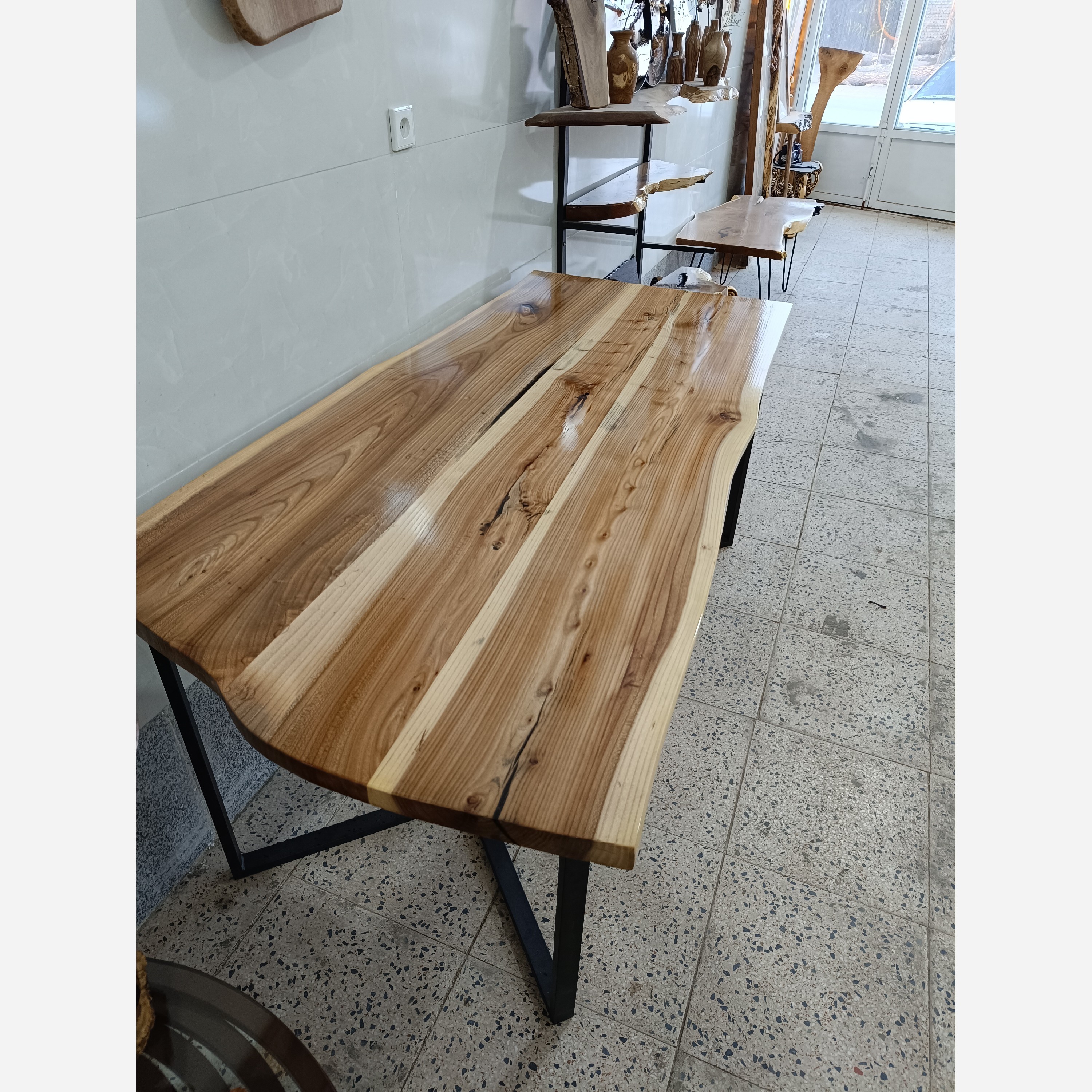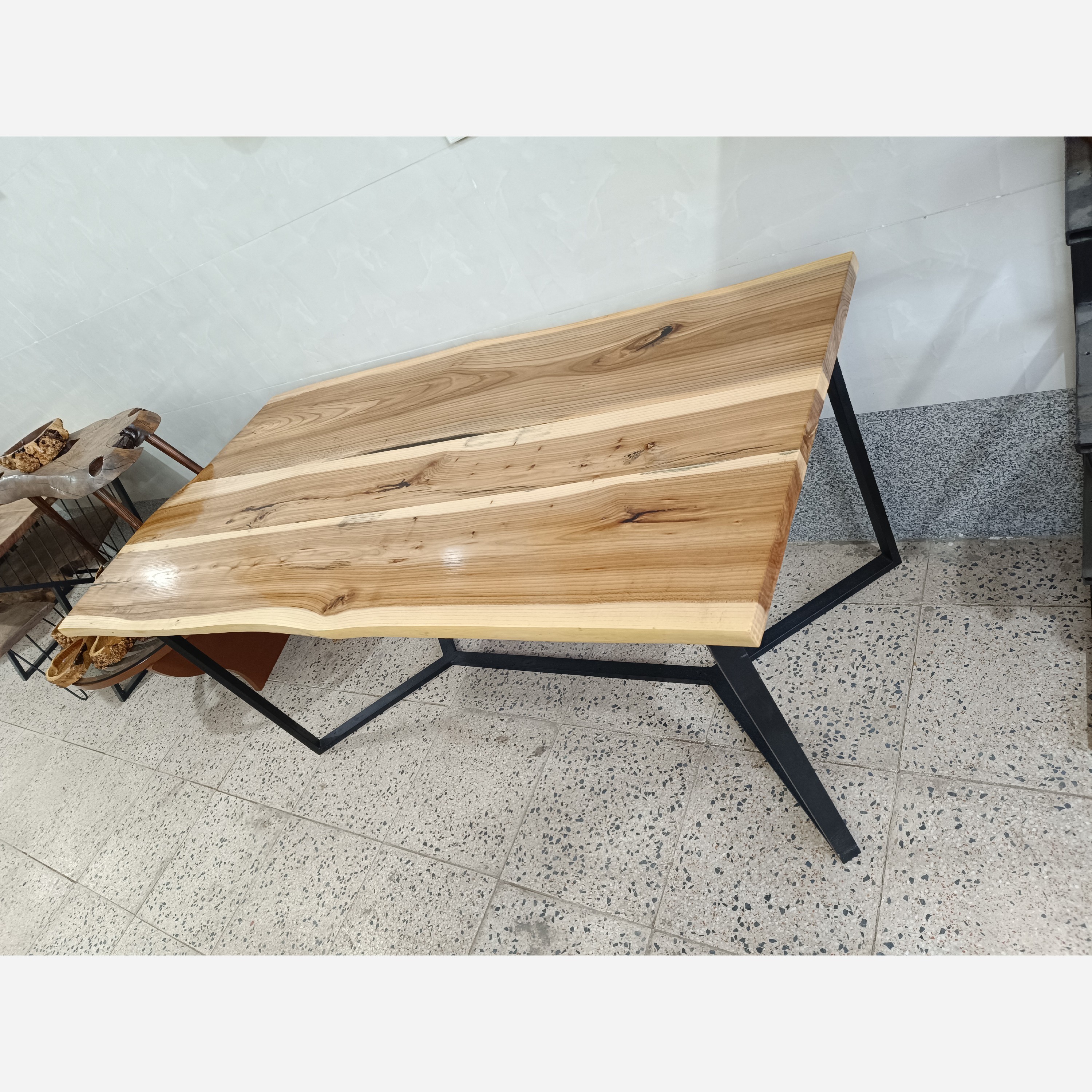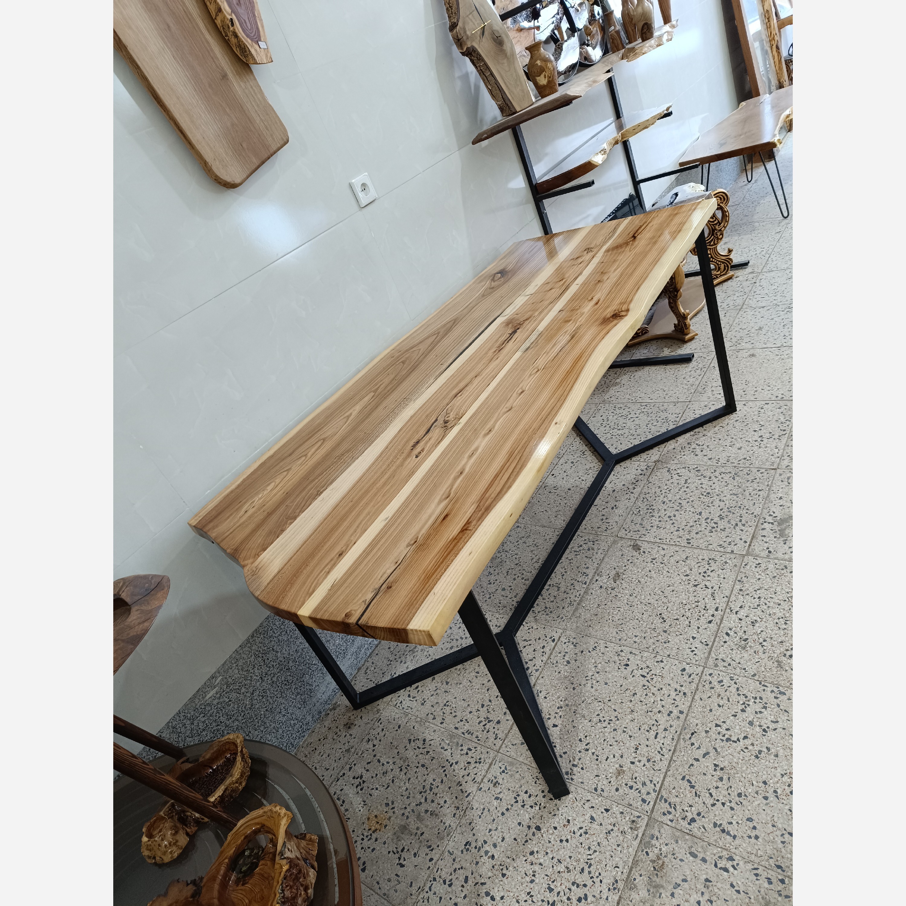 میز غذاخوری 6نفره چوبی چوب قرقاج پوشش نیم پلی استر براق پایه فلز سنگین 4 در2 رنگ کوره ای زیر میز شاسی کشی شده برای جلو گیری از تاب برداشتن