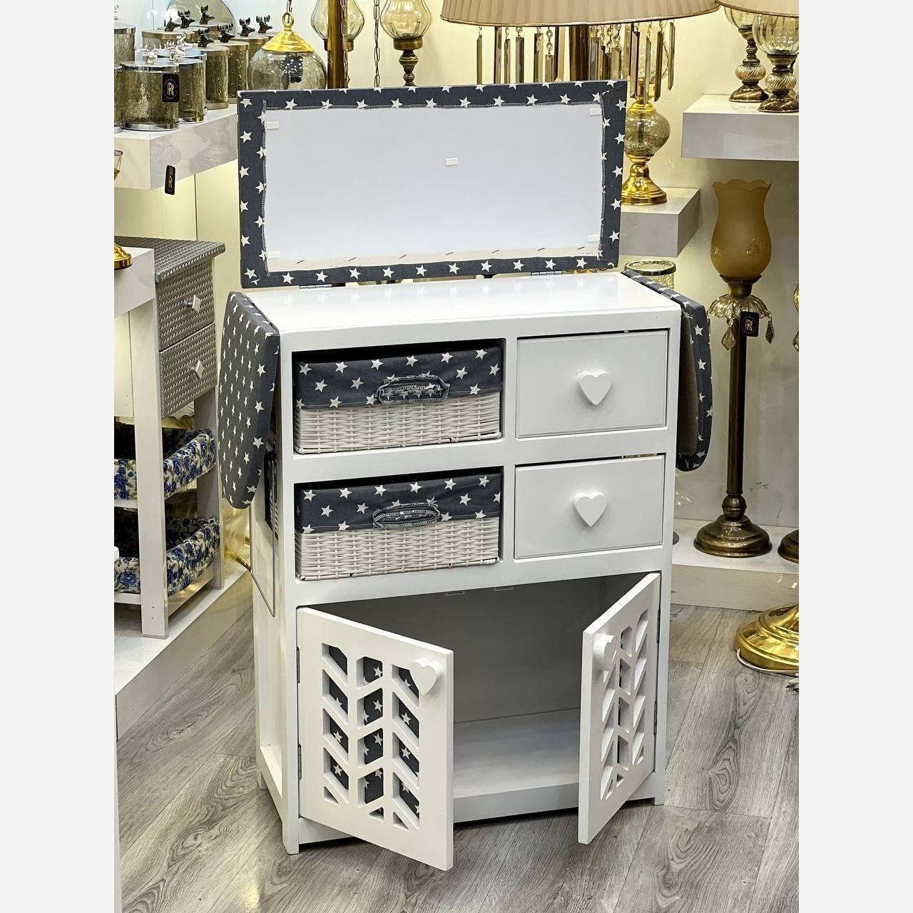 🥰🥰🥰🥰🥰 #میزاتو میز اتو و جای چرخ خیاطی تبلتی ….. درب مگنتی … 5 کشو …. تمام ام دی اف… رنگبندی : سفید کد: 243 طول: 61 عرض:27 ارتفاع:84