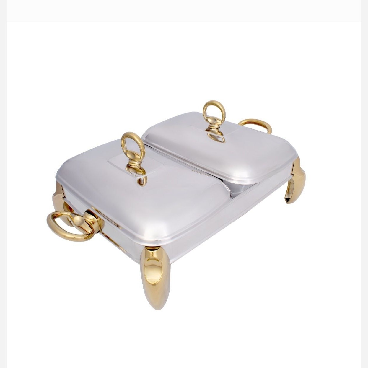 درود بر شما سوفله دوقلوپافیلی با پایه و دستگیره های طلایی گنجایش هر ظرف 1/5 لیتر ساخته شده از استیل 18/10 آهنربا نگیر آبکاری پایه ها و دستگیره ها فورتیک پیرکس درجه یک شعله مستقیم بسیار زیبا و چشم نواز برند سانیکس