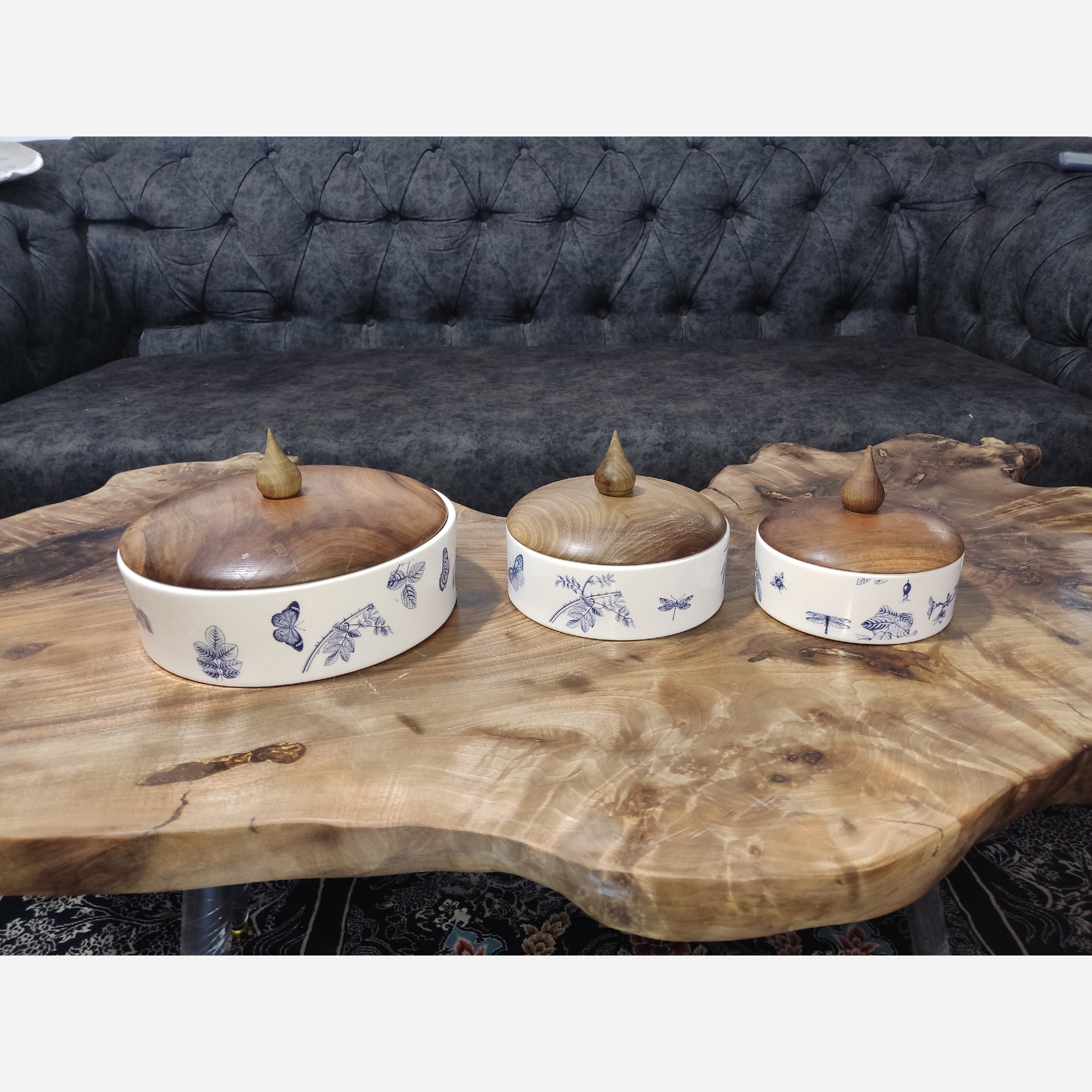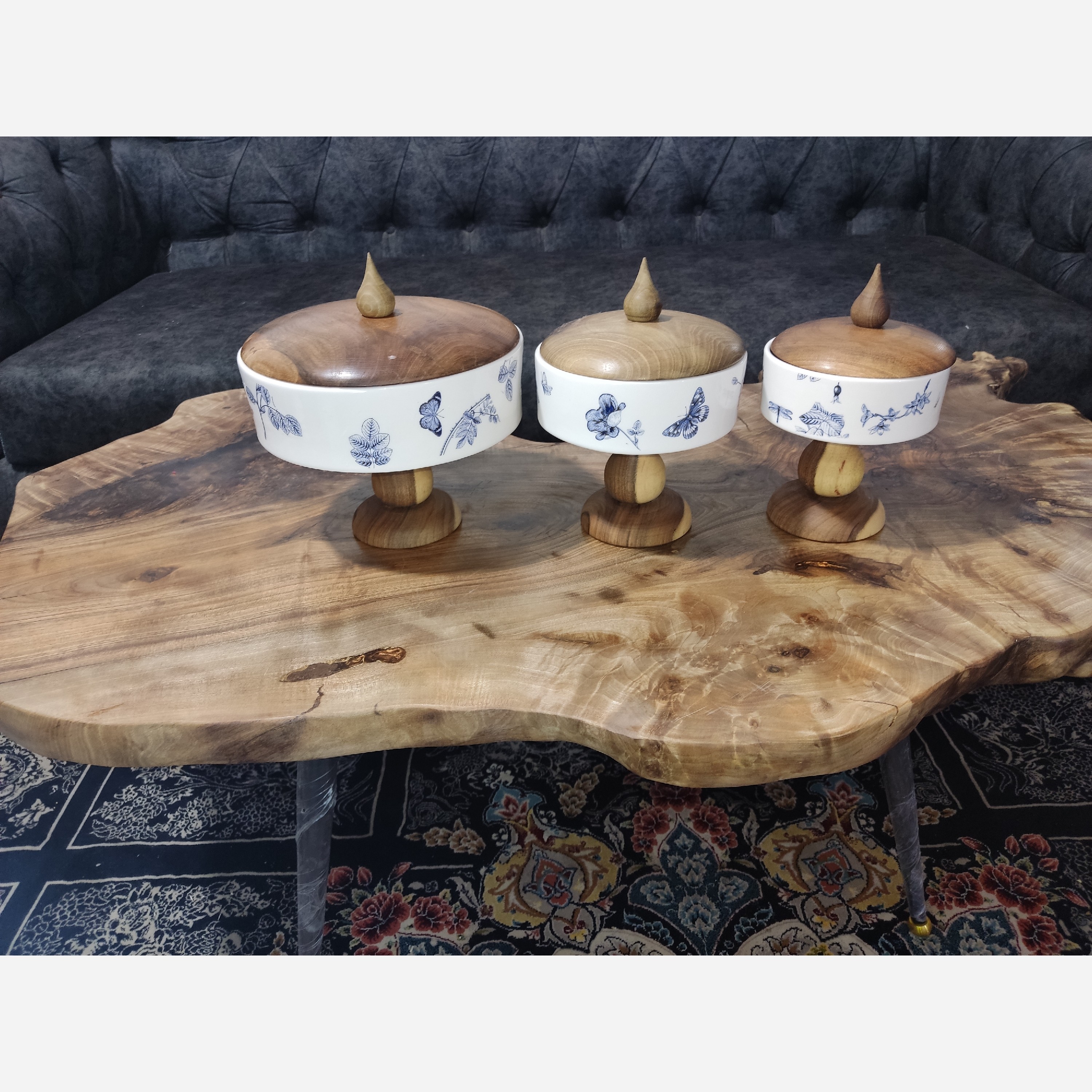 شکلاتخوری اجیلخوری سرامیکی پایه چوبی درب دار طرح قلم ابی پروانه ابی پرنده ابی مبلمونسرا مدل 275797
