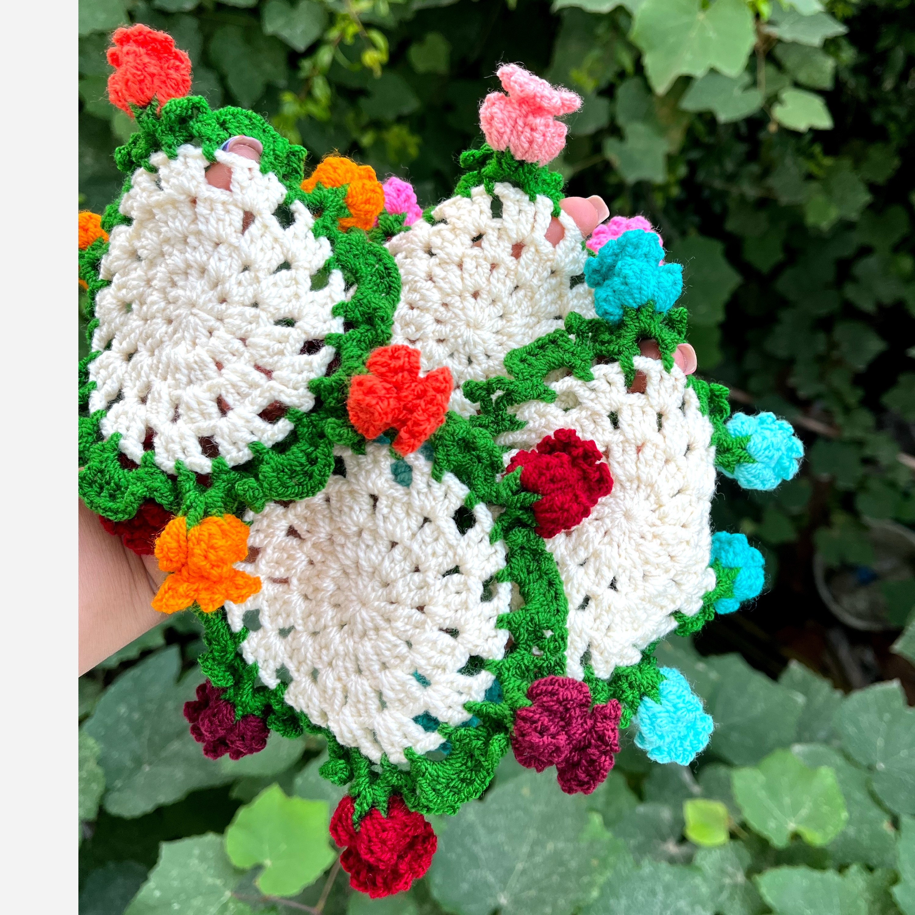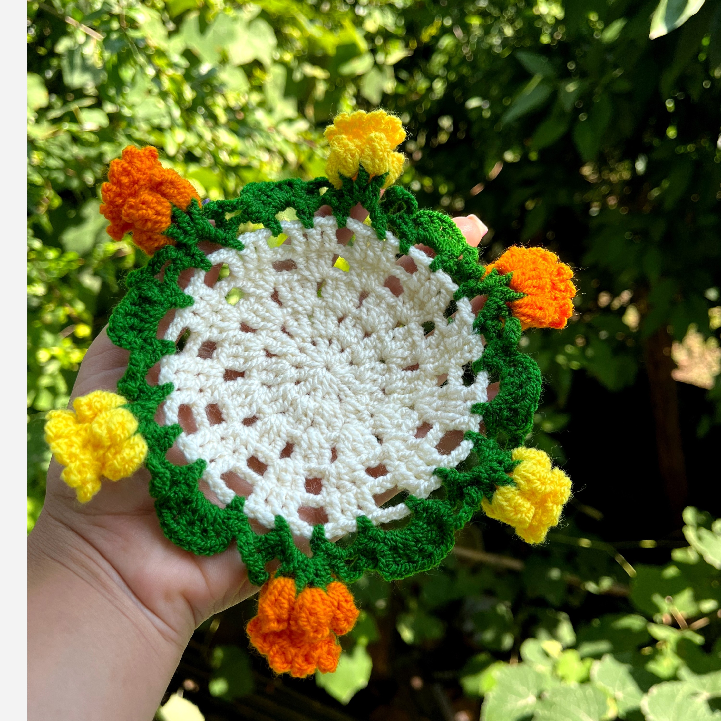 زیرلیوانی دستبافت گلدار که وقتی جمع میشه عین یه دسته گل کوچیک میشه 😍 دستبافت و بافته شده با نخ ایرانی قابل سفارش در ابعاد بزرگتر برای زیر بشقابی و یا رومیزی و شال مبل و...
