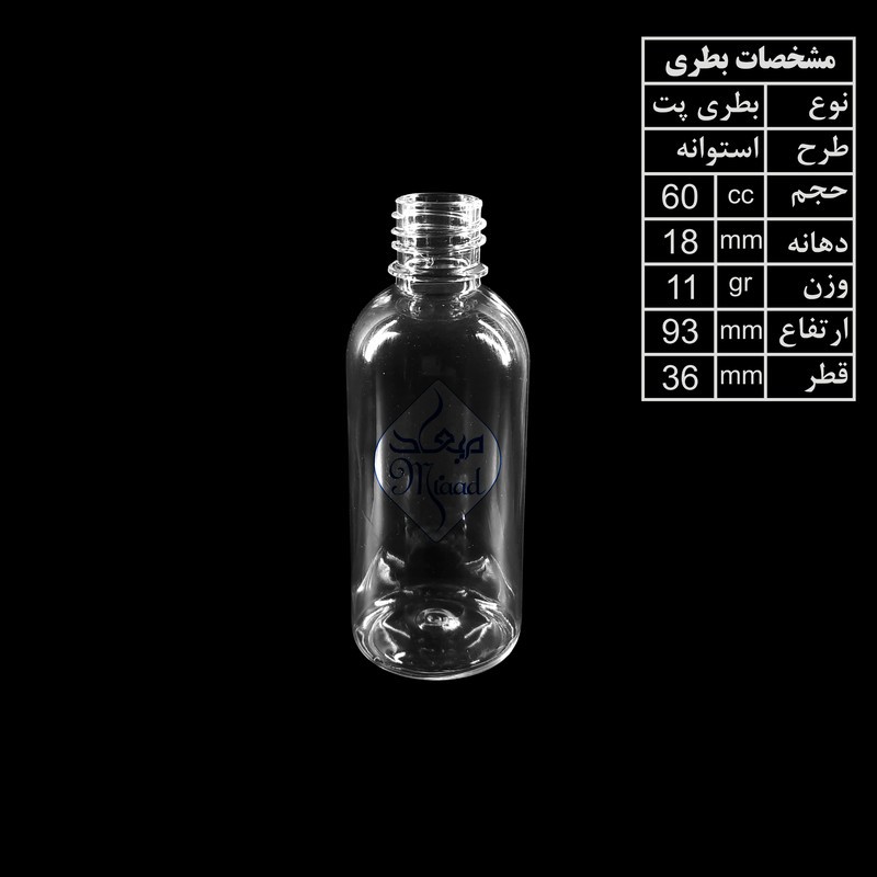 ظرف اسپری میعاد در حجم 60 سی سی از جنس بطری پت 11 گرم و والو وارداتی میباشد . بطری این محصول محکم و مقاوم بوده و بر اثر فشار و ضربه شکل اولیه خود را از دست نمیدهد . این محصول فقط با لوگوی میعاد روی محصول معتبر میباشد . این مجموعه شامل 6 عدد ظرف اسپری میباشد . جنس بدنه: پلاستیک قابلیت شستوشو: با دست مشخصات-ابعاد: 6x3x7 سانتیمتر مشخصات-وزن: 10 گرم مشخصات-ابعاد بستهبندی: 12x5x13 سانتیمتر مشخصات-وزن بستهبندی: 10 گرم مشخصات-جنس بدنه: پلاستیک مشخصات-قابلیت شستوشو: با دست