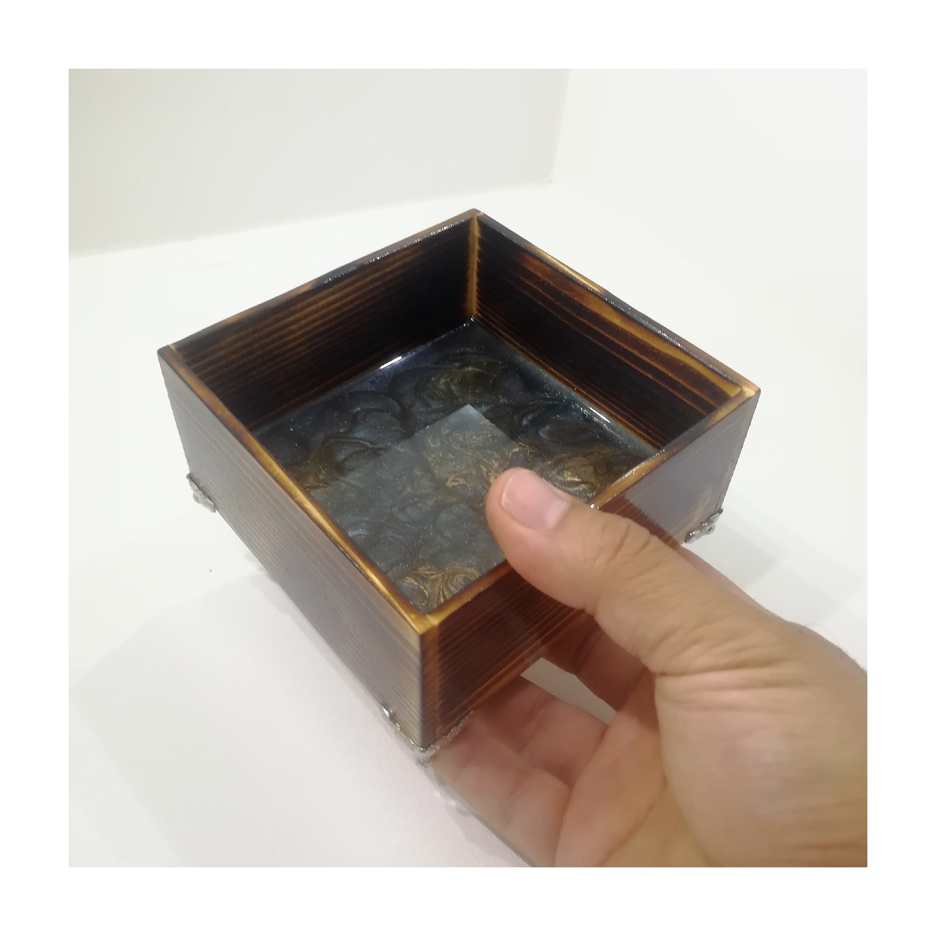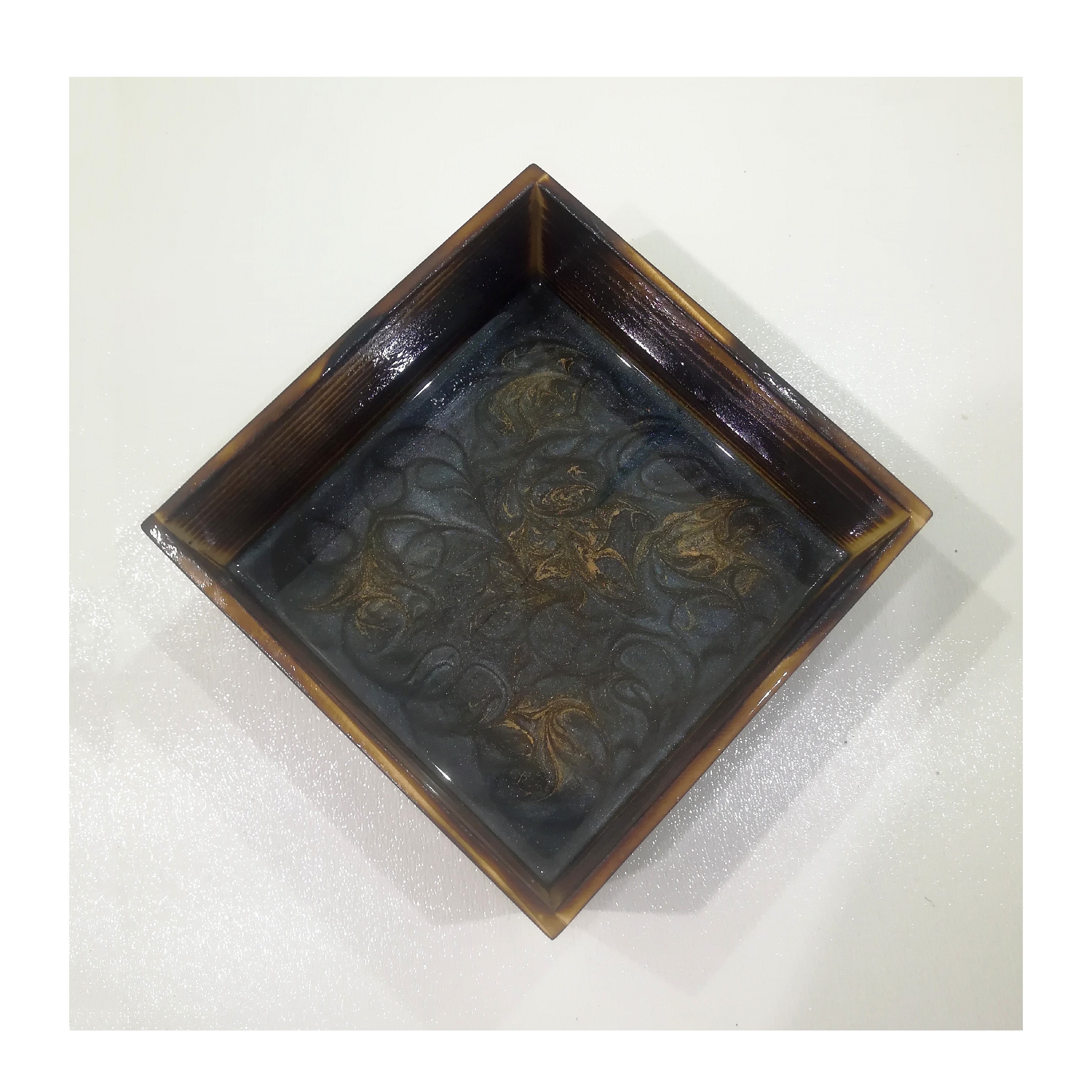 شکلات خوری چوبی با پایه آنتیک فلزی طرح عقاب نقره ای پوشش شده با رزین با کفی رزین طرح ابر و باد ساخته شده از چوب روس