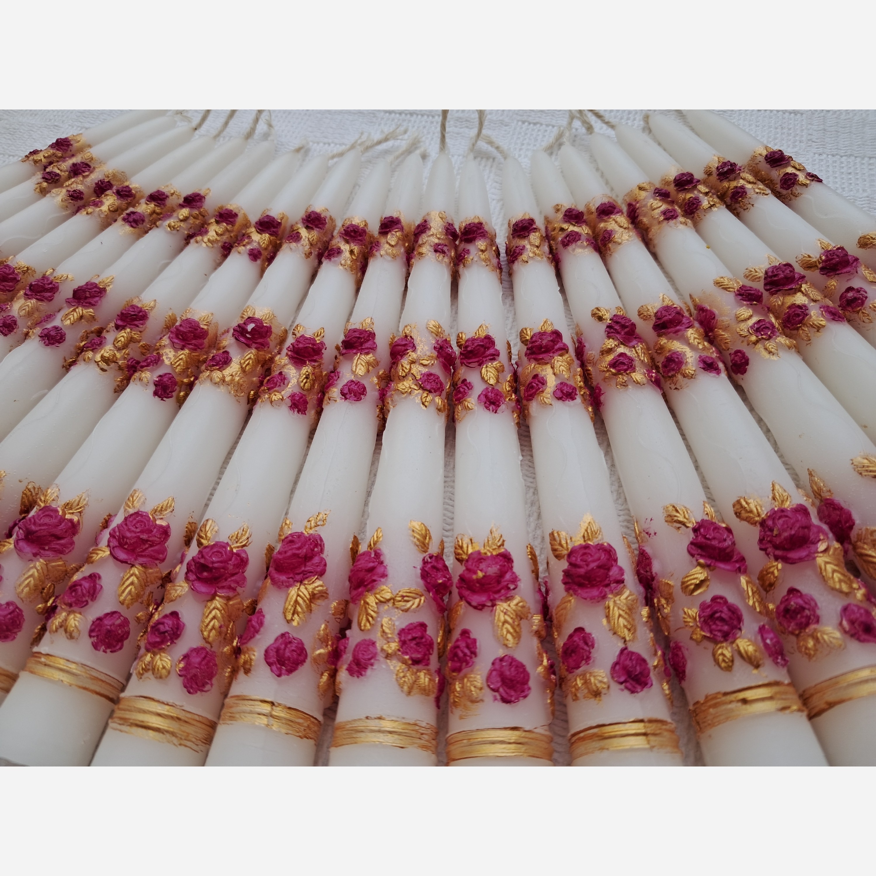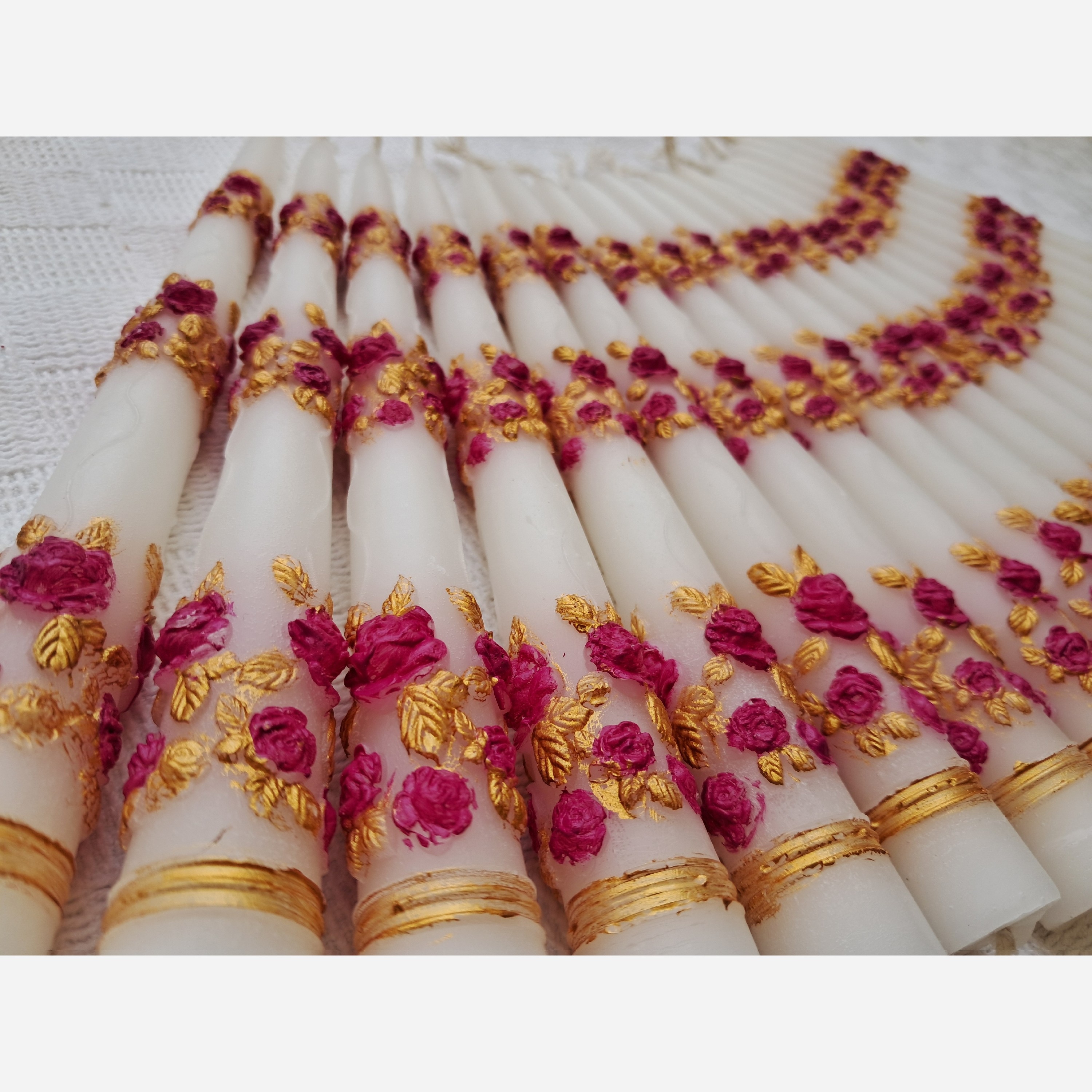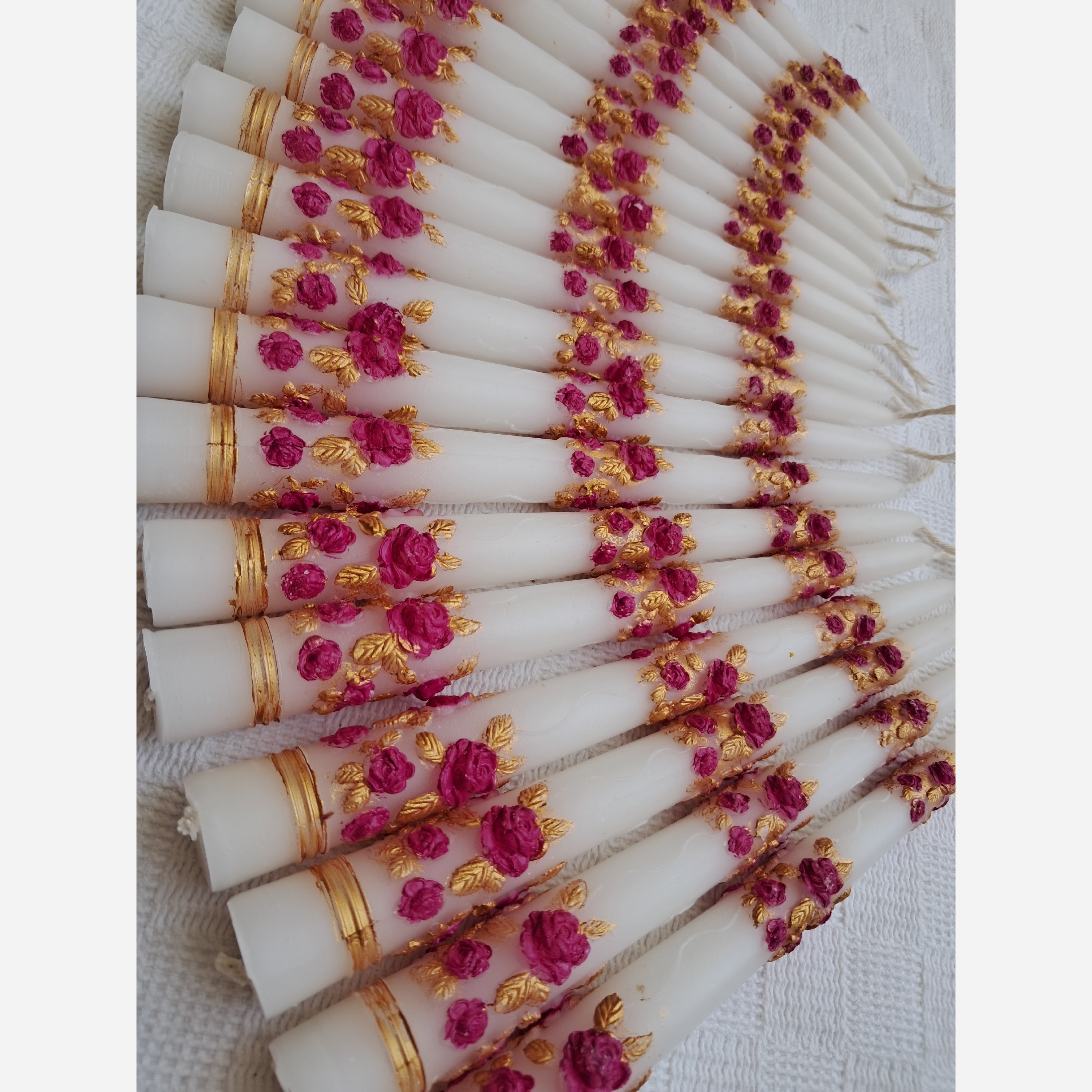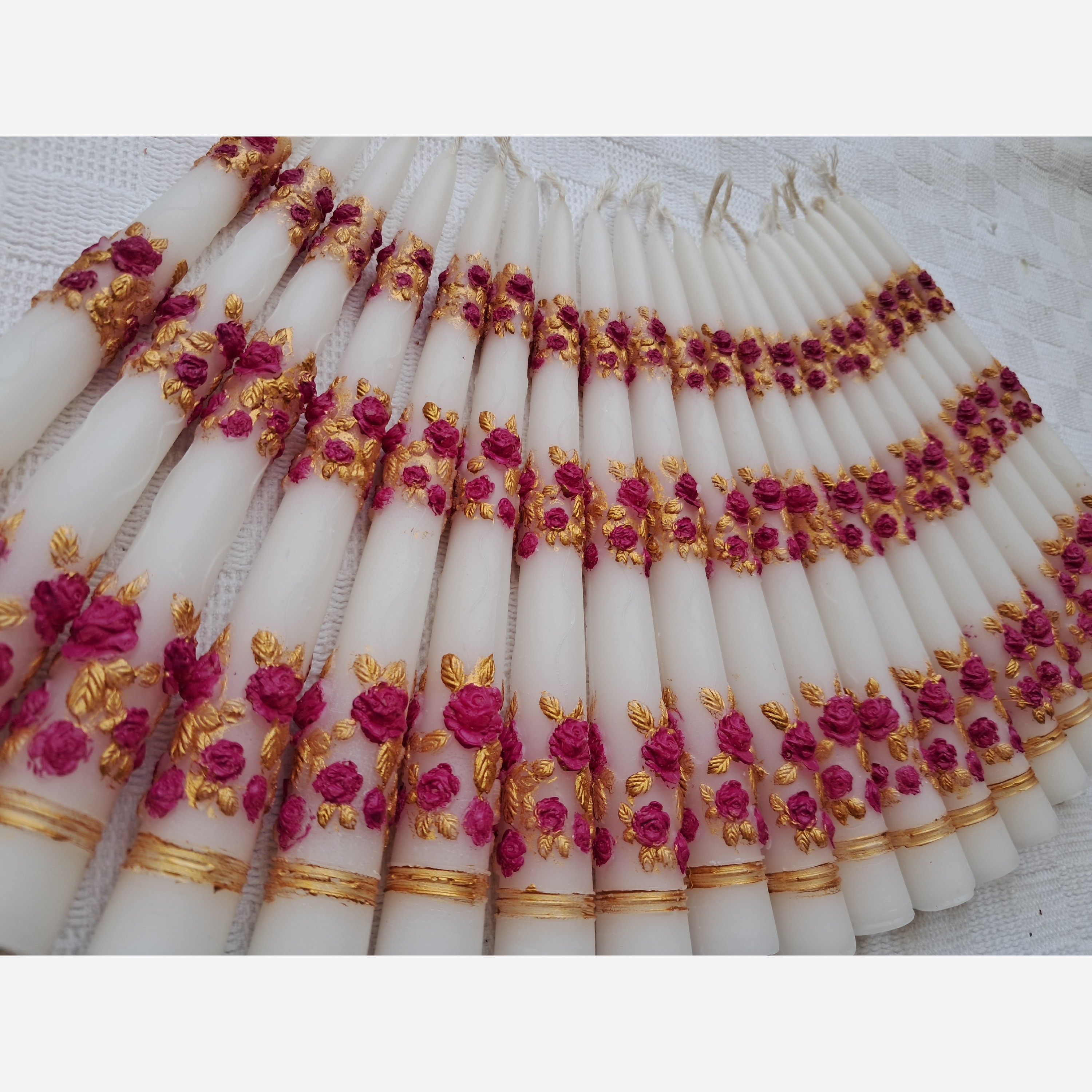 شمع قلمی گل برجسته گل رز ابعاد:20 سانت قطر: 2 سانت رنگ: سرخابی.طلایی ساعت :سوخت 6 ساعت بسته های 20 عددی