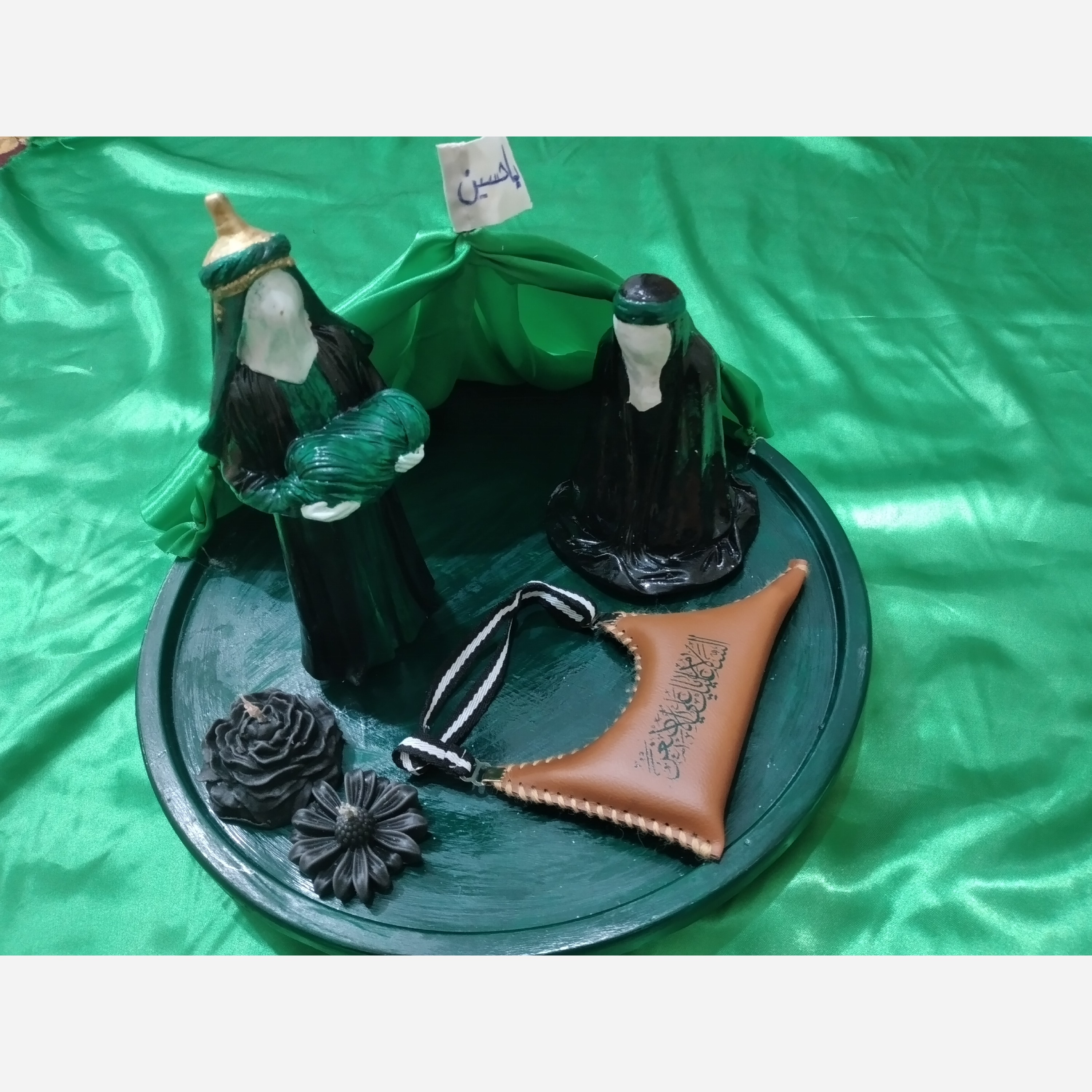 سینی قطر36سانت خیمه نمادین مشک نمادین دوعددشمع سیاه گل آلاله وگل بابونه مجسمه امام حسین ع ومجسمه حضرت زینب س