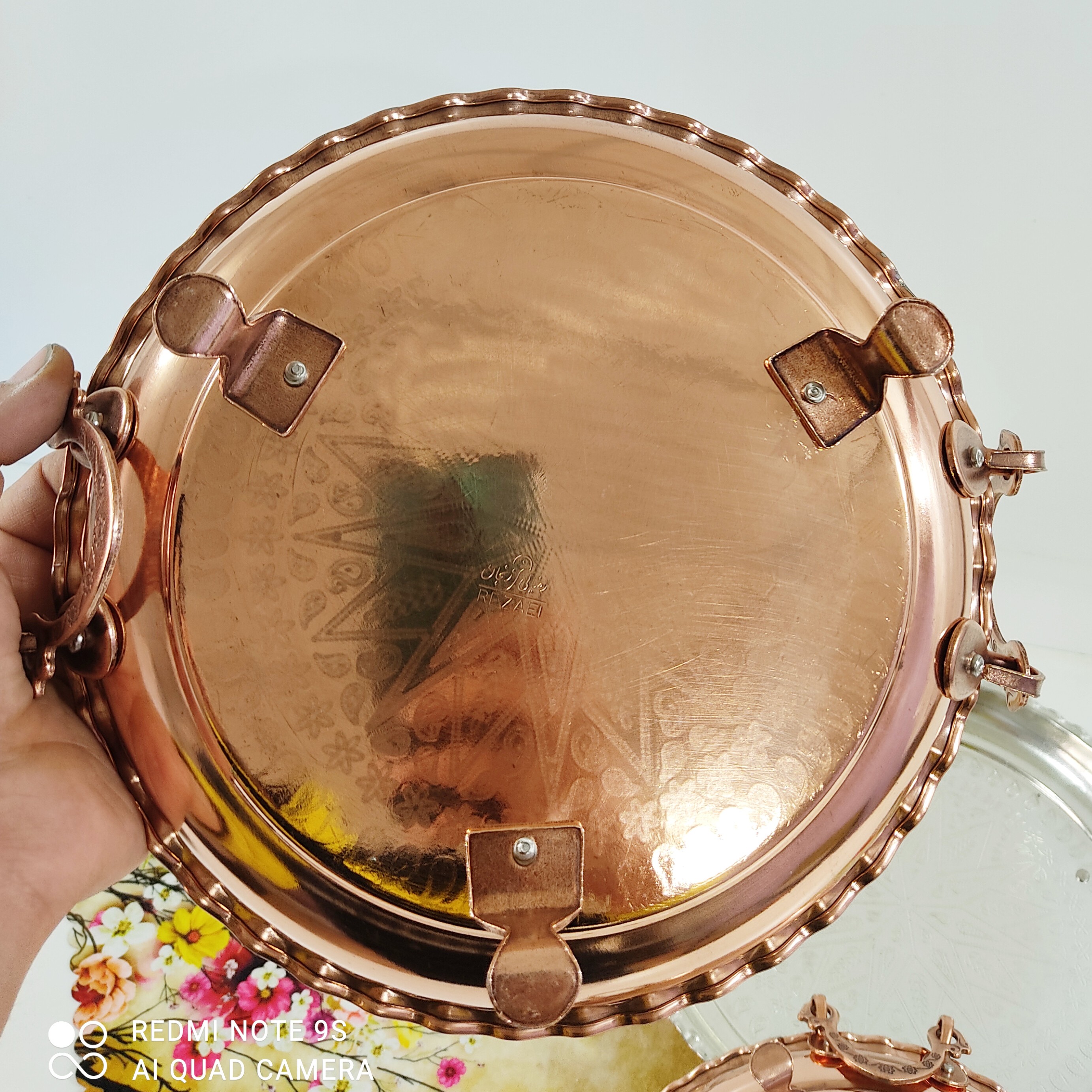 دیس و مجمع تمام مسی زنجان داخل طرح برجسته قطر 27 سانتیمتر که این کار در 5 سایز دیگر موجود است و میتوانید سفارش دهید تولید مستقیم و بدون واسطه: خرید با قیمت منصفانه از تولیدکننده معتبر، بدون هزینههای اضافی واسطهگری. جنس مس اصل با پوشش نانو محافظ: این ظرف از مس ناب زنجان ساخته شده و با فناوری نانو پوشش داده شده رنگ ثابت پوشش داخلی قلعاندود شده، کاملاً مناسب برای تماس با مواد غذایی و حفظ سلامت شماست. طرح ترمه برجسته در کف مجمع، به این محصول جلوهای خاص و سنتی داده است حتی دستهها و پایه ها مس هستند