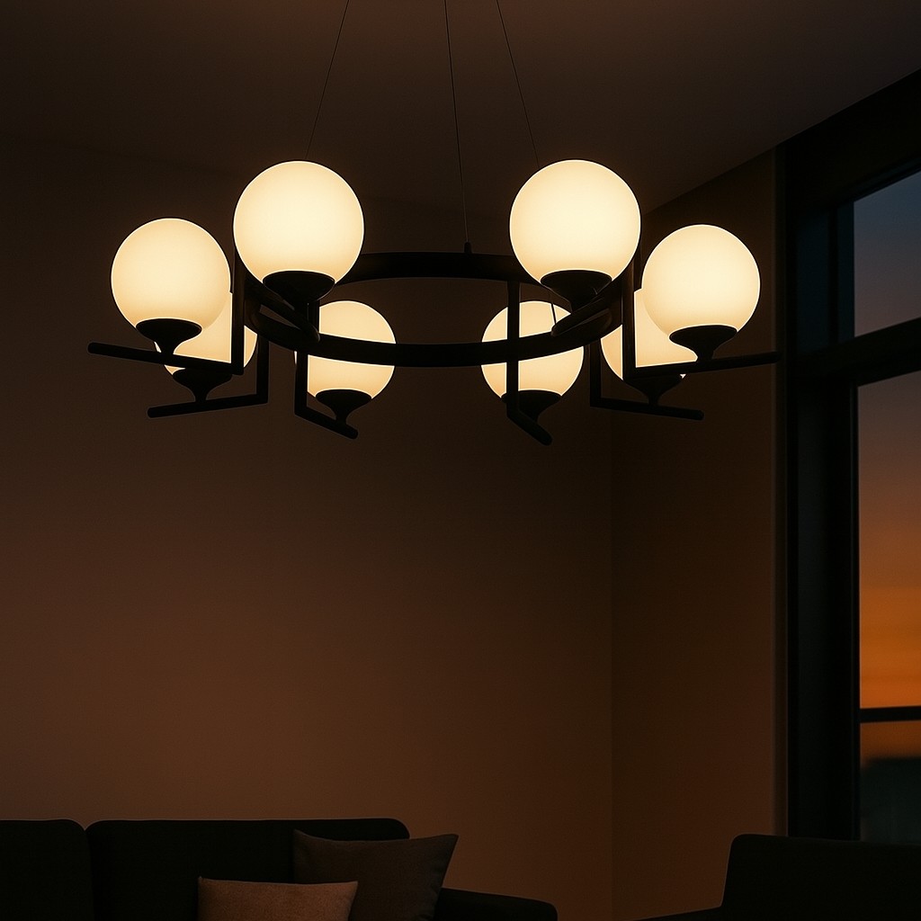 ✅ لوستر مدرن 8 شاخه با طراحی خاص هندسی و ترکیب بدنه مشکی مات و حبابهای شیشهای مات – مناسب فضاهای لوکس و مینیمال