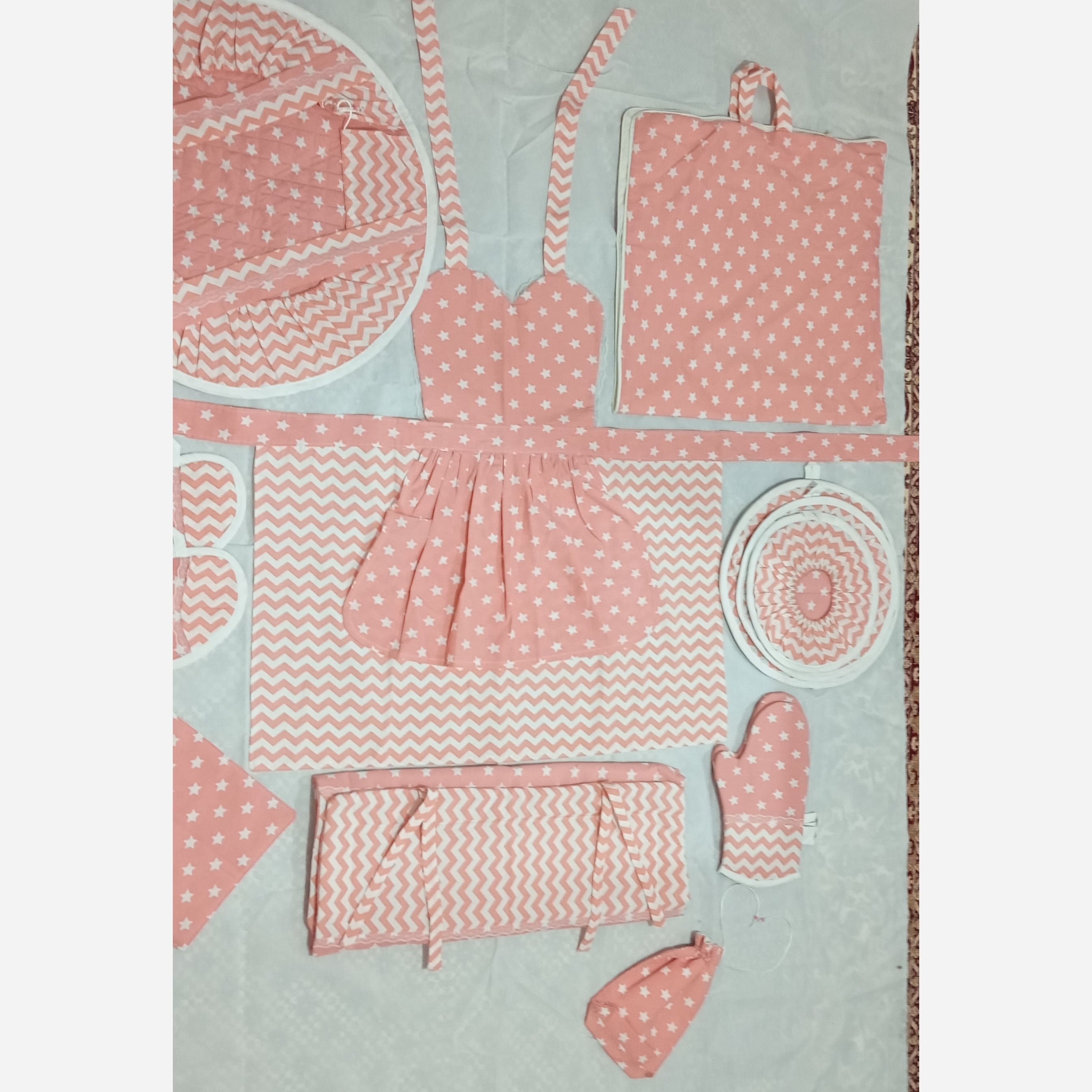 سرویس آشپزخانه پارچه ای عروس به رنگ صورتی مناسب برای جهیزیه عروس و خانوم های خوش سلیقه. 🔥💥💥با قیمت باورنکردنی این سرویس جذاب با پارچه و پشم شیشه با کیفیت و دوخت منظم دوخته شده. تمام تکه ها با دو رنگ پارچه رویی و یه لایه آستر دوخته شده. و همچنین نمگیر ظروف هم با پشم شیشه و مشما دوخت شده و همچنین پیشبند هم مدل قلبی هست که با مشما دوخته شده که مانع از خیس شدن و نفوذ اب بر روی لباس های شما میشود، و تمام تکه ها با نوار تور تزیین شده و زیباییش را چن برابر کرده. پیشبند قلبی یک لایه روی دامن دارم که با ان میتونید دستتونو خشک کنید. سرویس آشپزخانه پارچه ای شیک مون شامل: یک عدد پیشبند قلبی، سه عدد دمکنی، یک عدد کاور قابلمه، یک عدد نمگیر ظروف، دو عدد دستگیره قلبی، دو عدد دستمال آشپزخانه، دو عدد دستکش فر میباشند. 🌞🪡✂️💁♀️