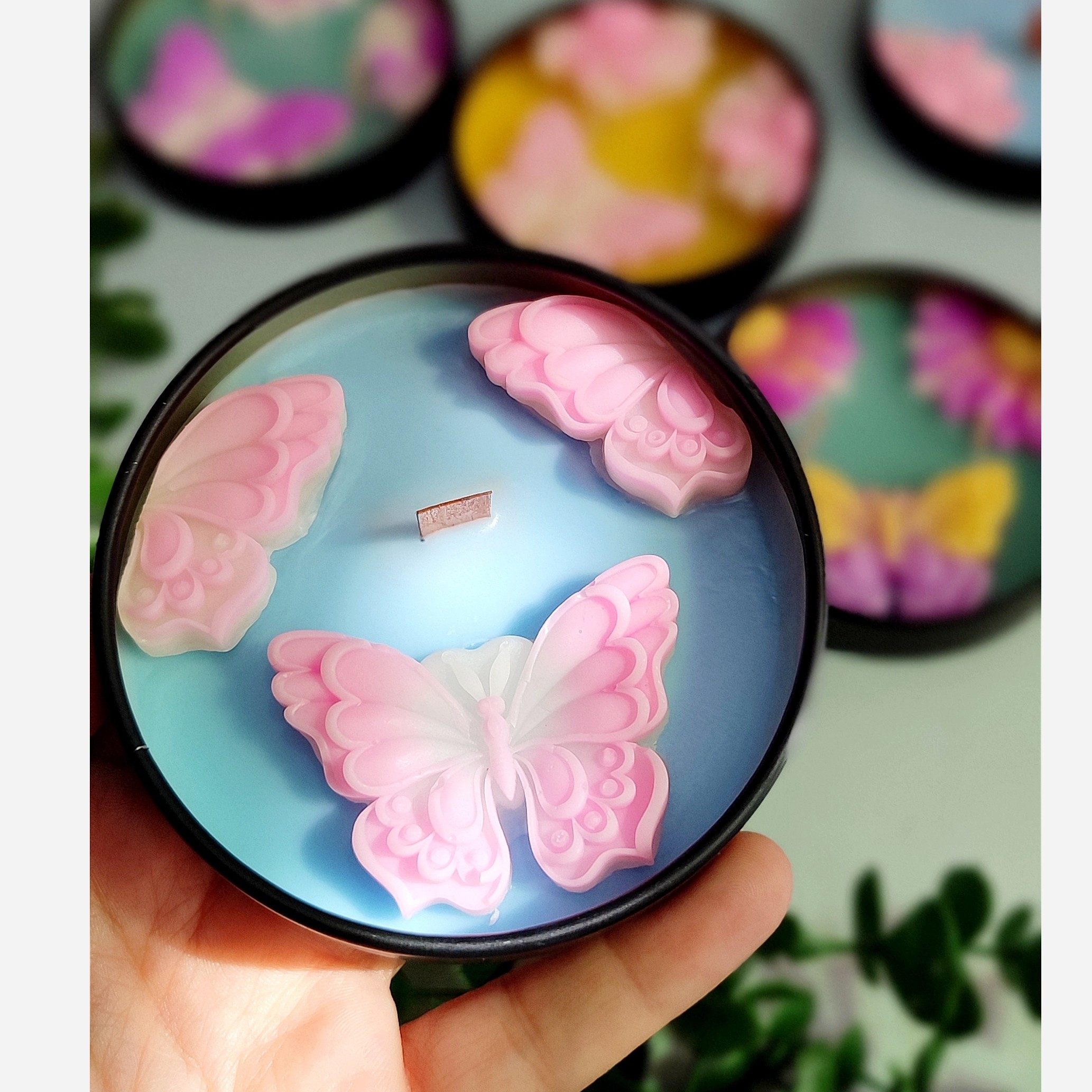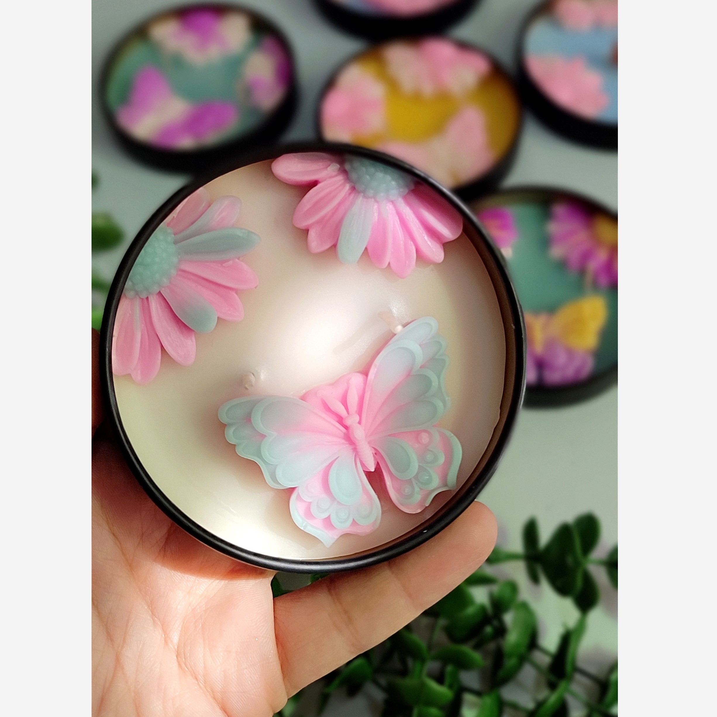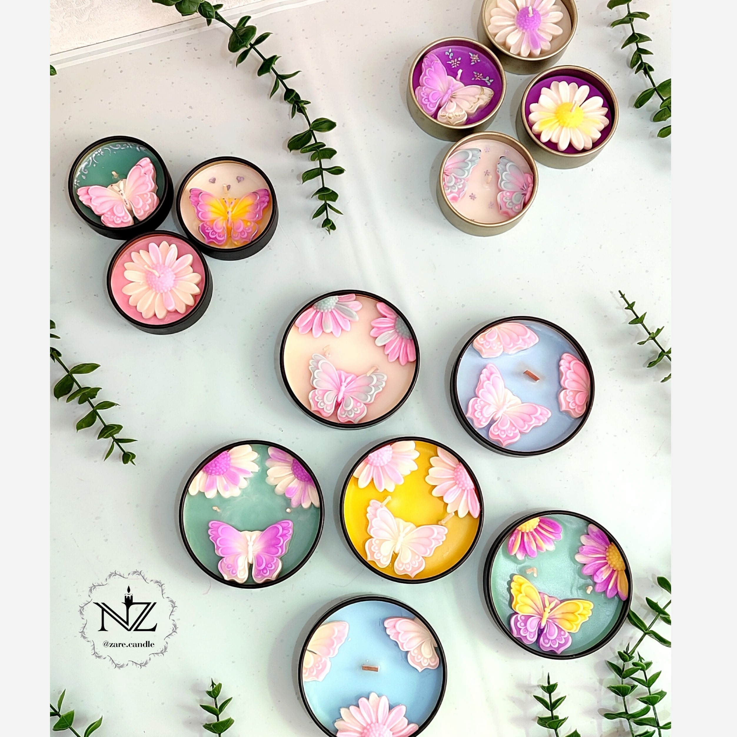 شمع معطر قوطی فلزی طرح پروانه و بابونه با رنگ دلخواه