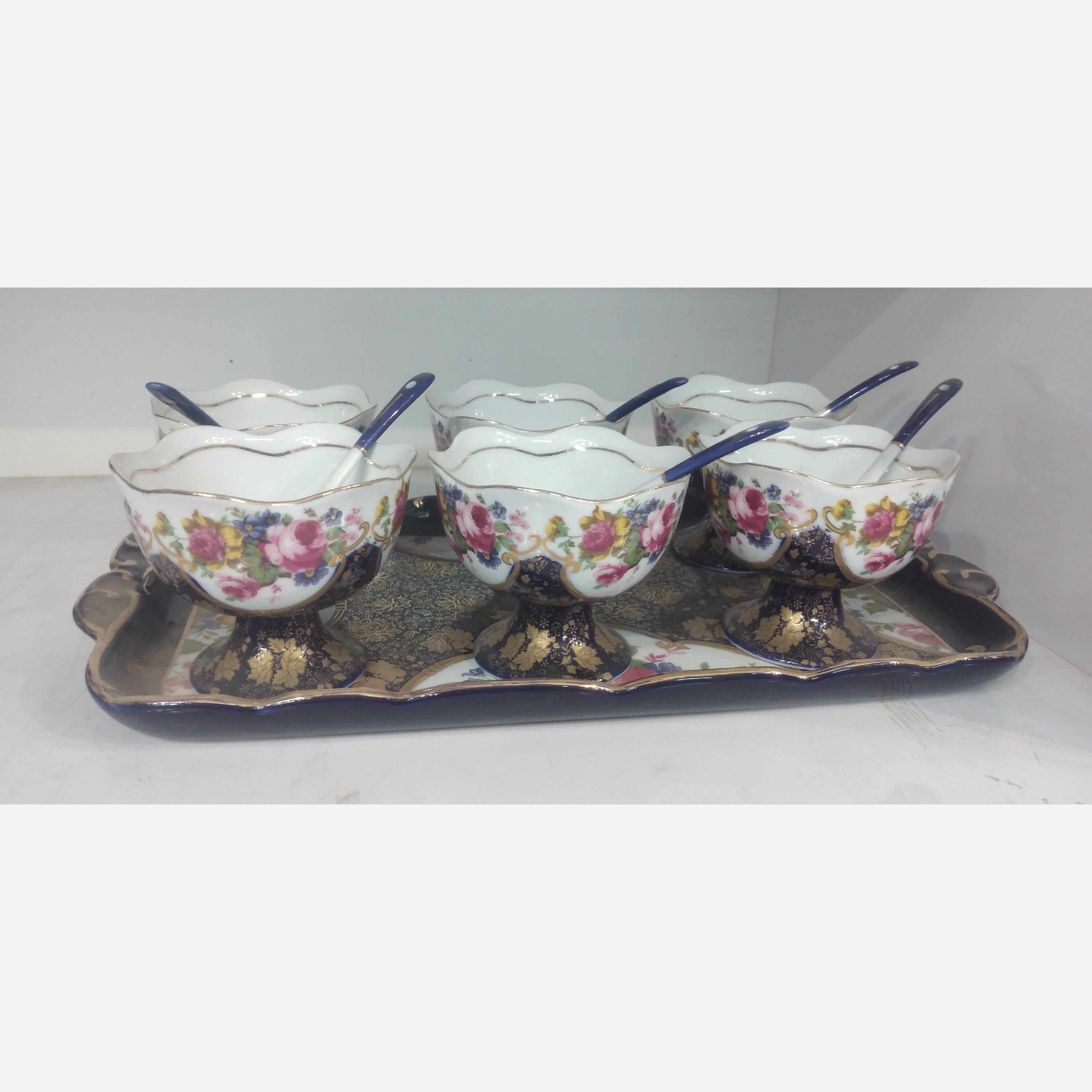 سرویس بستنی/انار خوری سورمه طرح گل 13 پارچه دارای 6 ظرف بستنی خوری و 6 قاشق و 1سینی نو و دارای جعبه و بسیار کمیاب و زیبا