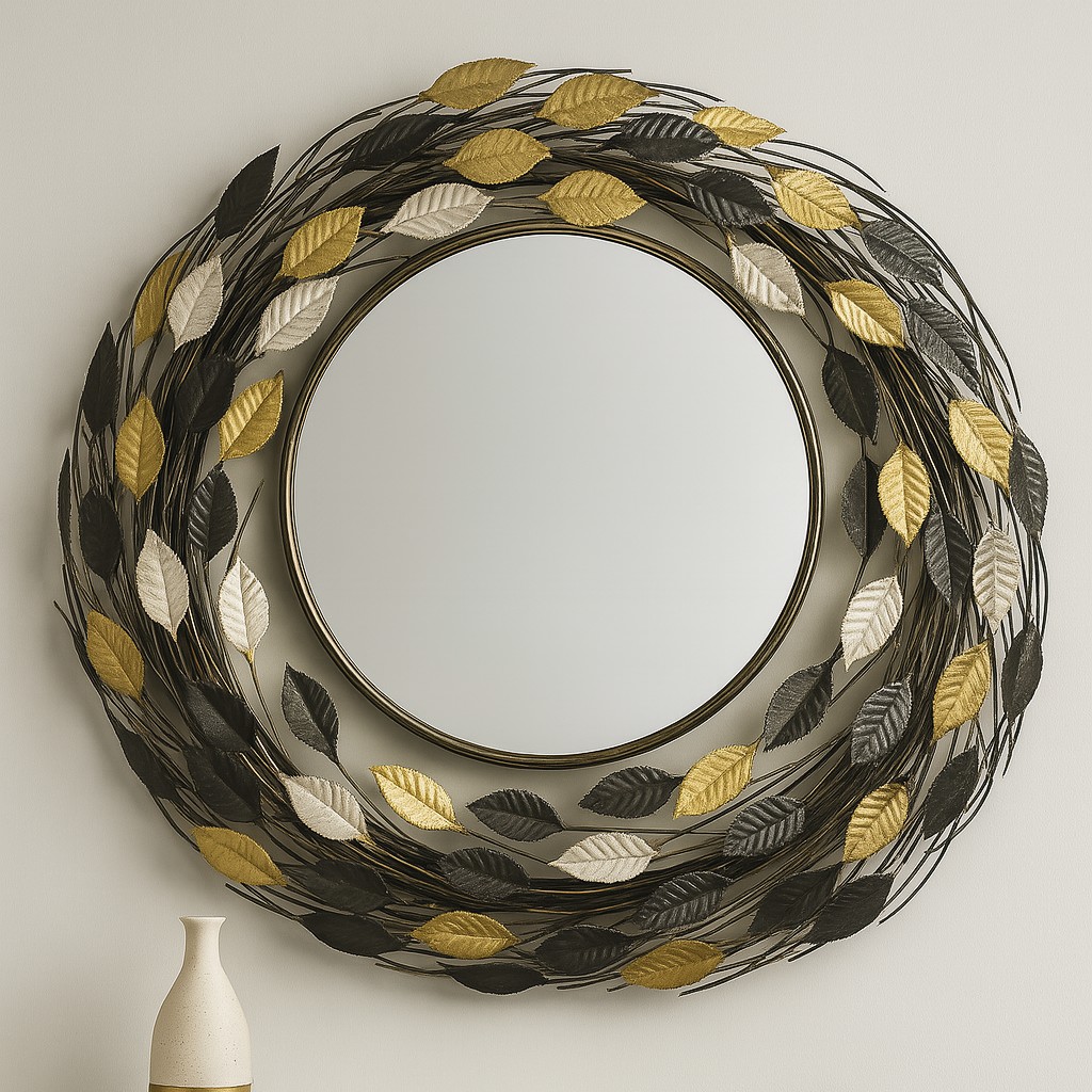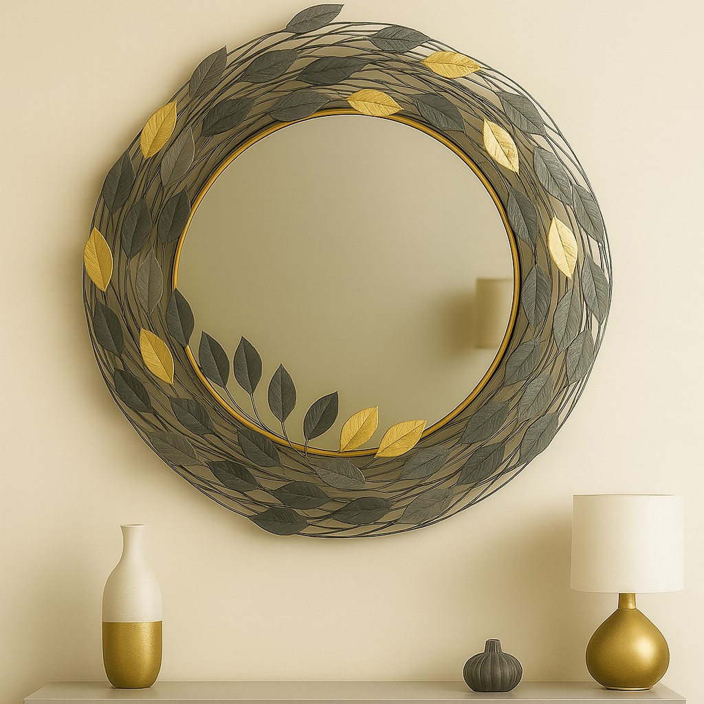آینه دیواری لوکس با طراحی برجسته برگ گل رز در ترکیب رنگ طوسی و طلایی – مناسب دکورهای مدرن
