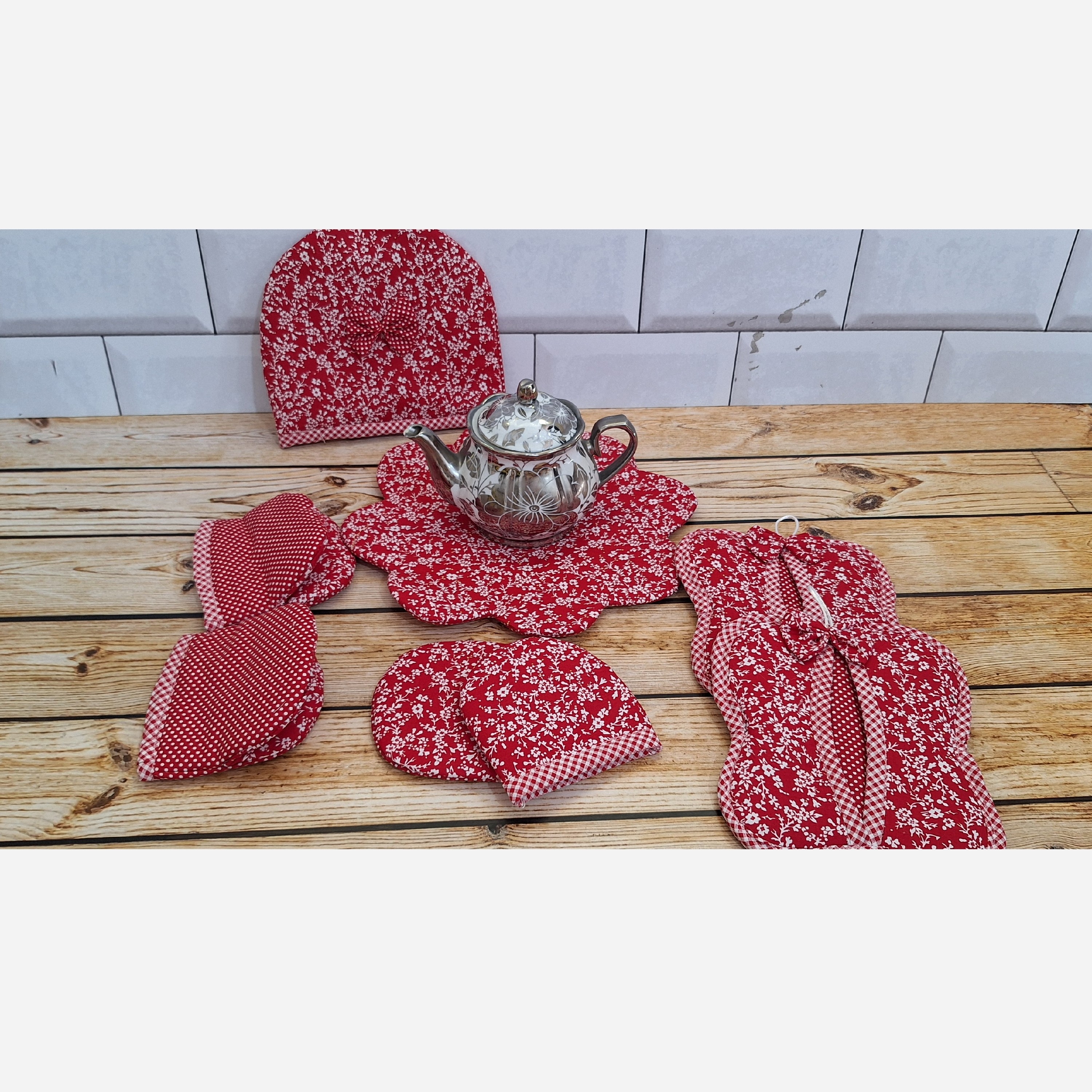 ست آشپزخانه جنس کتان 9تکه شامل پیشبند زیر قابلمه یا زیر قوری دمکن قوری دستگیره پروانه دستگیره چدن دستکش ساق کوتاه به صورت تک هم در غرفه موجوده