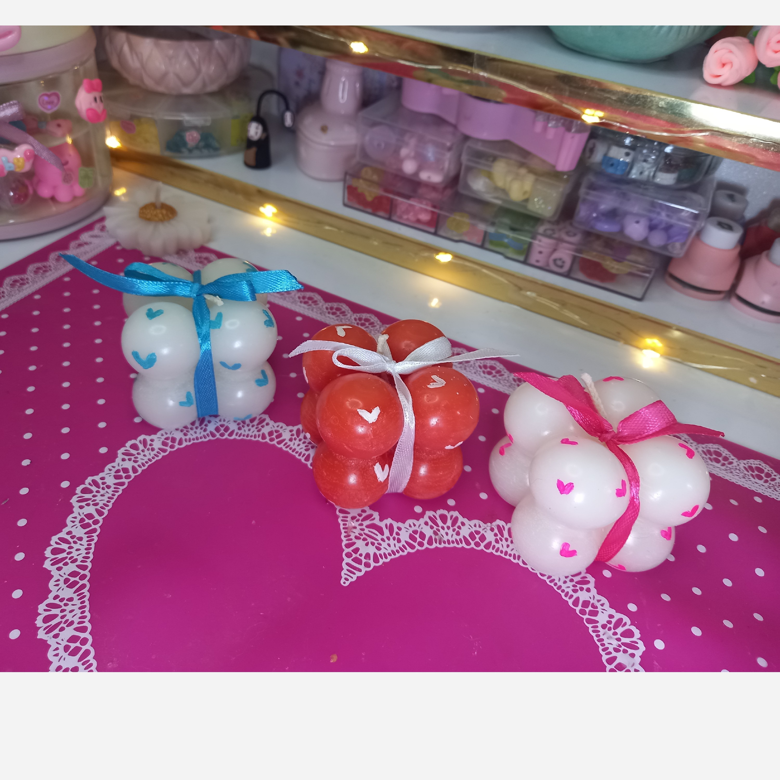 🎀✨ ست شمعهای Ribbon Hearts رسید! 3 عدد شمع روبیک خوشگل با قلبهای دستساز و روبانهای فانتزی 🎨🕯️ یه انتخاب خاص برای کادویی کردن یا دکور عاشقونه توی اتاقتون 💖 کدوم رنگش دلتو میبره؟ 💕 رنگ شمع:قرمز، سفید، آبی، یاسی، صورتی رنگ قلب:صورتی، قرمز، فیروزهای، سفید، سبز، زرد