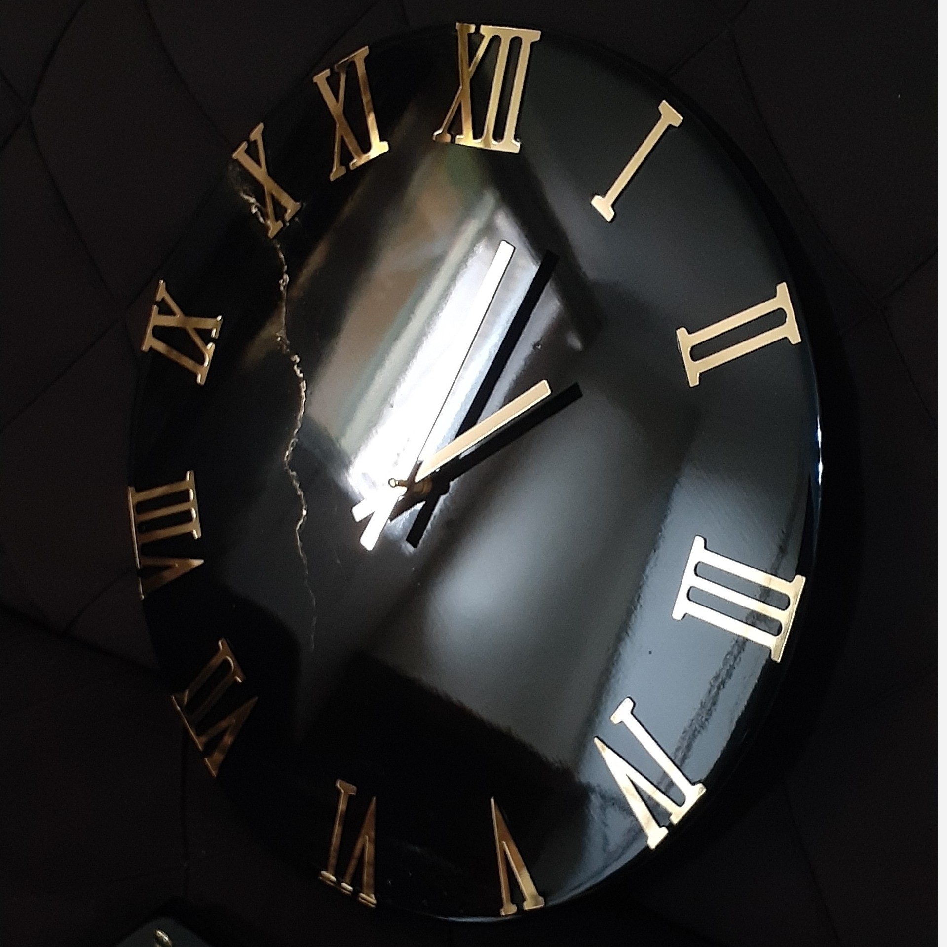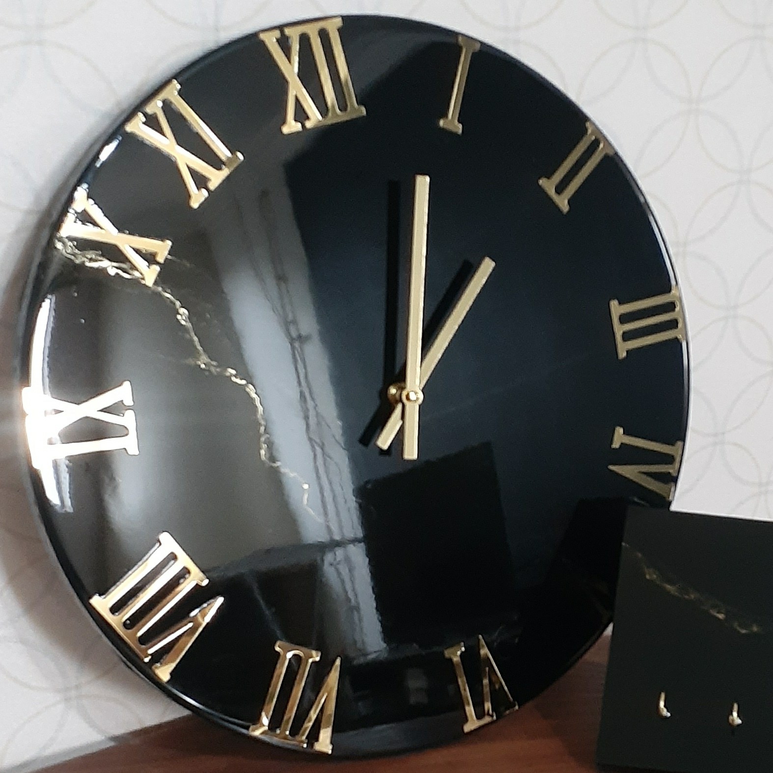ساعت رزینی مشکی با رگه های ورقطلا ابعاد قطر 40 تماما کار دست میباشد عقربه و ساعت مولتی استایل یونانی موتور ارام گرد اماده سازی 5 روزه ارسال با تیپاکس و میباشد
