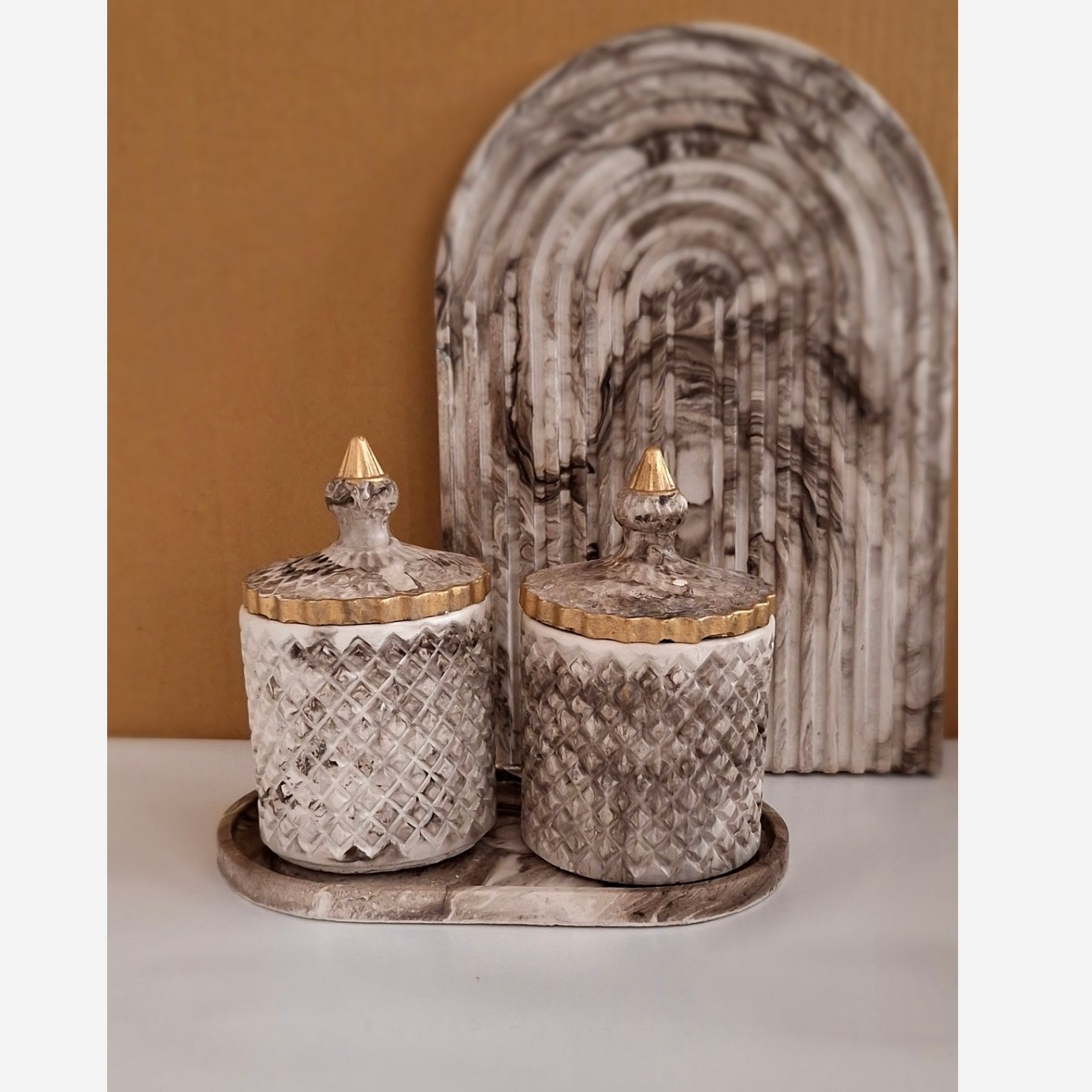 دوعدد بانکه پاسماوری به همراه سینی زیری محصول دو دو رنگ جذاب با بهترین قیمت بازار جنس محصولات سنگ مصنوعی و ضدآب است برای چای و قند ادویه جات نبات و ... مناسب است.