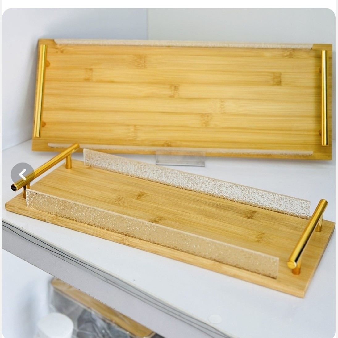 ابعاد 46در 18 و 40در 15 سینیهای چوبی بامبو را با دستههای فلزی طلایی هزینه ارسال این سینیها برای سرو غذا، نوشیدنی یا حمل وسایل مختلف مناسب هستند.