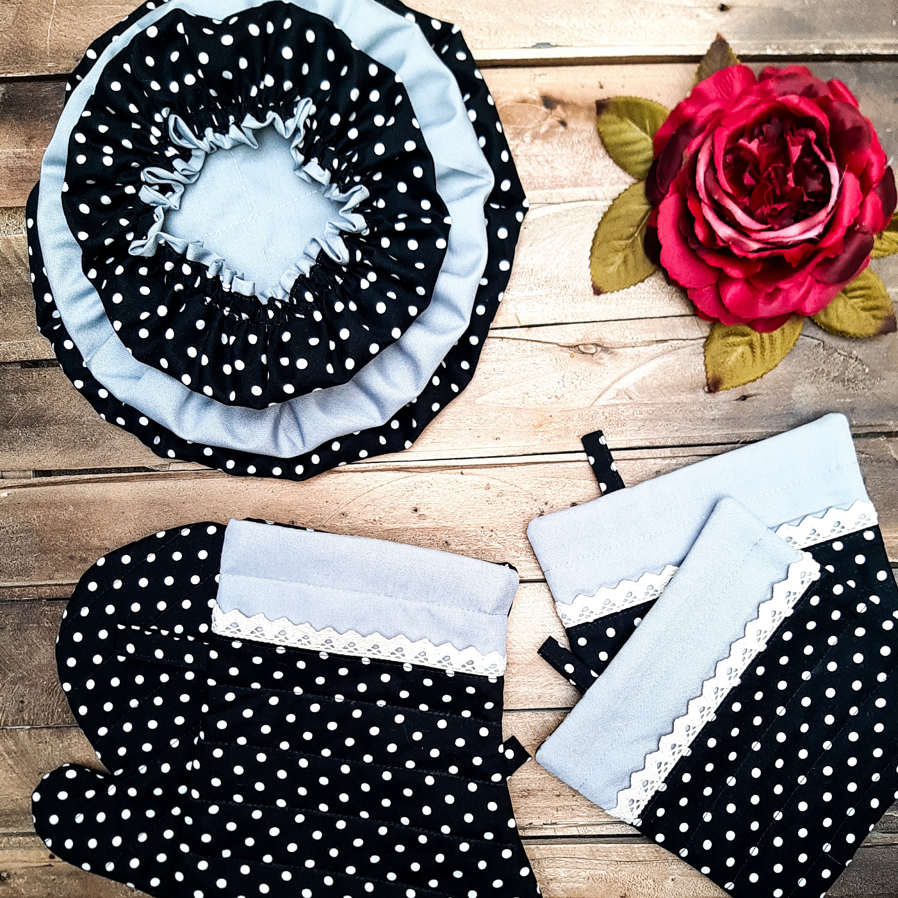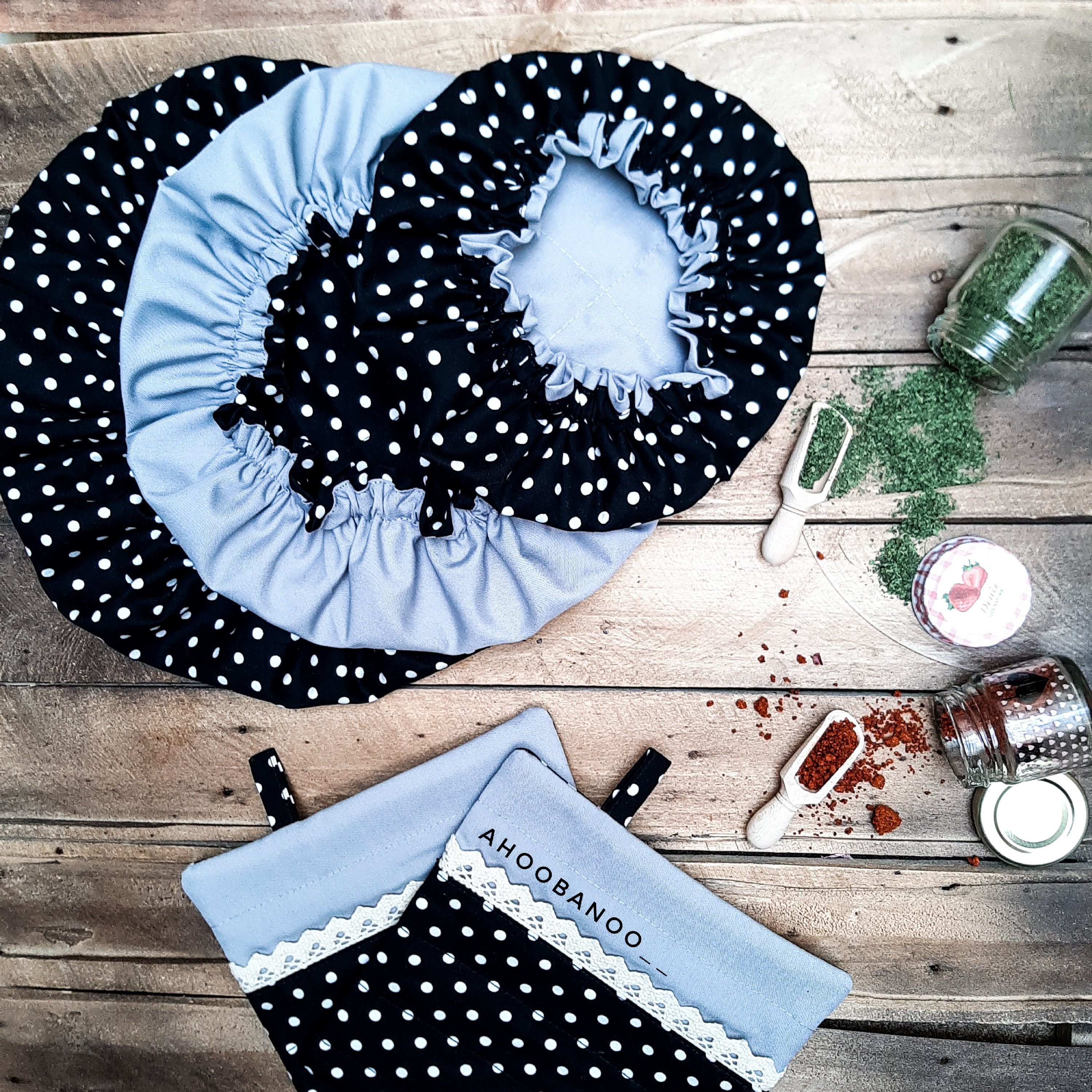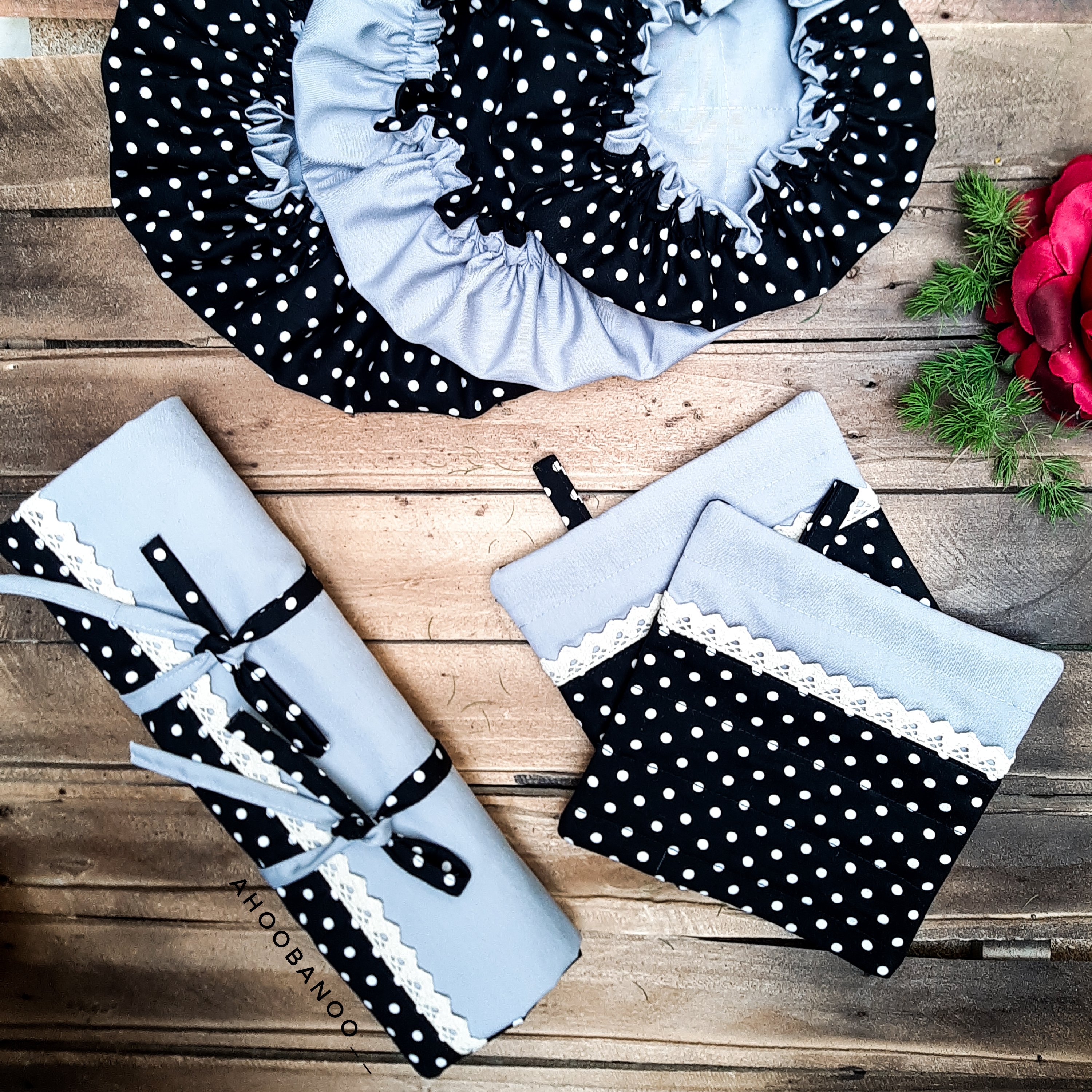 سرویس آشپزخونه 9تیکه شامل: 🌱 سه تا دمکنی 🌱 دوتا دستکش فر 🌱 دوتا دستگیره 🌱 یه پیشبند دامنی چین چینی 🌱 یه نمگیر مخصوص ظروف خیس 🌸 لازم به ذکر است که دمکنیا تماما پارچه است و اصلا از ابر و الیاف استفاده نمیشود لایه میانی پارچه هستش. 🌸دستگیره ها و دستکش فر از نمد و آستر متقال استفاده شده است 🌸نمگیر ظروف از سه لایه پارچه اصلی وپلاستیک و پارچه آبگیر است.