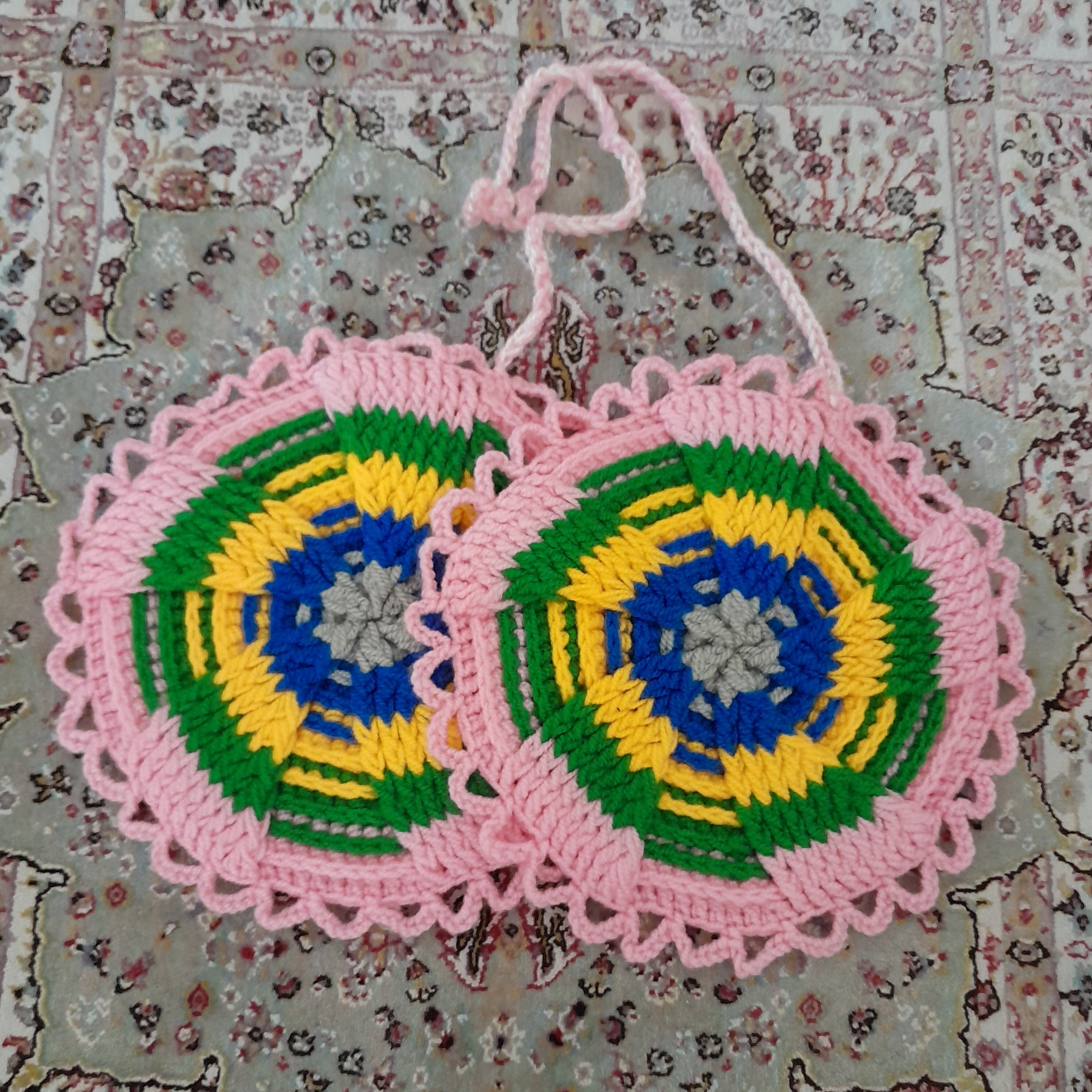 دستگیره ی بافتنی آشپزخانه که به صورت قلاب بافی در دو ابعاد و به صورت ست در رنگ صورتی بافته شده و به عنوان دستگیره، زیر گلدانی، زیر بشقابی کاربرد دارد.