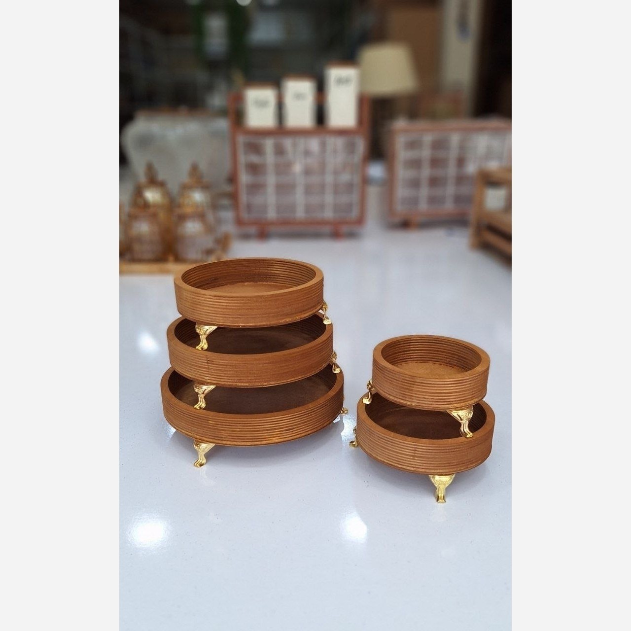 استند چوبی چند طبقه شیک و مدرن، مناسب برای پذیرایی، دکور یا نمایش محصولات. ساختهشده از چوب با کیفیت ضد آب با پایههای فلزی طلایی رنگ ثابت برای جلوهای لوکس و خاص.