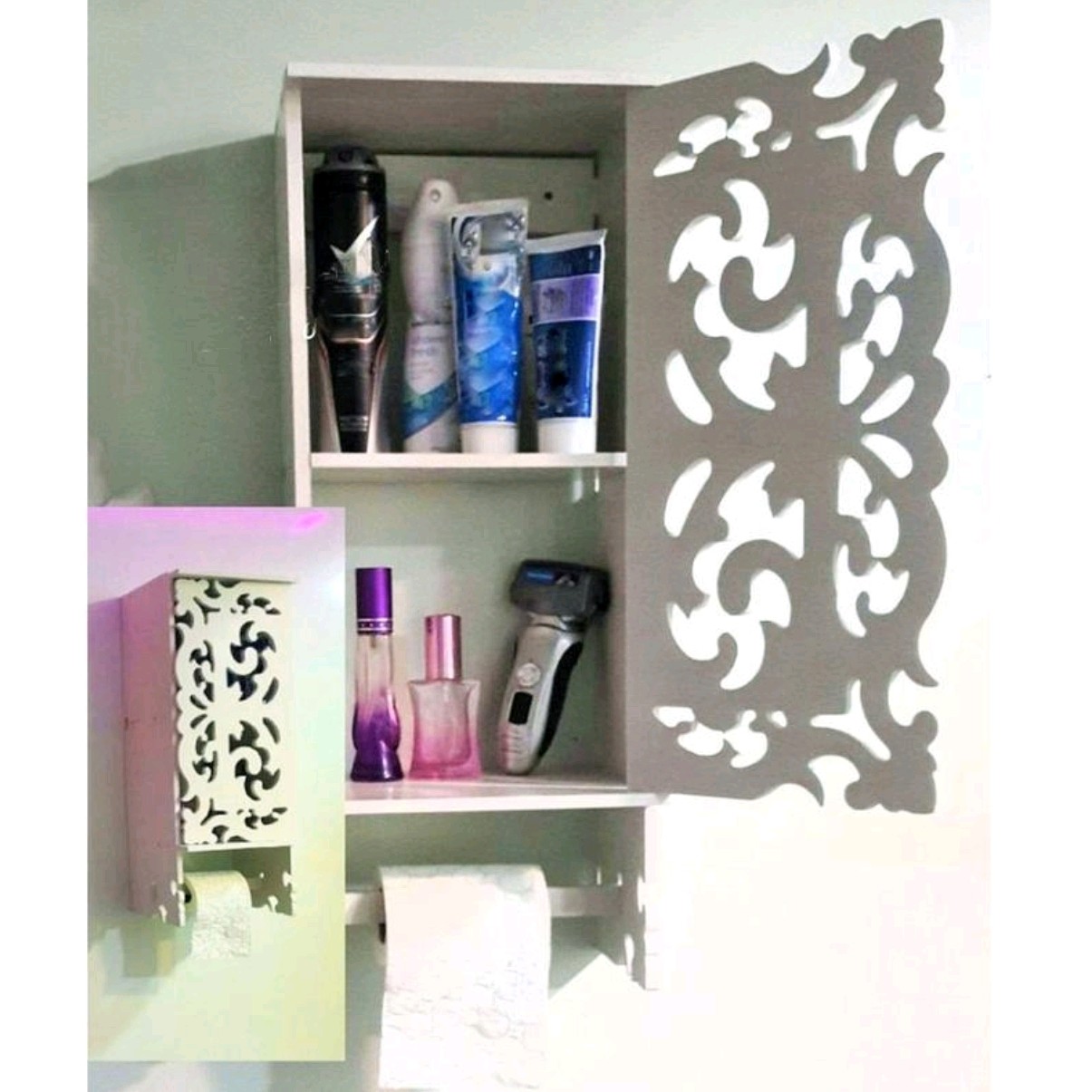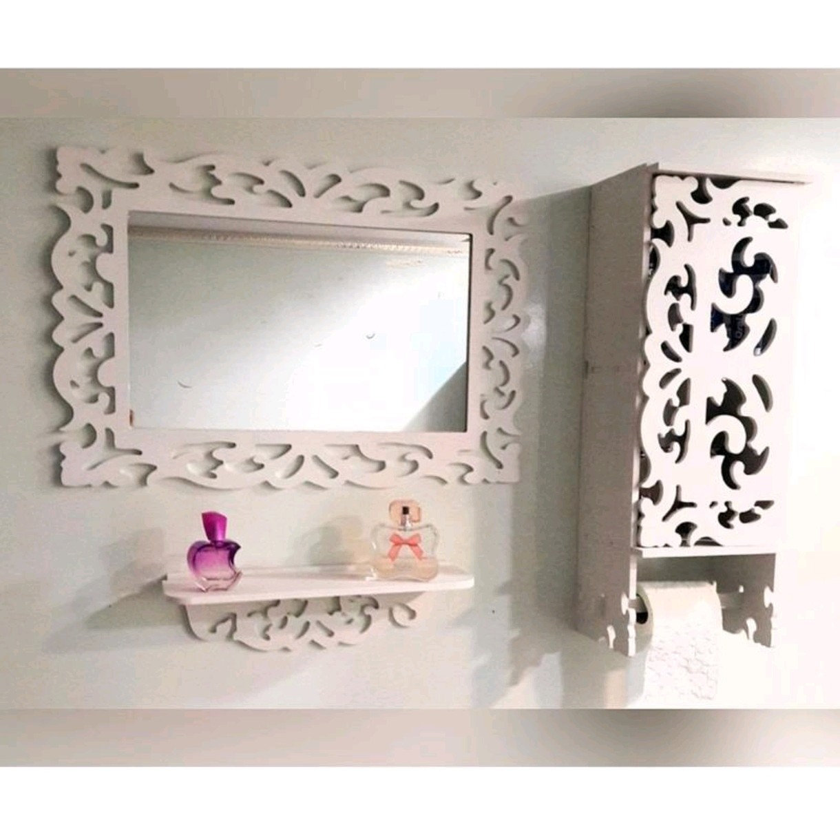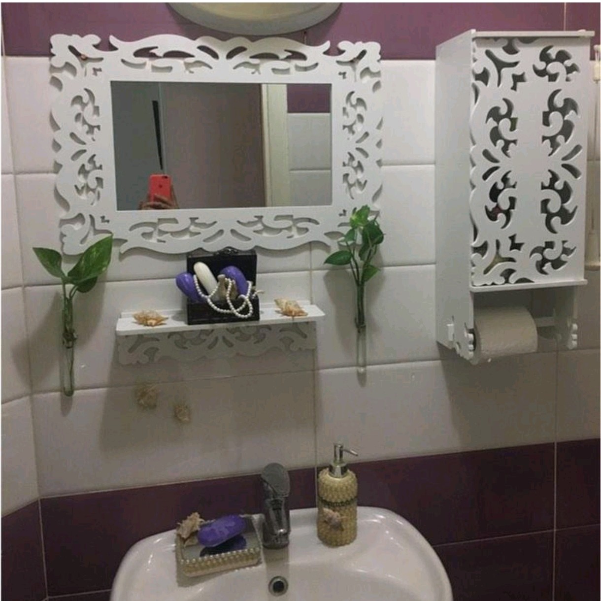 ست کامل 3 تکه ، آینه باکس و شلف پی وی سی طرح نیلوفر که در تصویر مشاهده میکنید در مدل مستطیلی بسیار زیبا تولید و به بازار عرضه گردیده است. بدنه ی PVC این محصول دارای خاصیت ضد آب و استحکام بسیار بالایی می باشد و از این رو شما میتوانید بدون نگرانی از کاهش کیفیت محصول از آن در محیط های مرطوب سرویس بهداشتی حمام همچنین در آرایشگاه ها نیز استفاده نمائید. این است متشکل از آینه شلف دیواری و باکس درب دار است که با مشبک های بسیار زیبا با طرح شمشاد تزئین گردیده است و به شما این امکان را میدهد تا بتوانید از آن علاوه بر کاربرد متداول در محیطهای لوکس جهت تزئین دکوراسیون نیز استفاده نمائید. در قسمت پایینی باکس جای دستمال رولی / حوله تعبیه شده است که نیاز شما را کاملا مرتفع میکند همچنین شلف دیواری کنسول همراه با آیینه به شما در نگهداری انواع لوازم آرایشی لوازم دکوری لوازم شخصی بهداشتی و