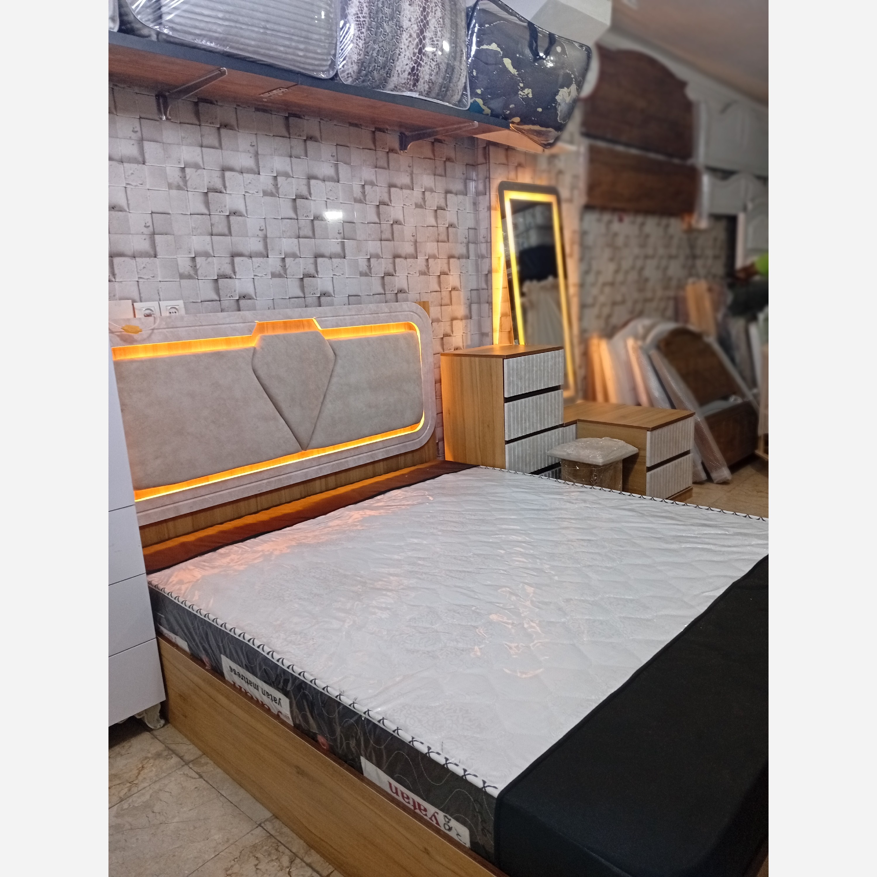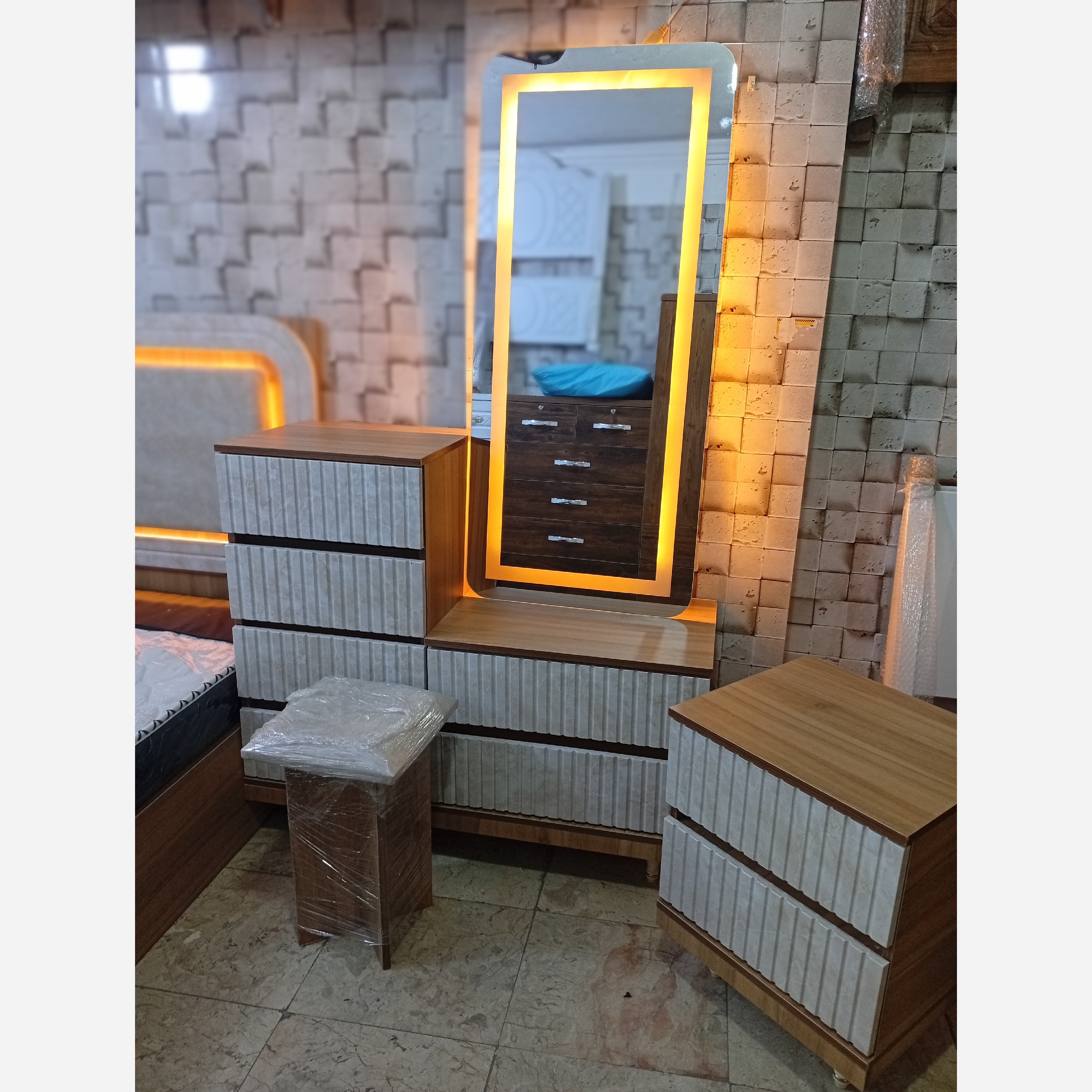 سرویس خواب کامل مدل الماس کارشده از چوب ملامینه و پارچه سرتخت و آینه ال ای دی خور در ابعاد 160×2 دارای میز آرایش آینه صندلی آرایش پاتختی 1عدد و سرتخت کفی تخت