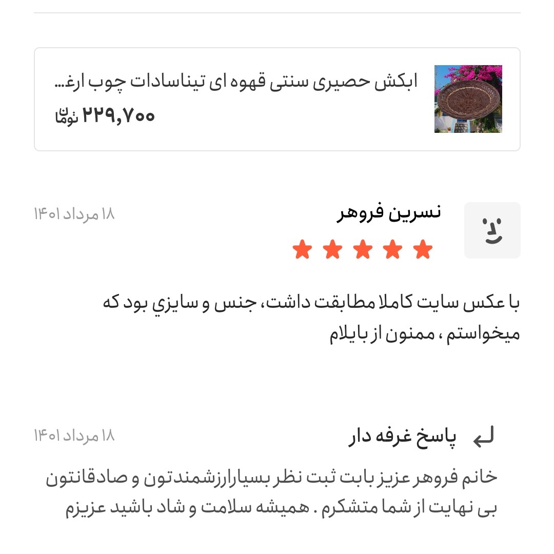 سبد سنتی و حصیری ابکش از دیر باز و از قدیم الایام از سالهای پیش برای ابکشی برنج و شستن میوه و سبزی استفاده میشود ضمنا به عنوان دیوارکوب سنتی هم استفاده میشود که میتواند زینت بخش سالن و پذیرایی باشد . ما کیفیت محصولاتمان را تضمین میکنیم . 💥💥💥💥💥💥💥💥💥💥💥💥💥💥💥💥💢💢نکته مهم از 15 اسفند هر سال تا سیم فروردین سال بعد ،بعد اتمام تعداد محصول در این بازه زمانی بعلت فشردگی سفارش محصول تولید نمیشه اما از 15 اردیبهشت ماه میتونین برای ثبت سفارش محصول اقدام کنید . از صبر و شکیبایی تون بی نهایت سپاسگزارم. 💢💢💥💥💥💥💥💥💥💥💥💥💥💥💥💥💥💥💥 در حا حاضر محصول موجوده و یکی دوروزه ارسال میشه در صورت سفارش برای تعداد محصول حتما باماهماهنگ کنید و در صورت تمایل با شماره 09198522600 تماس بگیرید