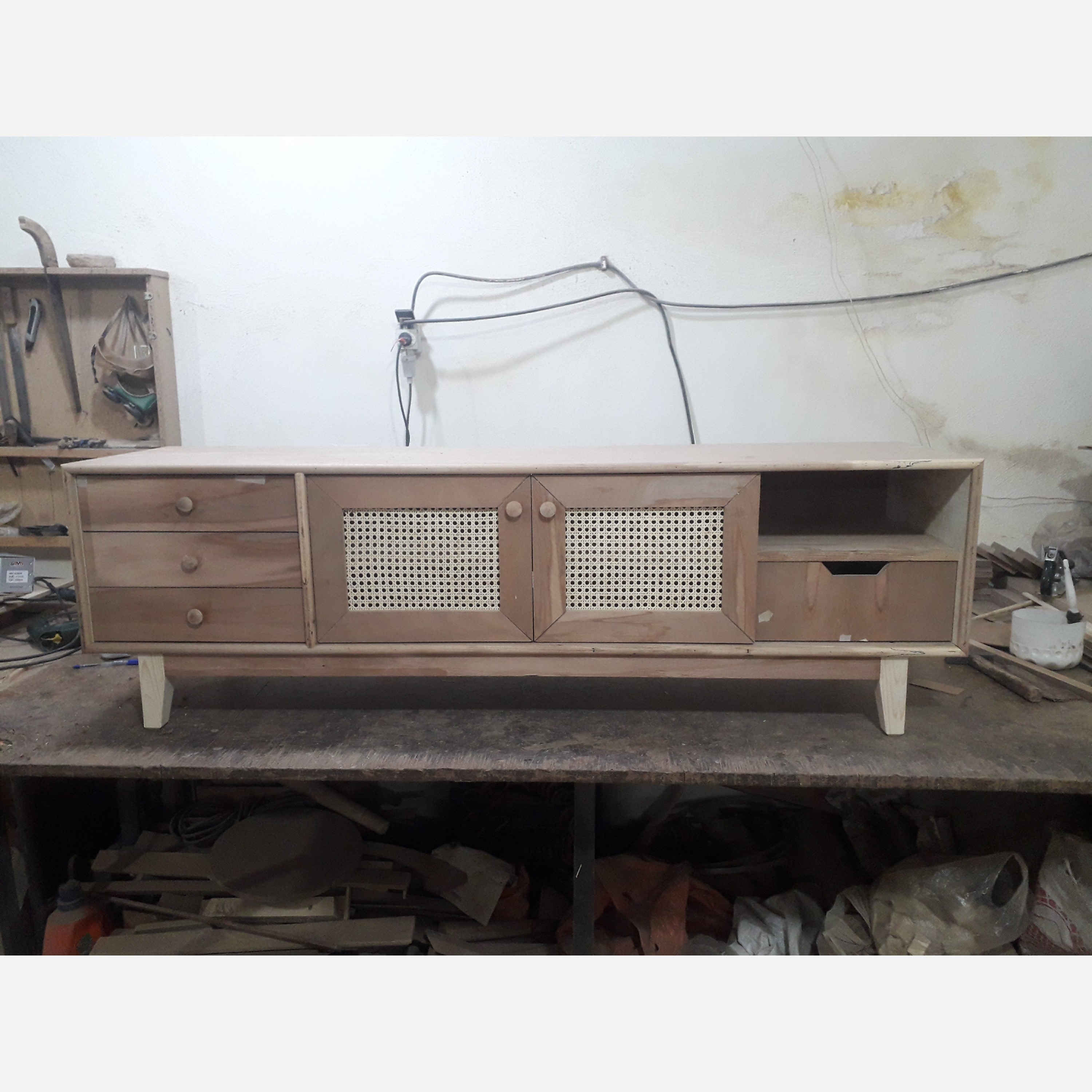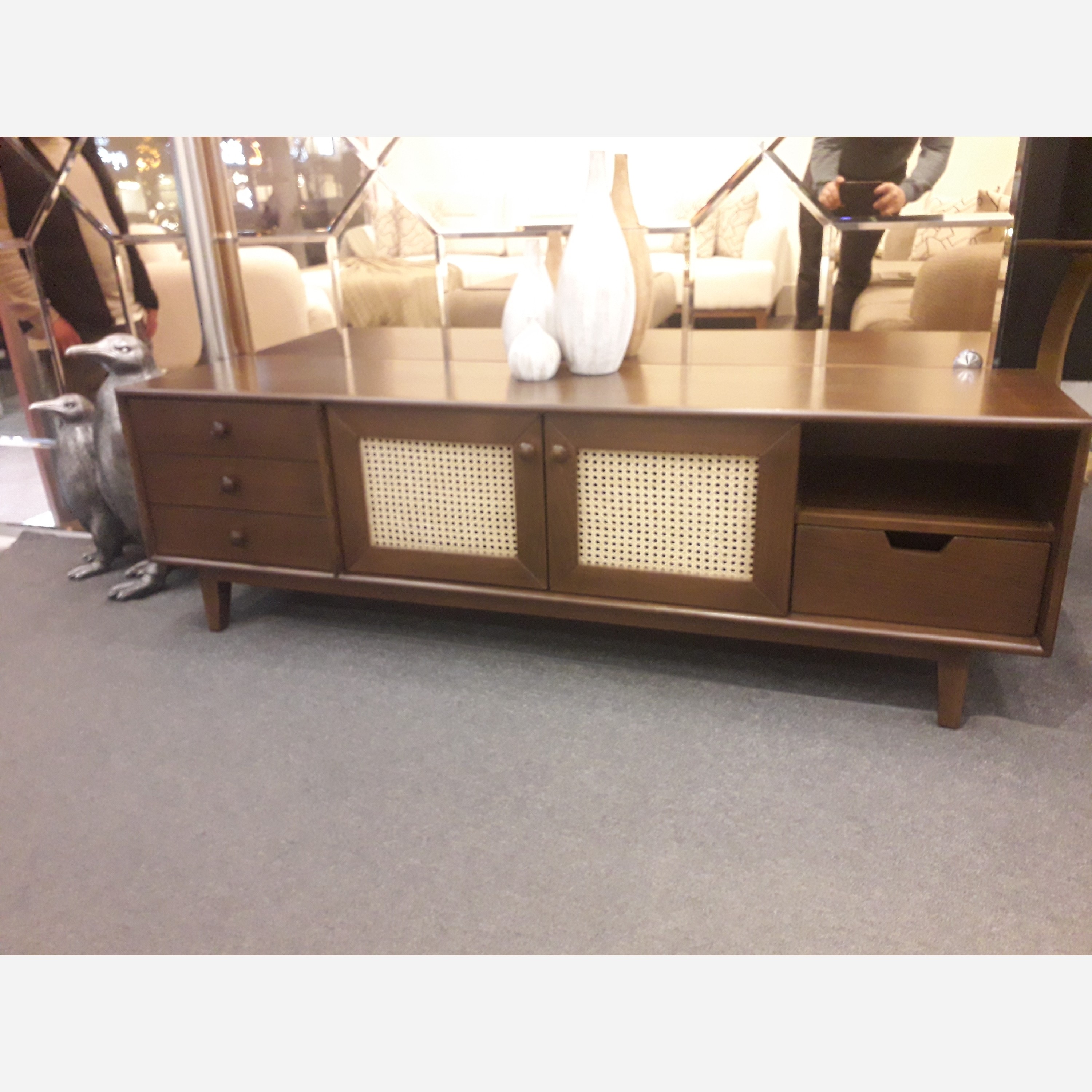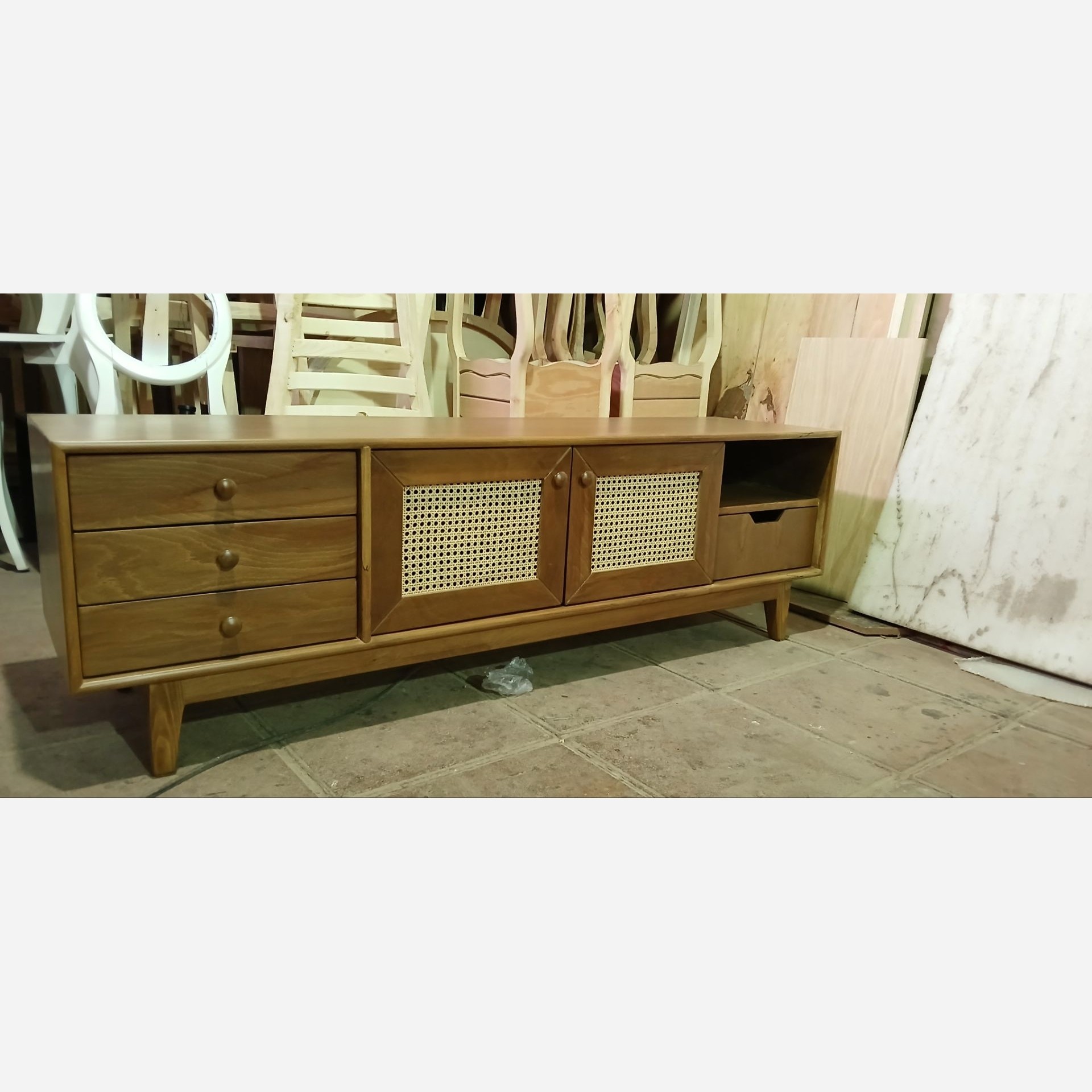 میزتلویزیون حصیری دارای چهارکشو ودودرب کابینتی داخل دربطبقه دارد جنس امدیاف روکش راش و چوب راش یراق آلات درجه یک emeet دررنگبندی و سایزهای مختلف طبق سفارش مشتری ازسایز140تا240 حصیر درجه یک وباکیفیت استفاده شده