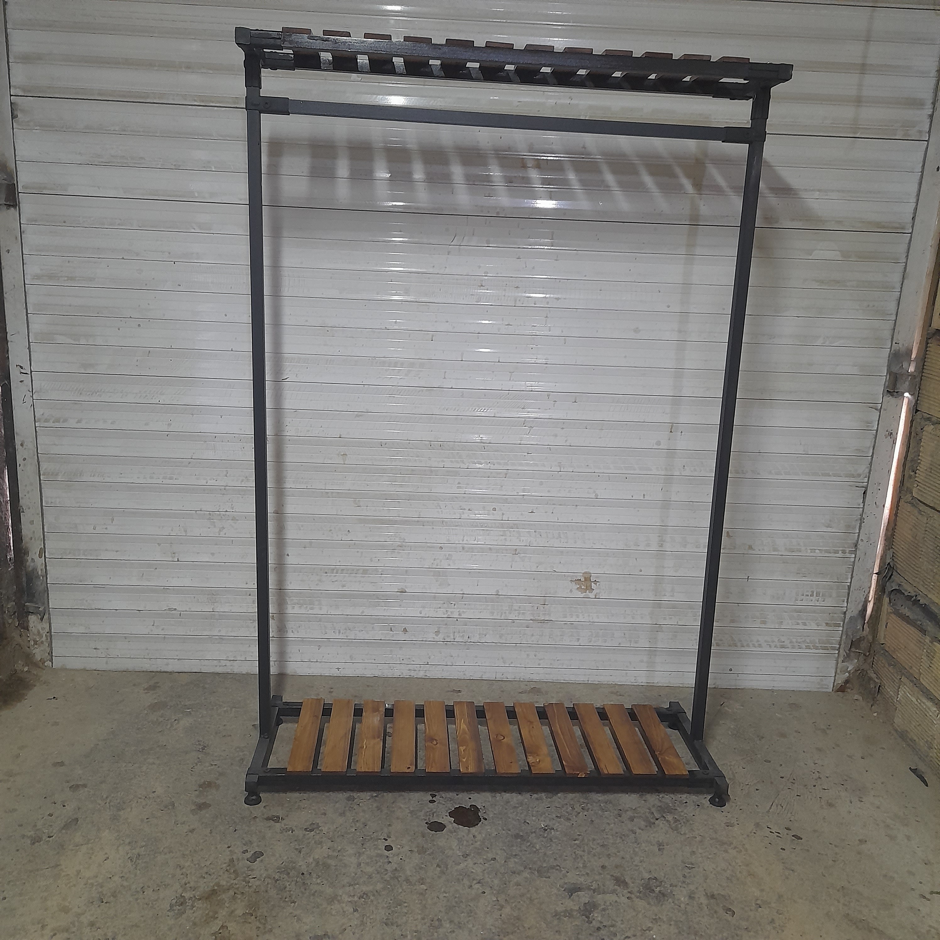 رگال لباس ترکیب فلز و چوب ساخته شده از قوطی آهنی و کف و سقف رگال از چوب روسی ابعاد این نمونه رگال به طول 110 در ارتفاع 150 میباشد ستون های فلزی همه رنگ مشکی میباشد فقط رنگ چوب رنگبندی داره