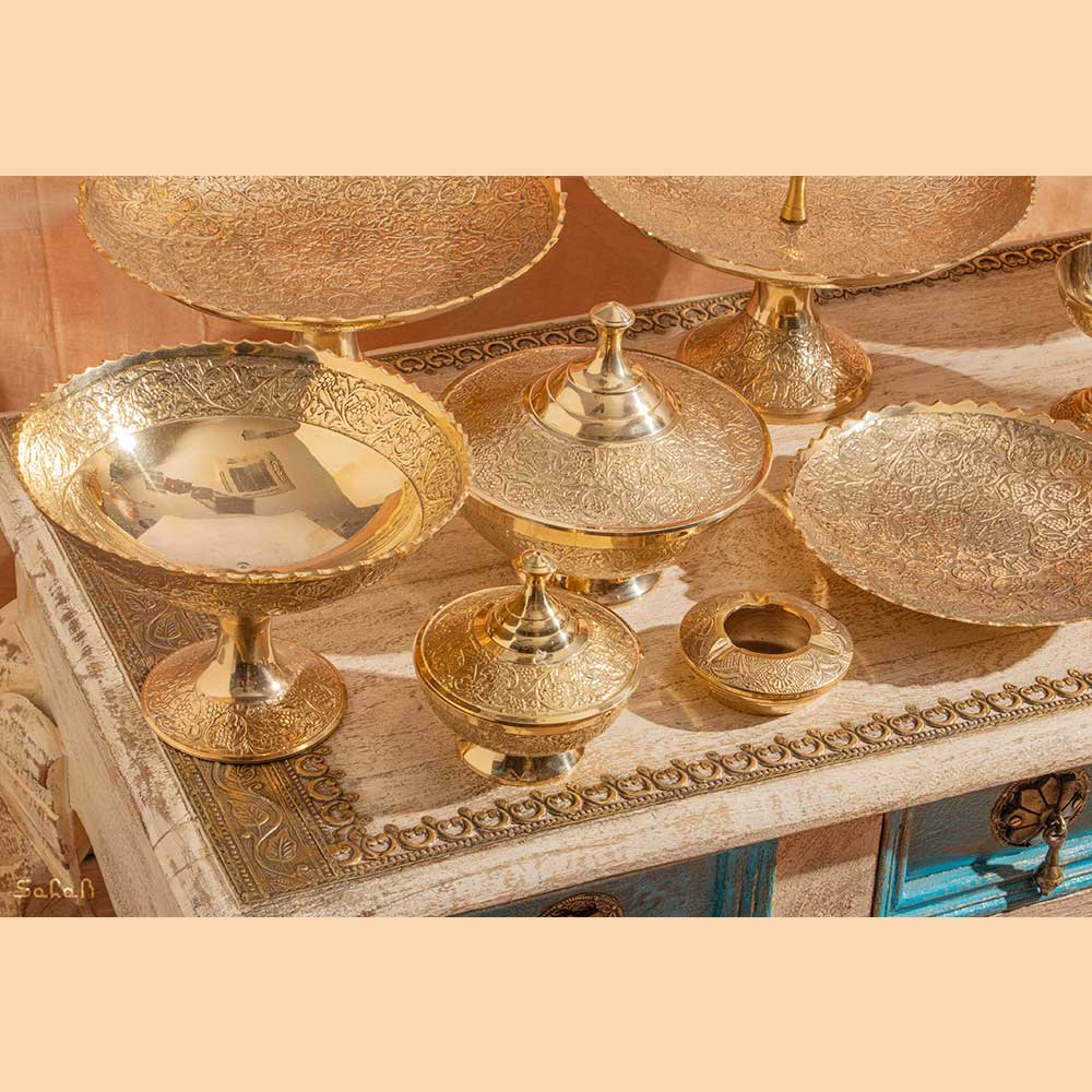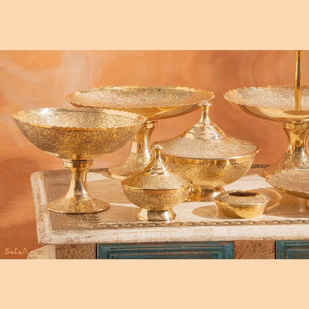 ست 26 پارچه شش نفره برنجی طرح انگوری رنگ طلایی کد: 355 قیمت ست: 80/371/000 تومان برای مشاهده ی ابعاد ، جزئیات و تعداد هر یک از محصولات به قسمت نقد و بررسی مراجعه کنید. برای سوالات بیشتر ، چیدن ست انگور به صورت دلخواه و یا رنگبندی این ست با شماره مجموعه تماس حاصل بفرمایید. شکلات خوری برنجی طلایی کد: 2063 ارتفاع: 15 سانت قطر: 16 سانت قیمت یک عدد: 5/831/000 تومان آجیل خوری برنجی طلایی کد: 2085 ارتفاع: 13 سانت قطر: 19 سانت قیمت یک عدد: 4/919/000 تومان شیرینی خوری برنجی طلایی پایه دار کد: 2064 ارتفاع : 13 سانت قطر : 24 سانت قیمت یک عدد: 5/757/000 تومان قندان برنجی طلایی کد: 2095 ارتفاع: 10 سانت قطر: 10 سانت قیمت یک عدد: 2/099/000 تومان یک عدد میوه خوری پایه دار به همراه شش عدد پیش دستی کد پیش دستی برنجی طلایی ۲۰۶۰ قطر ۱۹ سانت – ارتفاع ۴ سانت کد میوه خوری برنجی طلایی پایه دار ۲۰۵۹ قطر ۲۷ سانت – ارتفاع ۱۳ سانت قیمت یک عدد میوه خوری پایه دار به همراه شش عدد پیش دستی: 24/101/000 تومان یک عدد آجیل خوری به همراه شش عدد کاسه کد آجیل خوری برنجی طلایی ۲۰۶۲ ارتفاع ۱۰ سانت – قطر ۲۴ سانت کد کاسه برنجی طلایی ۲۰۶۱ ارتفاع ۵ سانت – قطر ۱۲ سانت قیمت یک عدد آجیل خوری به همراه شش عدد کاسه: 17/054/000 تومان بستنی خوری پایه دار برنجی طلایی کد : 2091 ارتفاع : 9 سانت قطر : 9 سانت یک ست - شش عدد قیمت شش عدد بستنی خوری: 8/352/000 تومان زیر سیگاری برنجی طلایی کد: 5010 ارتفاع : 3 سانت قطر : 4 سانت قیمت یک عدد: 868 تومان شیرینی خوری برنجی سه طبقه بزرگ کد: 2054 ارتفاع کل: 52 سانت قطر طبقه اول: 24 سانت قطر طبقه دوم: 20 سانت قطر طبقه سوم 15 سانت قیمت یک عدد: 11/390/000 تومان