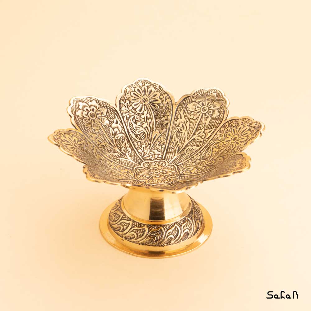 کد کاسه یا خرماخوری برنجی طلایی پایه دار: 3242 اندازه محصول: ارتفاع: 9 سانت قطر دهانه: 17 سانت قیمت: 1/893/000 تومان جنس محصول: آلیاژ برنج