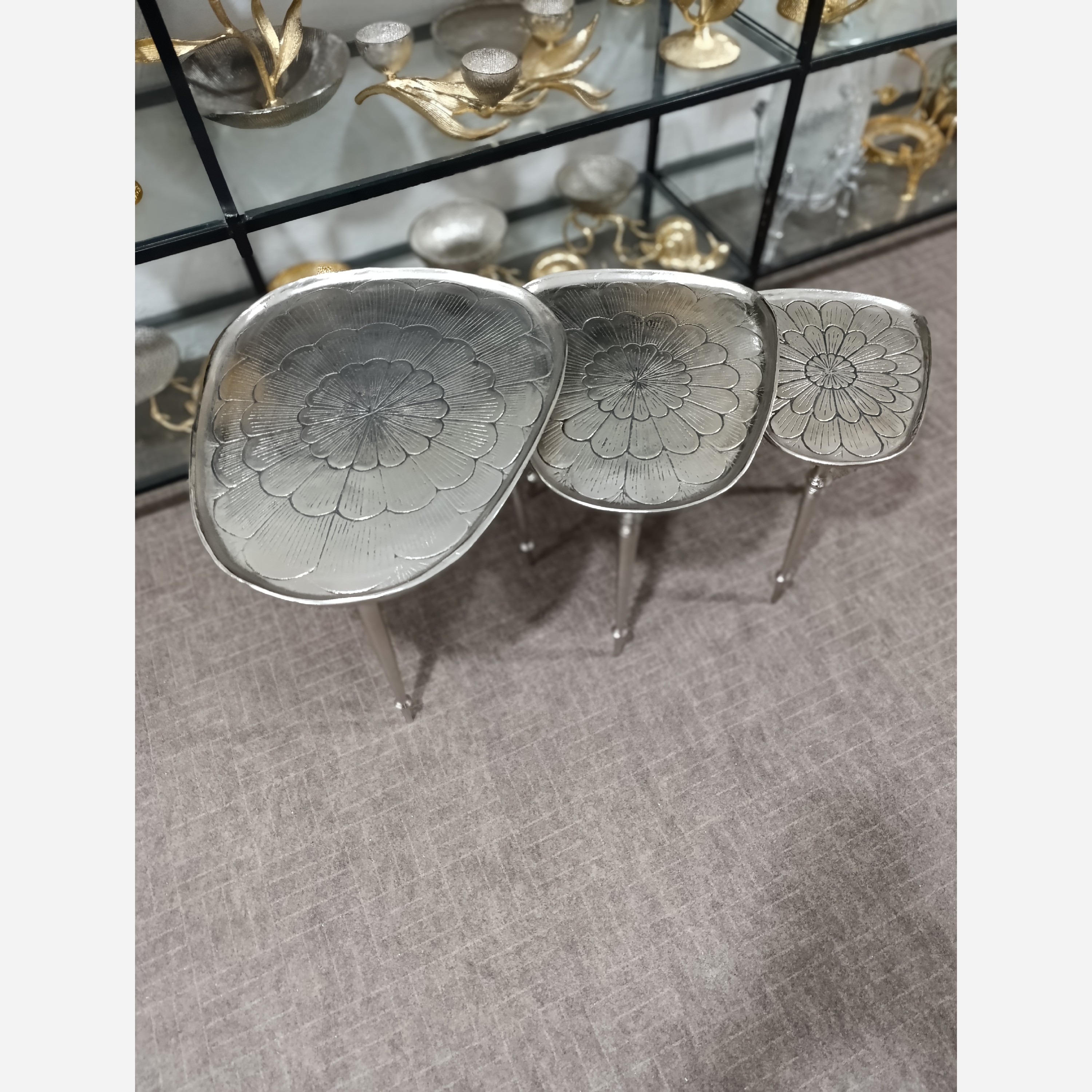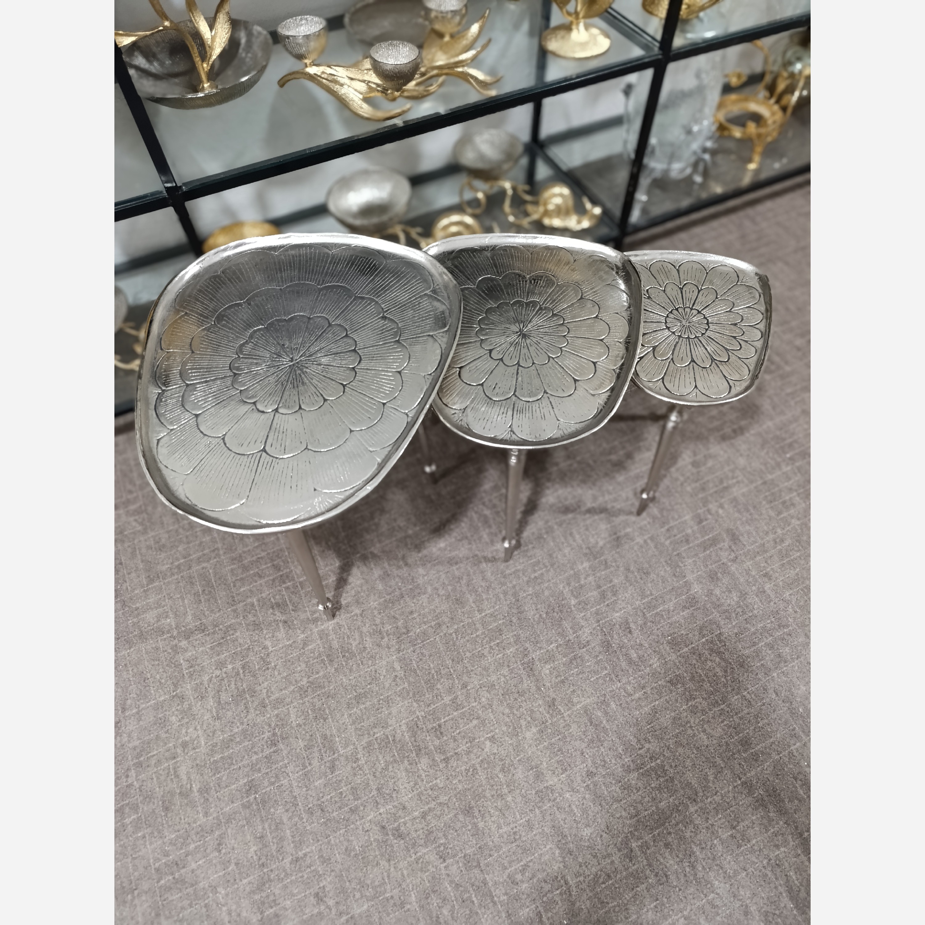 میز عسلی مدل طاووس 3 تکه از جنس آلومینیوم جدیدترین مدل میز عسلی در بازار مناسب برای چیدمان و دیزاین منازل و دفاتر کار از بهترین آلیاژ ،در دو رنگ طلایی و نقره ای آبکاری نیکل و طرح طلا با ضمانت نامه ماندگاری رنگ فروش تکی قیمت فروش عمده