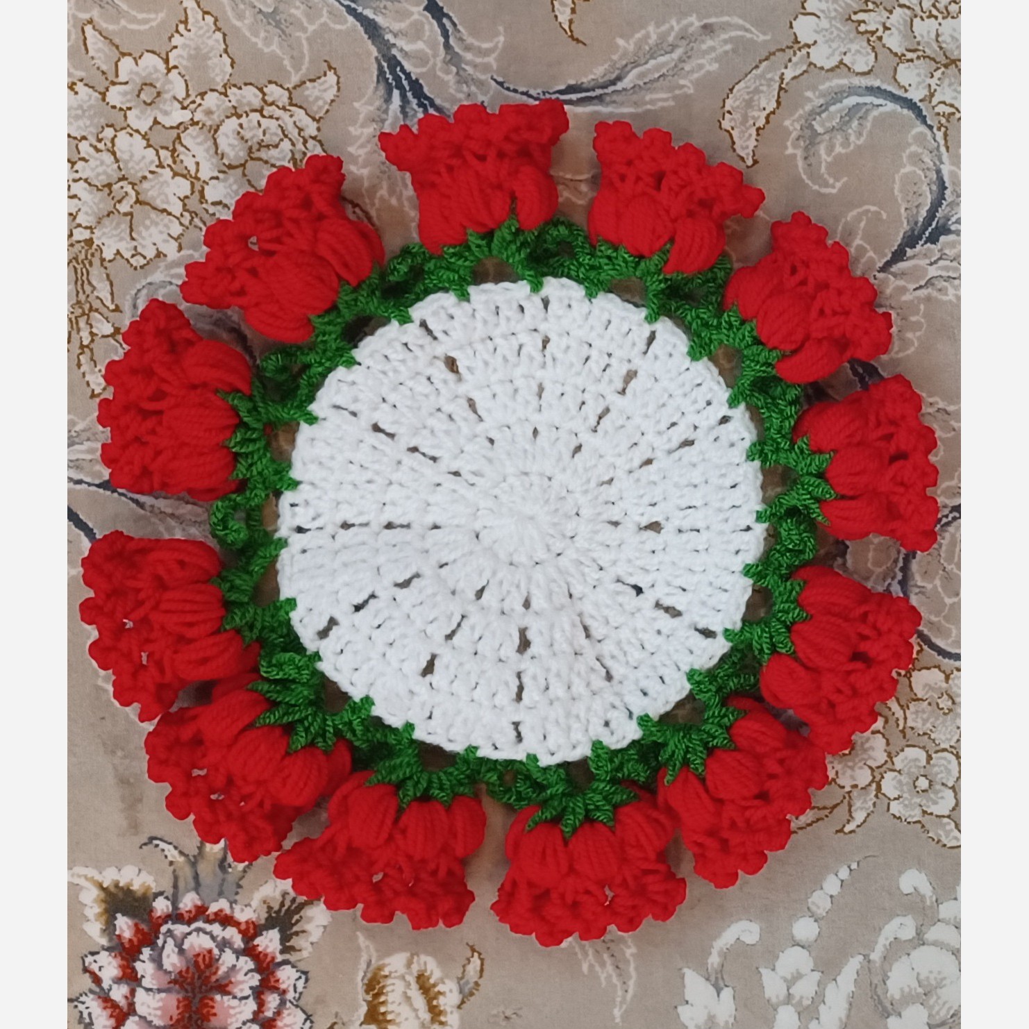 زیر لیوانی بافتنی همچنین قابل استفاده به عنوان دسته گل مناسب برای جهیزیه عروس بافته شده با کاموای درجه یک ایرانی قطر: 12 سانتیمتر قابل سفارش در رنگ و تعداد دلخواه
