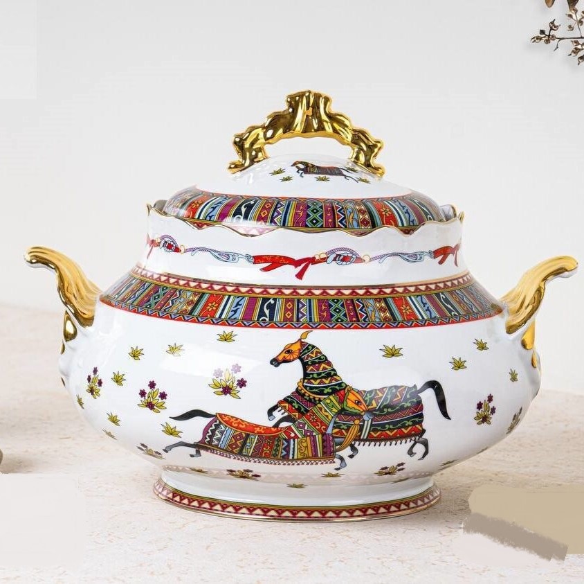 سوپخوری هرمس چینی سوپخوری هرمس چینی یکی از ظروف لاکچری و زیبا برای پذیرایی است که با طراحی منحصربهفرد و کیفیت بالا، به یکی از گزینههای محبوب در دکوراسیون میزهای پذیرایی غذا تبدیل شده است. این محصول از جنس چینی درجه یک ساخته شده و دارای نقوش هنری خیرهکنندهای است که ترکیبی از هنر سنتی و ظرافت مدرن را به تصویر میکشد. طول این ظرف 29.5 و عرض آن 25.5 و ارتفاع آن 15.5 سانتی متر می باشد. این محصول دارای دوام بالا با پخت 1300 درجه و دارای طلای 24 عیار روی بدنه است که کاربران را به خود جذب می کند. ویژگیهای ظاهری و طراحی: سوپخوری هرمس با نقوش رنگارنگ و طرحهای سنتی اسبهای تزئینی که یادآور اصالت فرهنگی هستند، طراحی شده است. حاشیههای طلایی براق و دستگیرههایی با طرح خاص، جلوهای مجلل و لوکس به این ظرف بخشیدهاند. ابعاد این سوپخوری ۲۹.۵×۲۵.۵ سانتیمتر و ارتفاع آن ۱۵.۵ سانتیمتر است که ظرفیت مناسبی برای سرو سوپ یا غذاهای گرم فراهم میکند. طراحی درپوش زیبا و منحصربهفرد آن، علاوه بر حفظ حرارت غذا، زیبایی خاصی به میز پذیرایی میبخشد. کاربردهای سوپخوری هرمس: سرو سوپ و غذاهای گرم: این ظرف ایدهآل برای سرو انواع سوپ، خورشت و غذاهای گرم در مهمانیها و مراسمهای رسمی است. تزئین میز پذیرایی: طراحی زیبا و هنری این محصول بهعنوان یک المان دکوراتیو در میزهای پذیرایی یا بوفهها استفاده میشود. هدیهای مناسب: سوپخوری هرمس به دلیل ظاهر شیک و کیفیت بالای خود، یک هدیه ایدهآل برای مناسبتهایی مانند عروسی، خانهتکانی و تولد است. کاربرد در مراسم رسمی و غیررسمی: این ظرف برای پذیرایی در جشنها، ضیافتها و حتی استفاده روزمره مناسب است. مزایای سوپخوری هرمس: کیفیت بالای مواد اولیه: ساخت از چینی درجه یک باعث دوام و استحکام این ظرف در برابر ضربه و حرارت شده است. طراحی چشمگیر: نقوش زیبا و کلاسیک با ترکیب رنگهای جذاب و جزئیات طلایی، این ظرف را از دیگر ظروف مشابه متمایز میکند. ظرفیت مناسب: اندازه بزرگ و استاندارد، آن را برای سرو مقادیر کافی از غذا ایدهآل میسازد. شستشوی آسان: سطح صیقلی و مواد باکیفیت بهکاررفته در این محصول باعث میشود بهراحتی قابل شستشو باشد. مقاومت در برابر حرارت: این ظرف برای سرو غذاهای داغ و استفاده در محیطهای مختلف مناسب است. چندمنظوره بودن: علاوه بر کاربرد اصلی آن، میتوان از این ظرف برای سرو دیگر غذاها یا حتی بهعنوان وسیلهای دکوراتیو استفاده کرد. سخن آخر سوپخوری هرمس چینی نه تنها یک ظرف پذیرایی بلکه نمادی از زیبایی و هنر است که هر میزی را به یک شاهکار هنری تبدیل میکند. این ظرف با طراحی منحصربهفرد و کیفیت عالی، انتخابی هوشمندانه برای افرادی است که به زیبایی و کارایی در کنار هم اهمیت میدهند. اگر به دنبال محصولی هستید که هم در مهمانیهای رسمی و هم در استفاده روزمره بدرخشد، سوپخوری هرمس بهترین گزینه است. این ظرف تجربهای متمایز از پذیرایی را برای شما و مهمانانتان به ارمغان میآورد. فروشگاه با فراهم کردن جدیدترین و کاربردی ترین وسایل شخصی و وسایل خانه و آشپزخانه سعی بر لذت بخش کردن لحظات آشپزی شما دارد. شما عزیزان براحتی می توانید جدیدترین لوازم خانه، آشپزخانه و لوازم کاربردی را در سایت ما www.sartashome.com یا فروشگاه مجازی ما در اینستاگرام به آدرس sartaas_home@ مراجعه و خرید خود را در امنیت کامل ثبت و کوتاه ترین زمان درب منزل تحویل بگیرید.