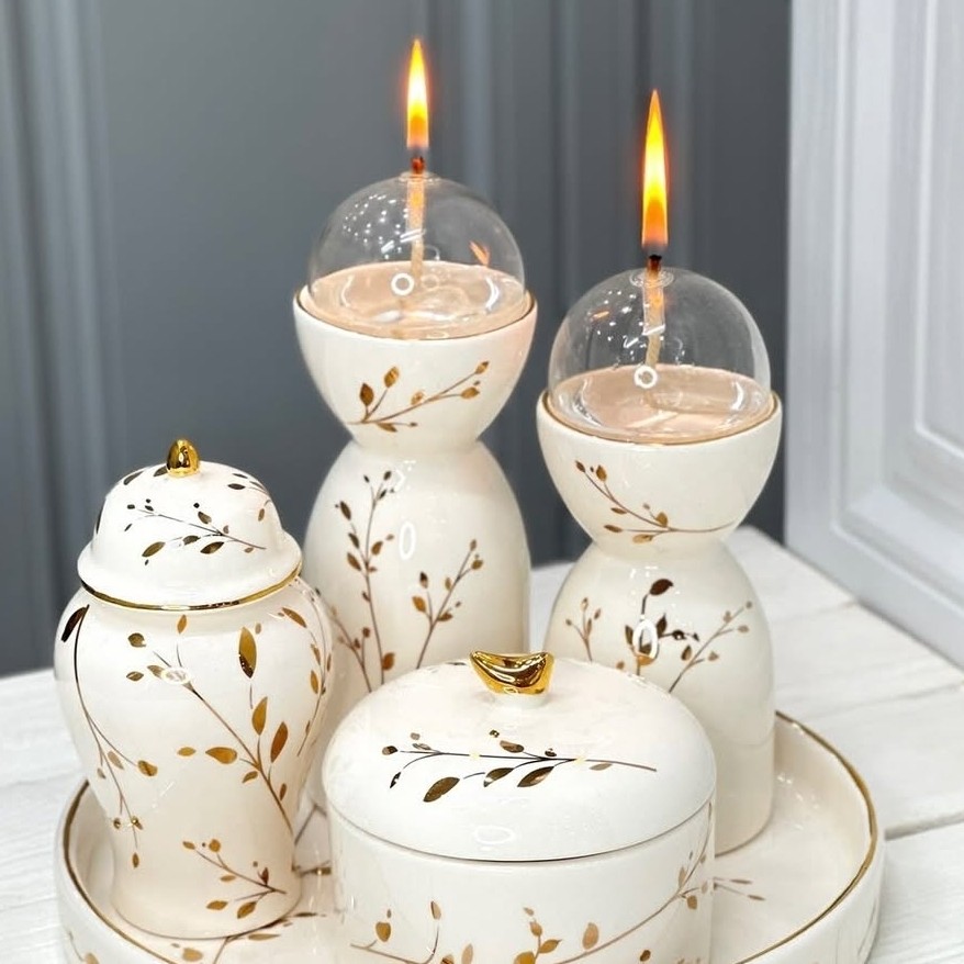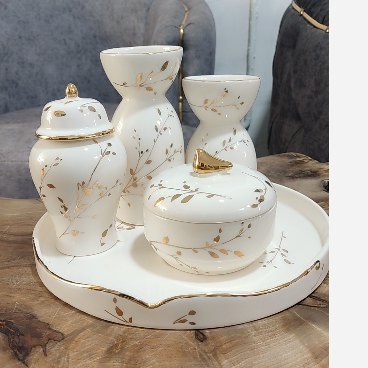 ،ست دکوری سرامیکی شاخه طلایی،ست شمعدون سرامیکی شاخه طلا،جینجرجار شاخه طلایی،شمعدون مبلمونسرا مدل 273235