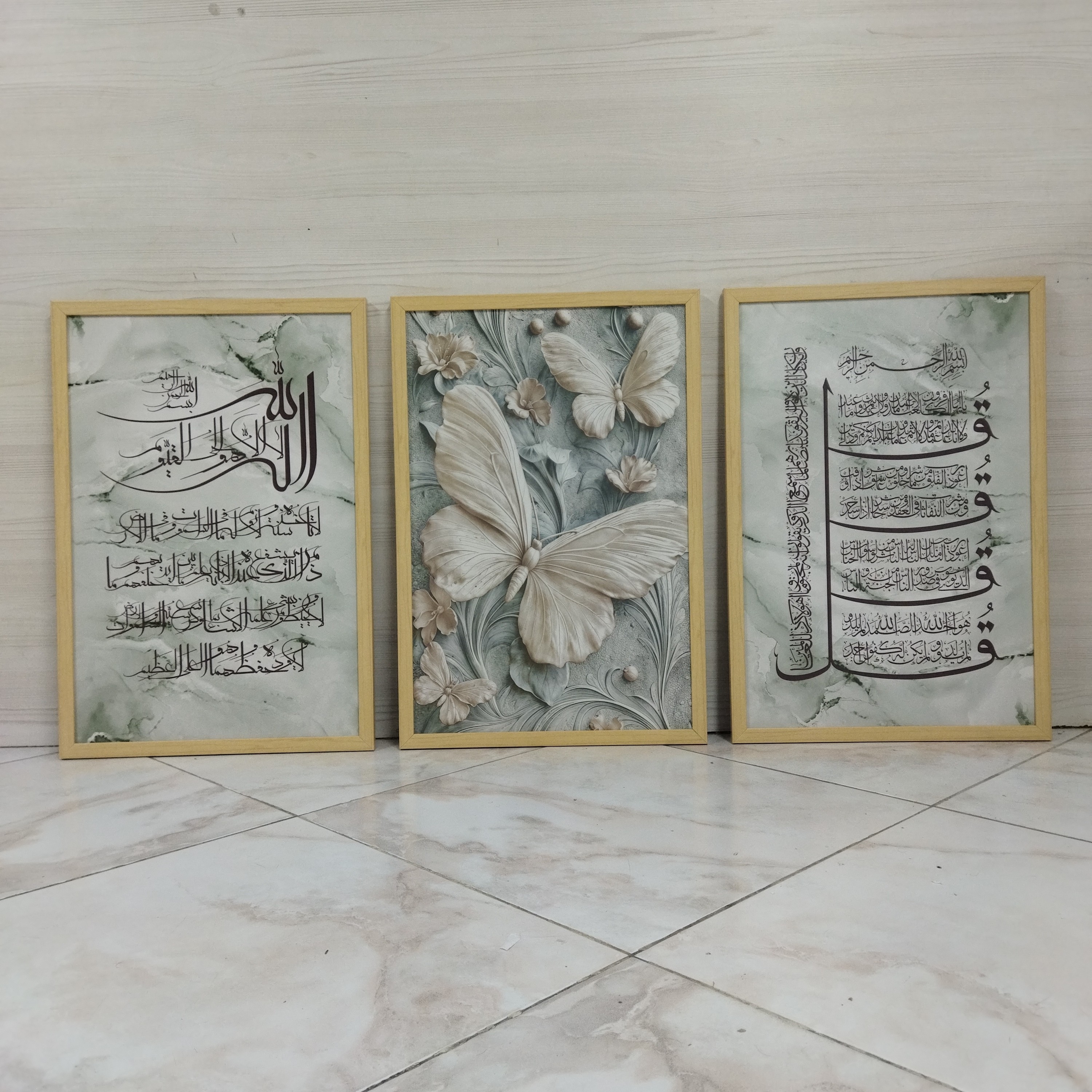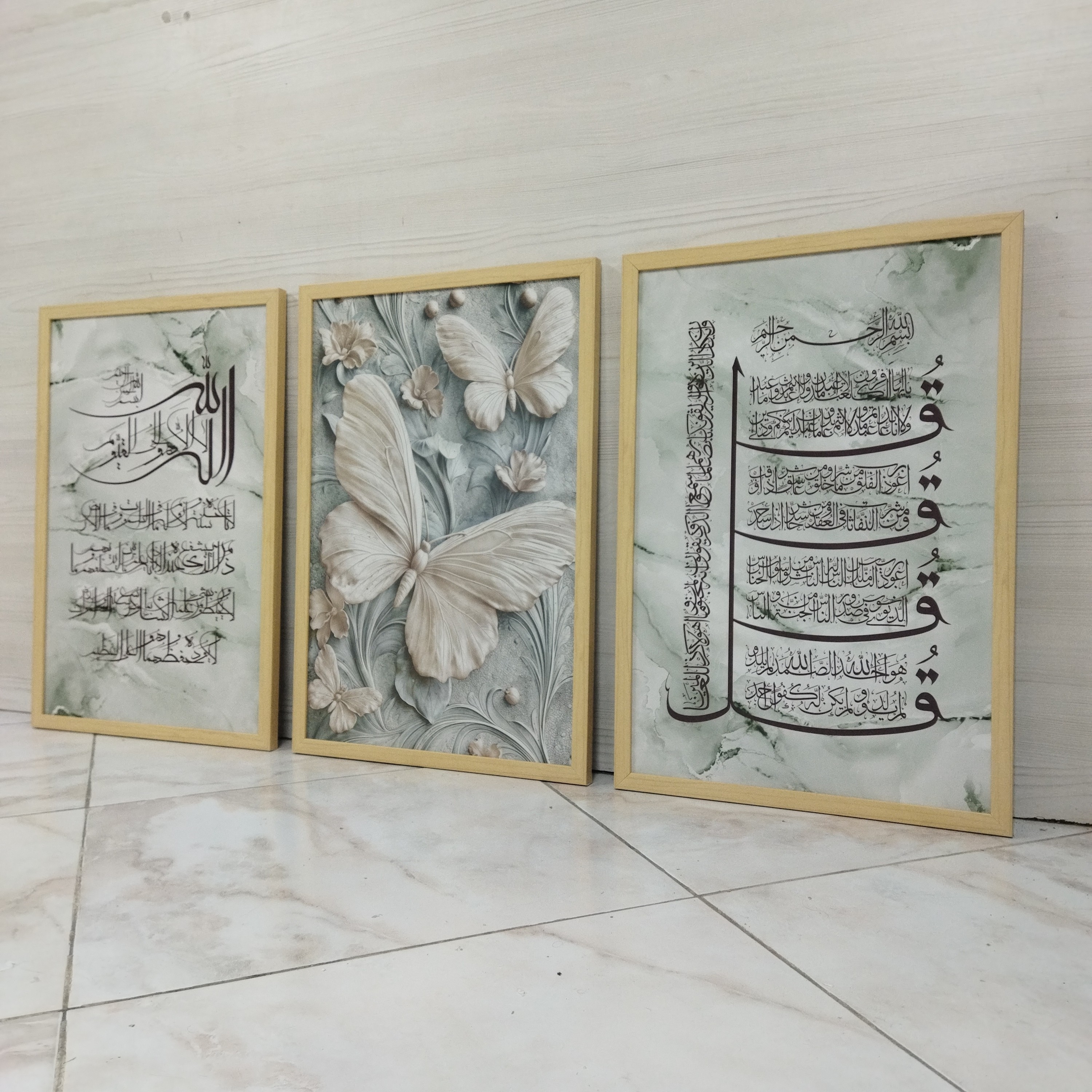 تابلو دکوراتیو سه تیکه ایت الکرسی،پروانه،چهارقل زمینه سبز سایز40در60 مبلمونسرا مدل 267120