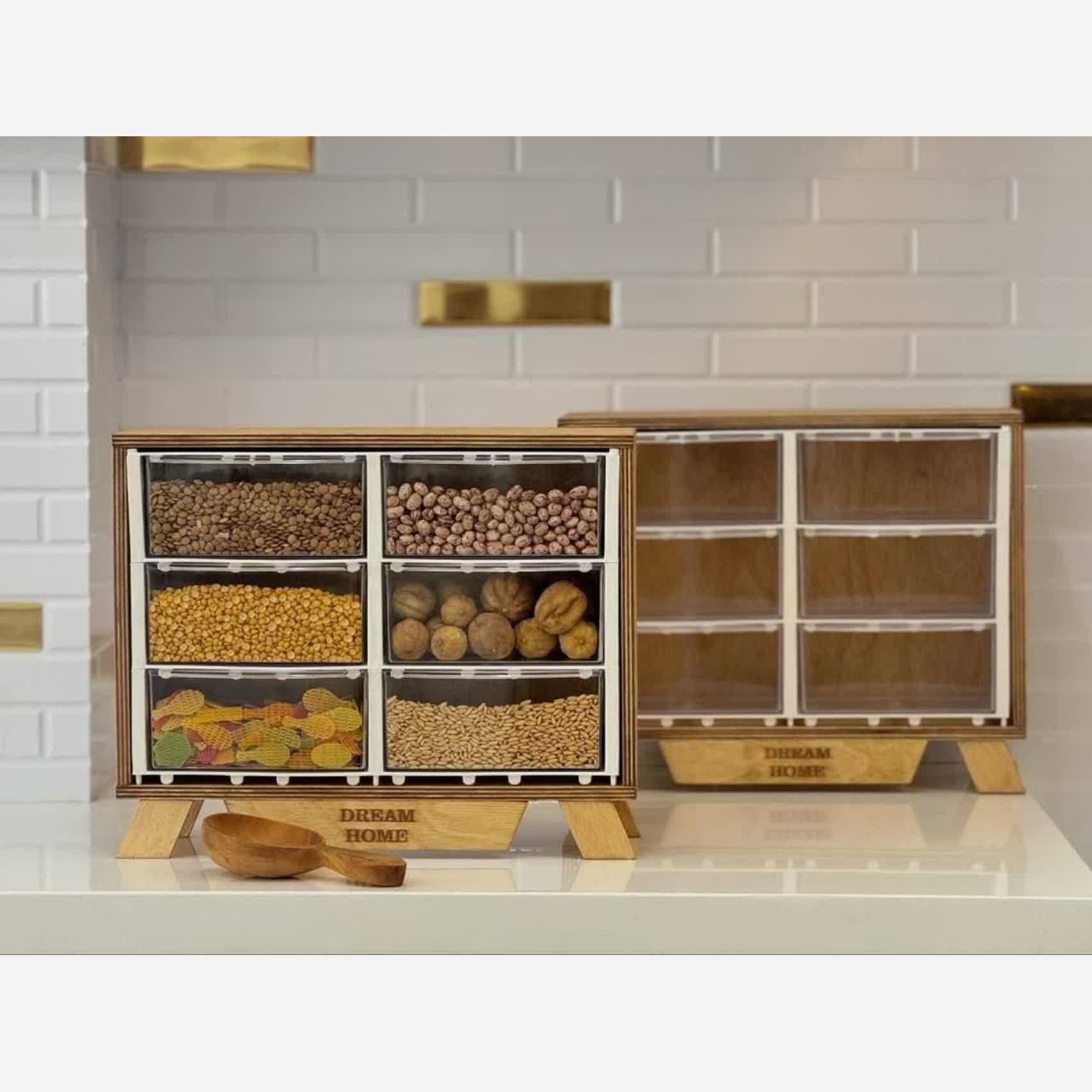 دارای 6 کشوی بزرگ 400 گرمی مناسب برای جبوبات و ادویه جات دارای چوب پلی وود قابل شستشو و ضد آب
