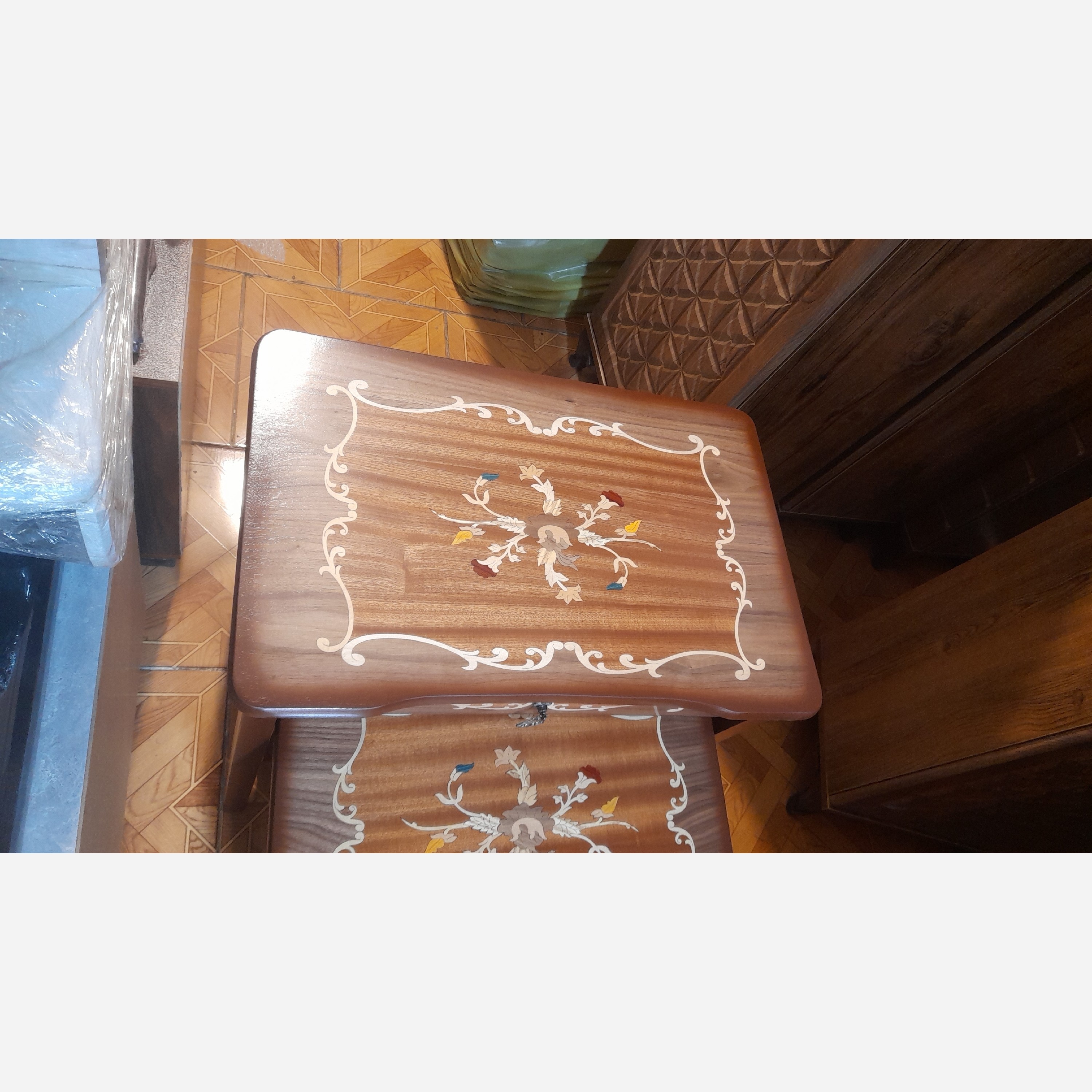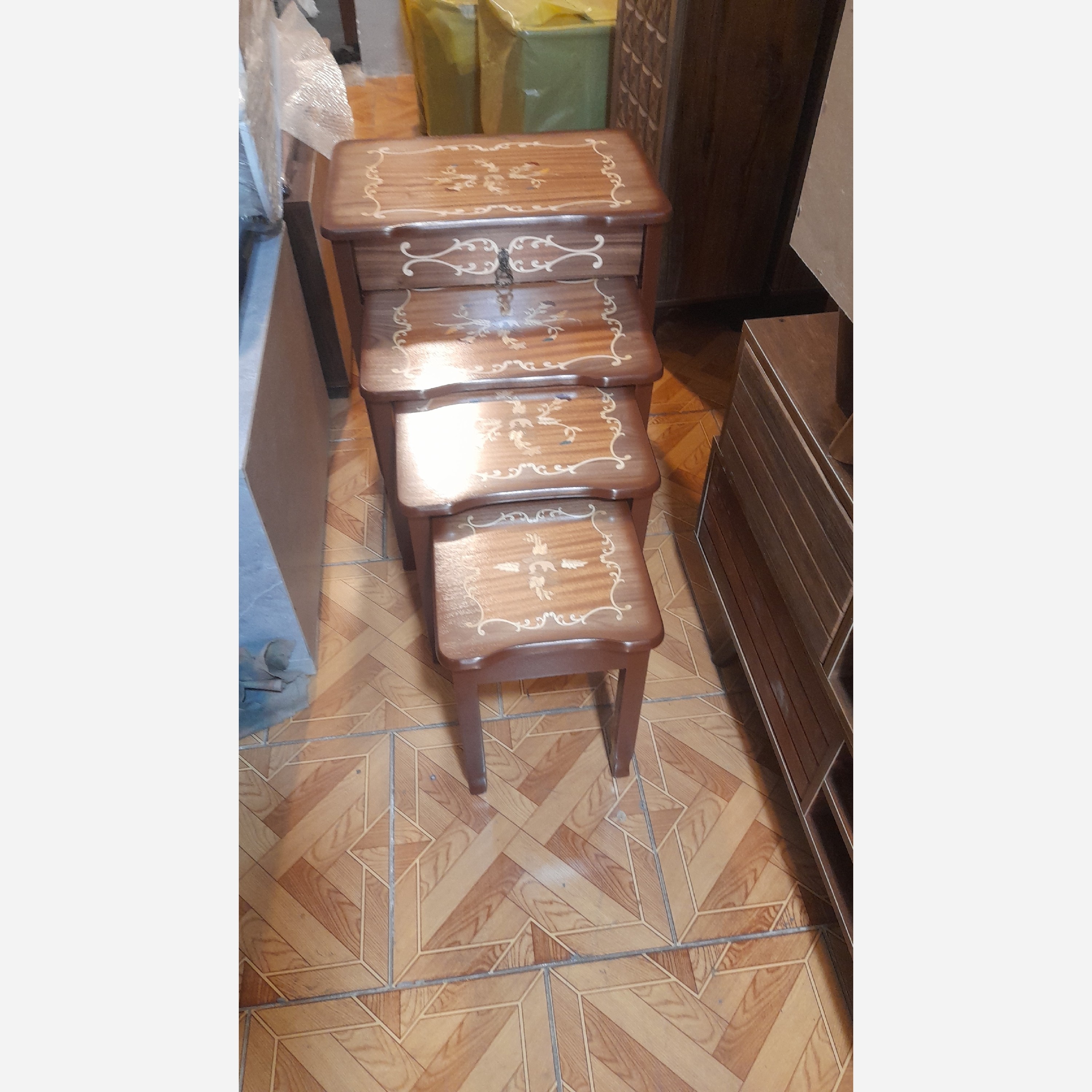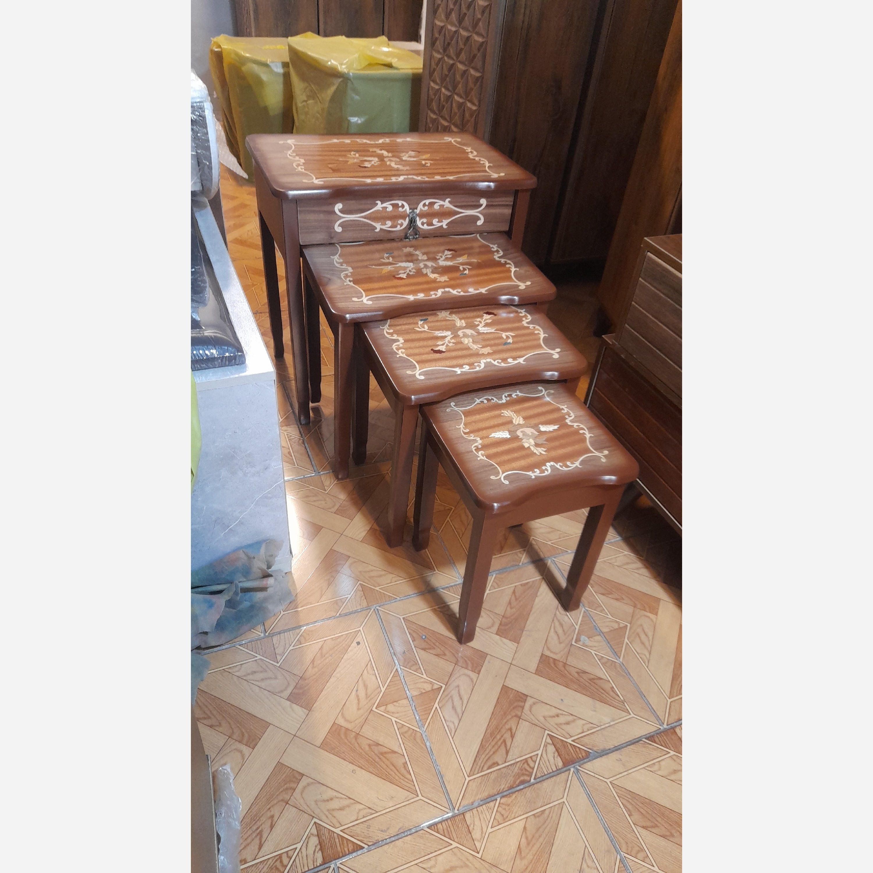 میز جلومبلی و عسلی 4 تکه جنس mdf ابعاد 40×60×60 جلومبلی مستطیل کشو خور 3 تا عسلی زیرهم رو روکش معرق کمجا و جمع و جور