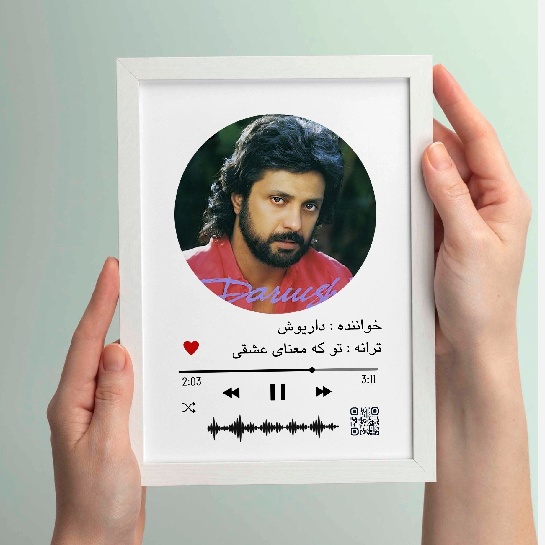 تابلوی موزیکال با طرح داریوش . قاب درجه یک و زیبا بهمراه محل آویز روی میخ. مناسب برای تزیین دیوار اتاق خواب، مغازه، کافیشاپ و هدیه به عزیزانتان . . ویژگی ها: *قاب عکس pvc درجه یک با سطح شیشه ای *چاپ بر روی باکیفیت ترین کاغذ مخصوص چاپ عکس *طراحی رایگان براساس سلیقه شما عزیزان *ایجاد بارکد برای تمامی آهنگ ها و فایل های صوتی و تصویری
