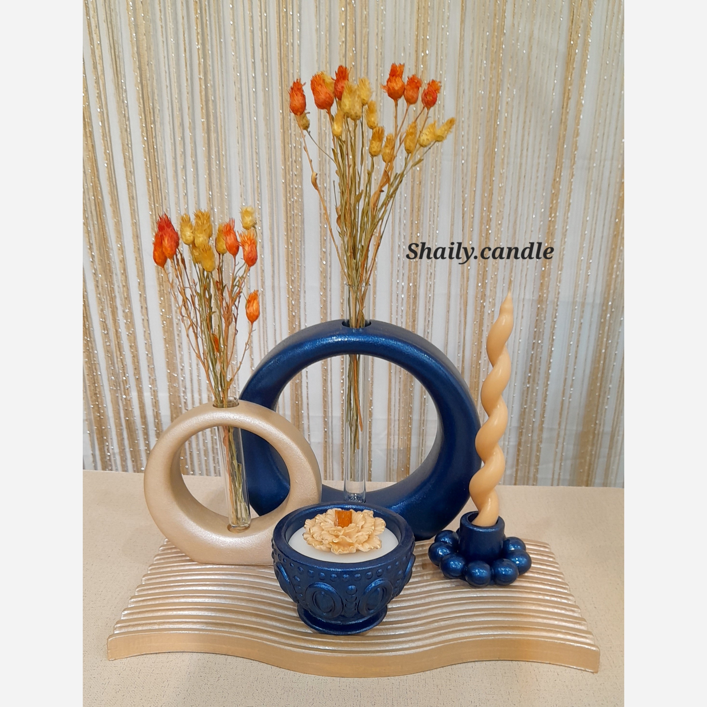 ست دکوری رنگ سورمه ای بژ گلجاها به ارتفاع 17/5 و 11/5 شات شمع قطر 9 و ارتفاع 6 جا شمعی و شمع قلمی ارتفاع 20 سینی سایز 30 در 13/5 بصورت تک هم قابل سفارشه رنگبندی قابل تغییره مناسب هدیه 🎁