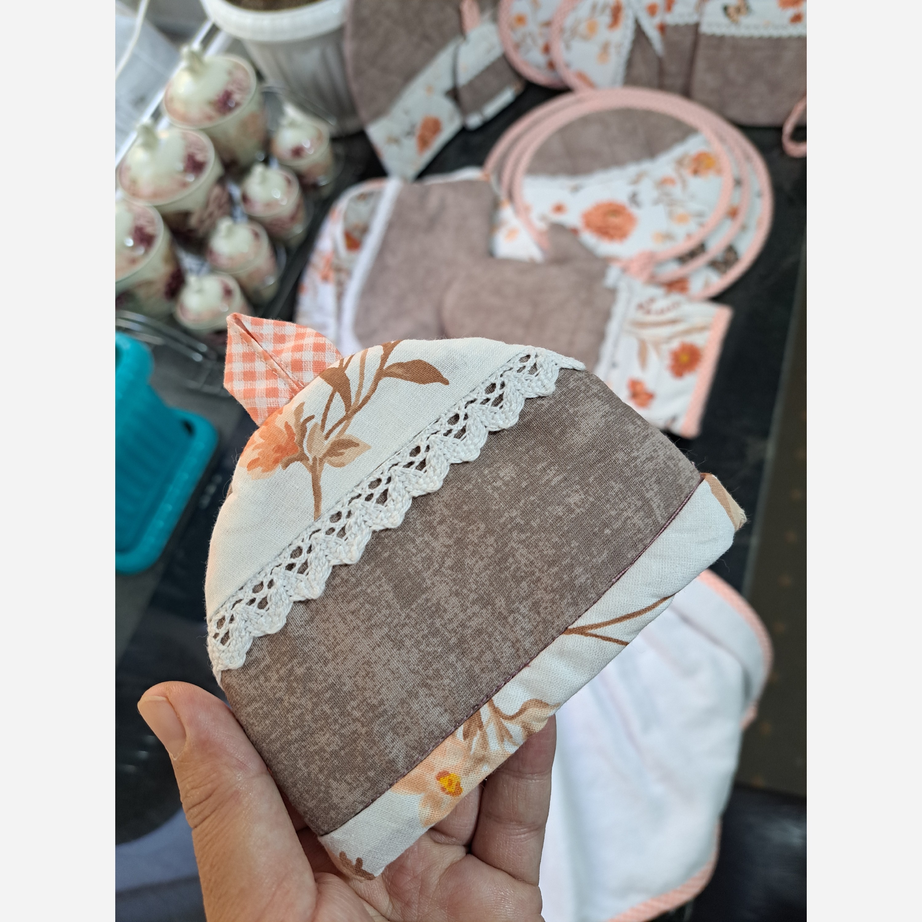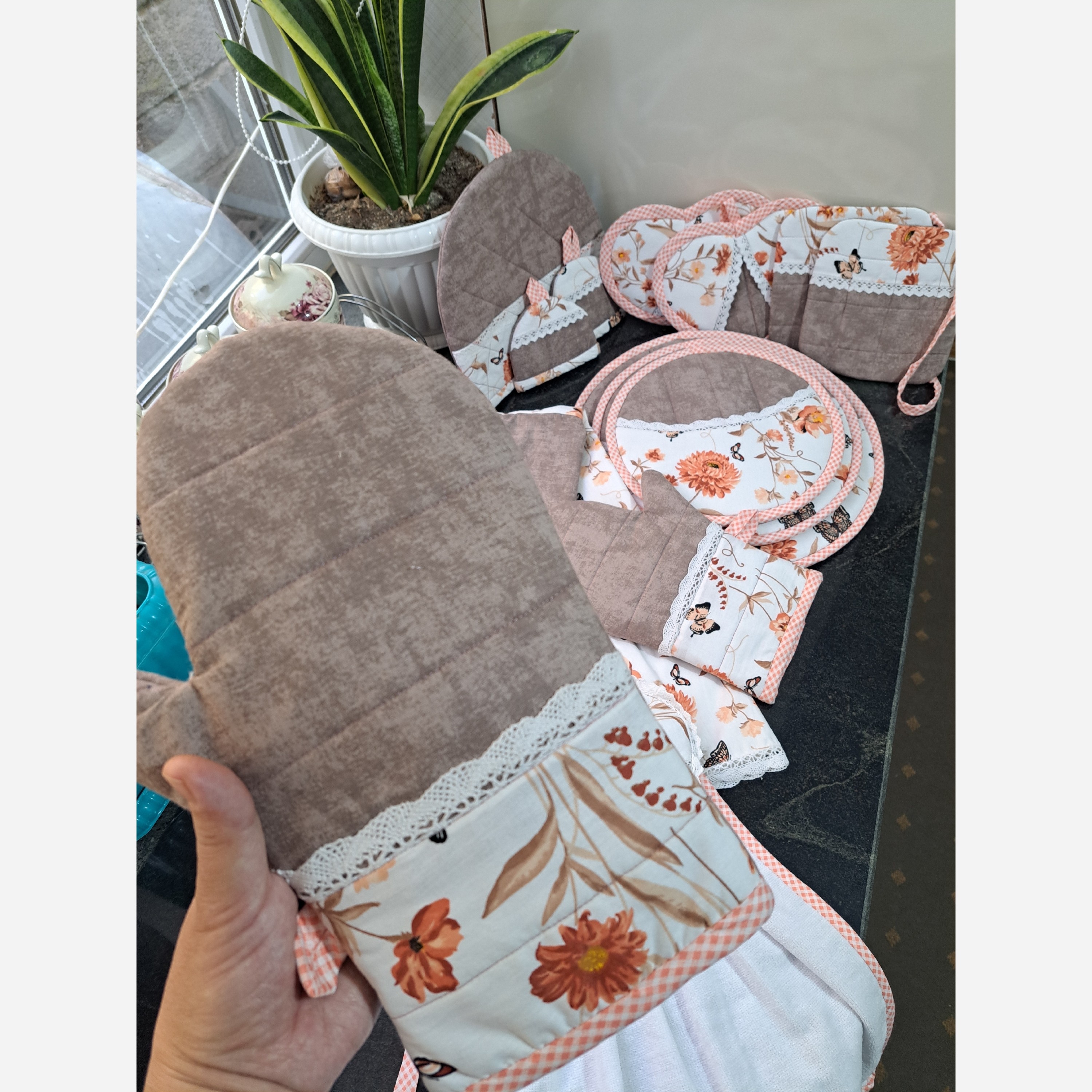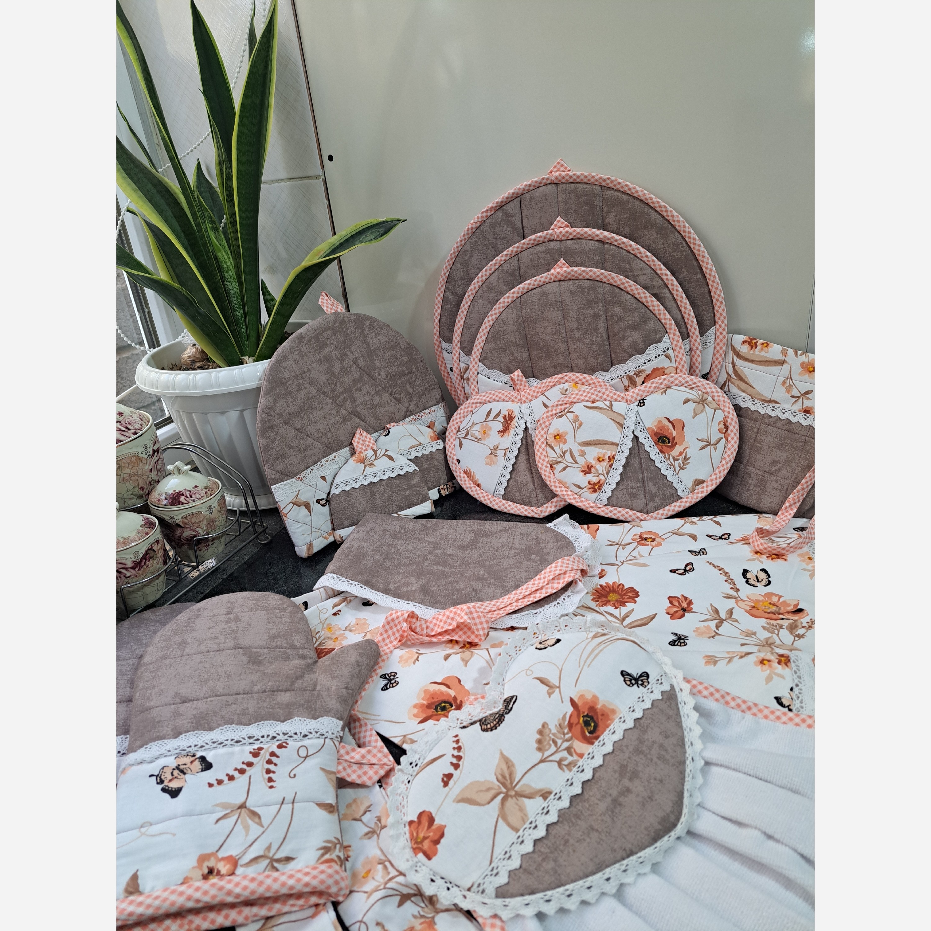 سرویس آشپزخانه، با کتان نخ درجه یک و دوخت تمیز و باکیفیت. قابل سفارش بصورت تکی و یا سرویس کامل. میتونی عکس پارچه انتخابیتو برام بفرستی تا با طرح و رنگ و مدل انتخابی شما براتون سرویس آماده کنم. این سرویس شامل: دمکنی حلال در سه سایز، دستکش فر، دستگیره چدنی، دستگیره قلبی، پیشبند، حوله قلبی، کاور قوری و دستگیره معمولی بند دار