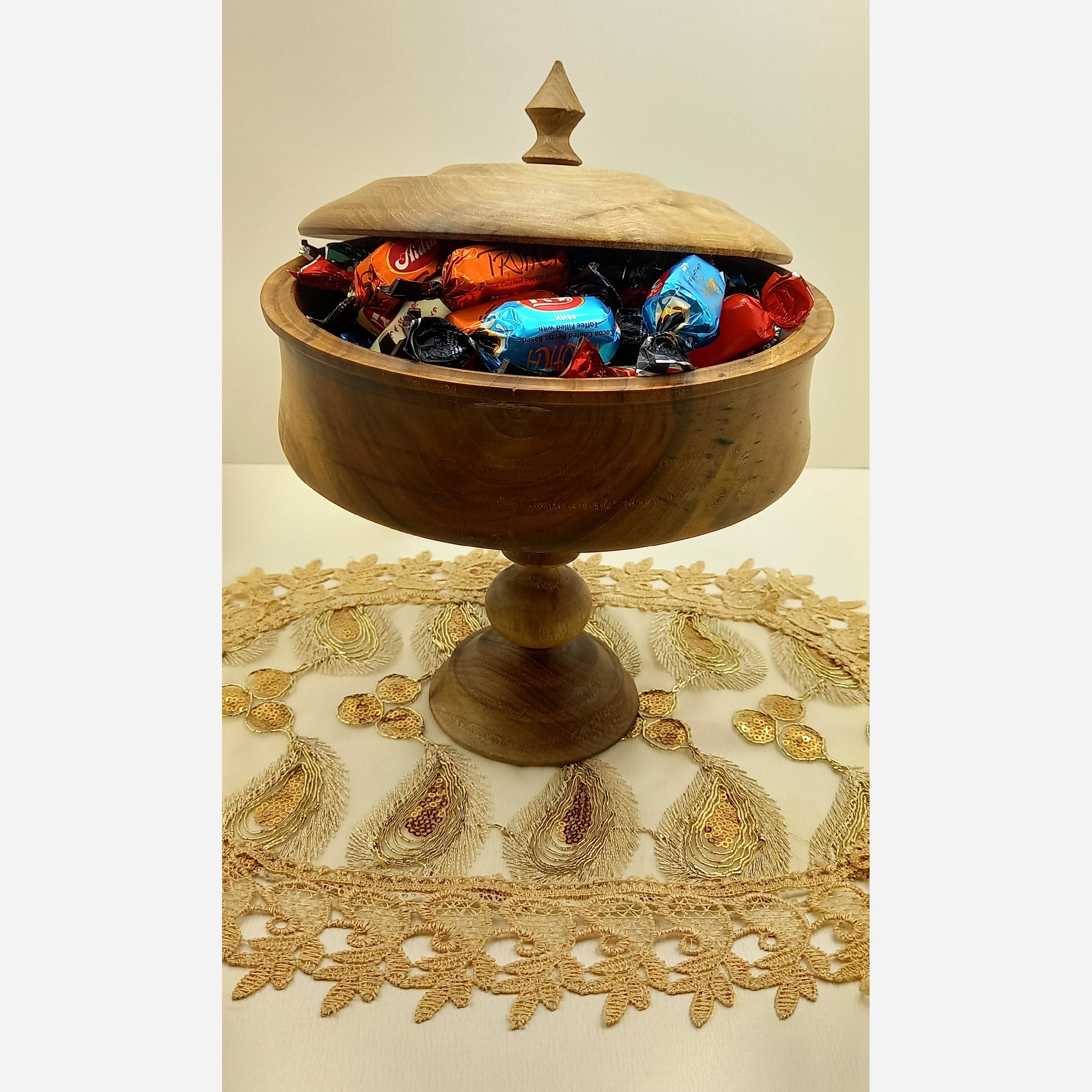 شکلات خوری پایه بلند چوب طبیعی گردو و با هنر دستساز خراطی و روغنکاری شده سایز بزرگ و بسیار سبک