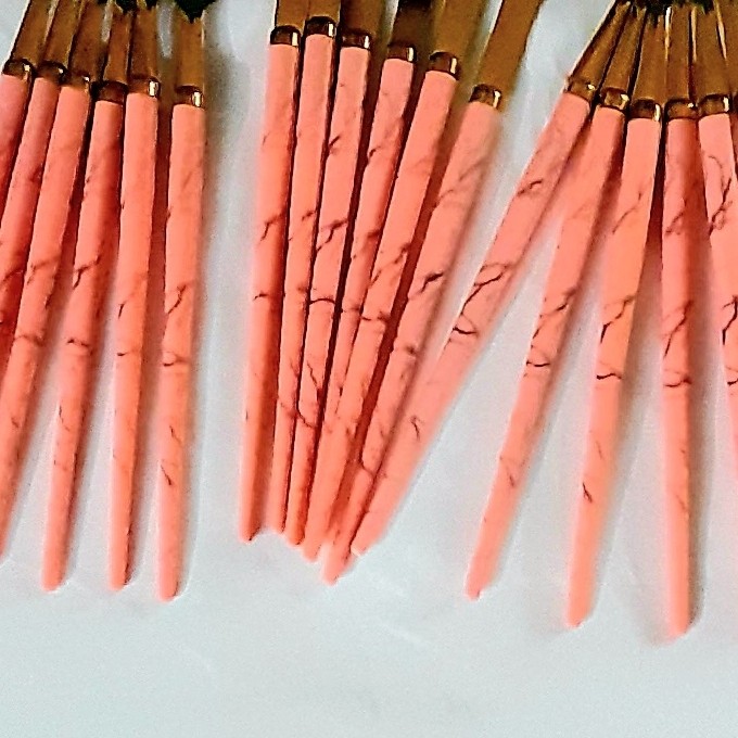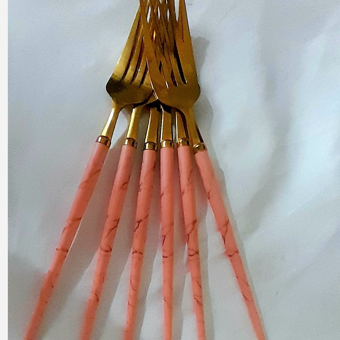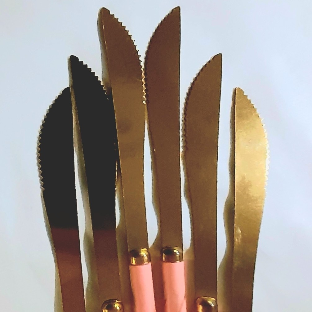ست 18 تایی قاشق چنگال وچاقو استیل طلایی بادسته رنگی صورتی با رگه های طلایی که برای استفاده در مهمانایی های مناسبتی مورد مصرف دارند .برای غذاخوری چندان مناسب نیستند ولی برای میوه خوری وکیگ وشیرینی مناسب هستند باتوجه به قیمت مناسب ان وچون بارها میتوان از ان استفاده کرد جایگزین مناسبی به جای لوازمات یکبار مصرف هستنددسته خوش فرم ورنگ ملایم طلایی بون استیل جلوه خاصی به مهمانی ها میبخشد
