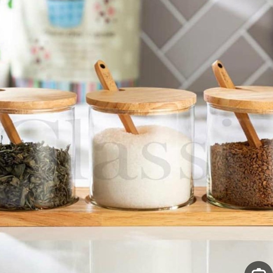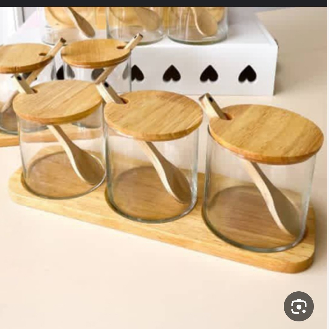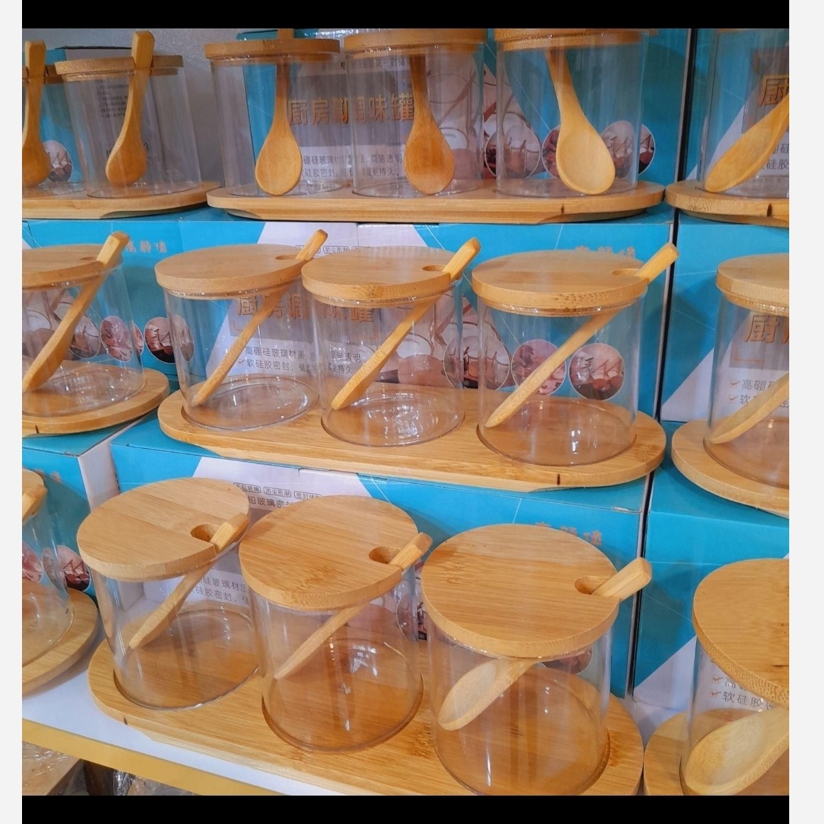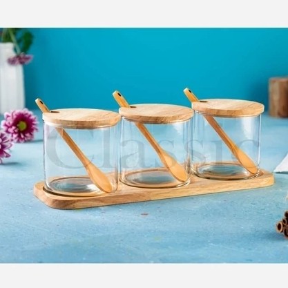 پا سماوری یا جا ادویه ای پیرکس وادراتی همراه قاشق و استند و درب چوبی جنس بامبو فوق العاده با کیفیت و شیک