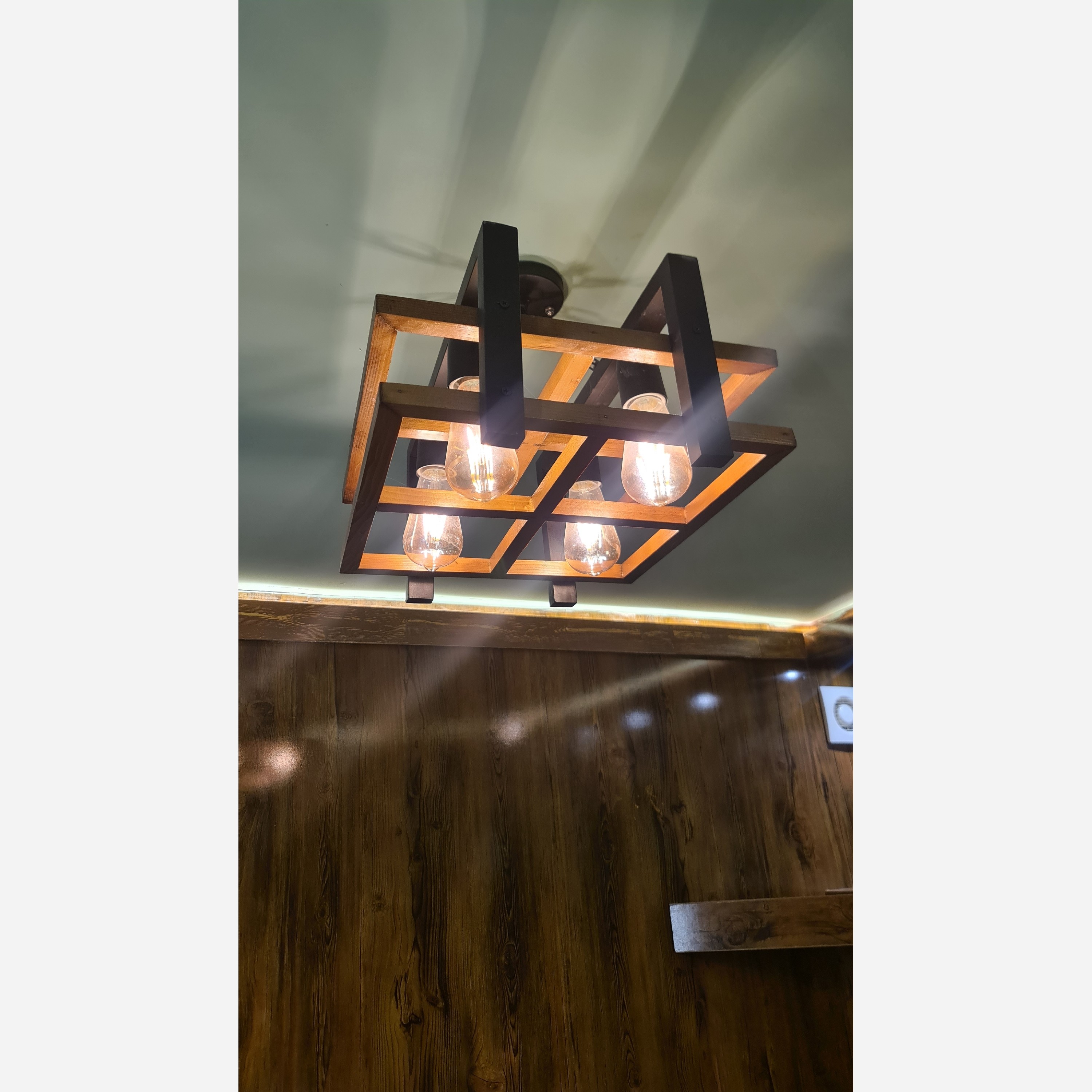 لوستر تمام چوب 4 شعله مخصوص سالن و آشپزخونه و اتاق 4 عدد لامپ معمولی میخوره و هر نوع لامپی که توی خونه داشته باشی روش سواد میشه جنس بدنه تمام چوب و کاملا قابل شست و شو