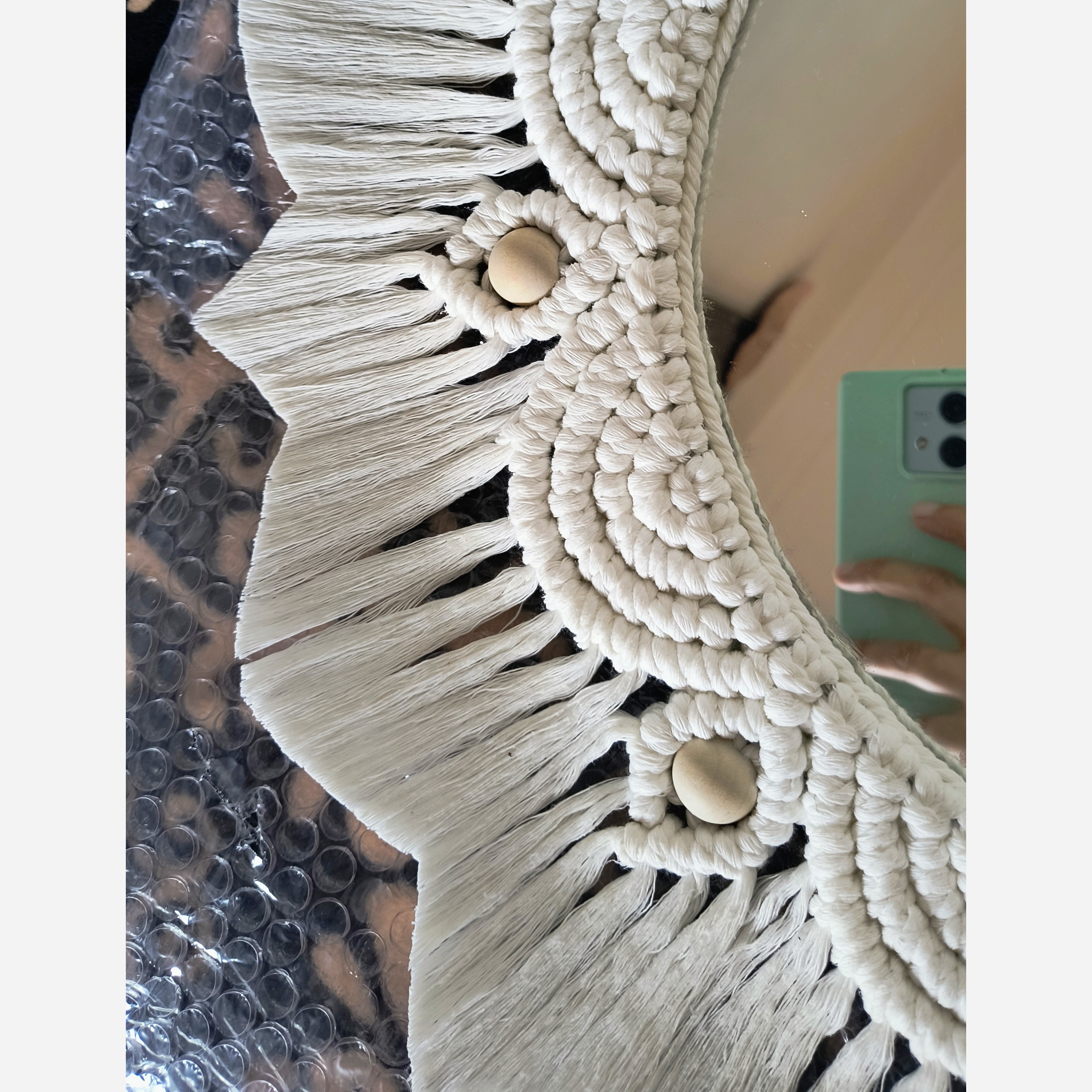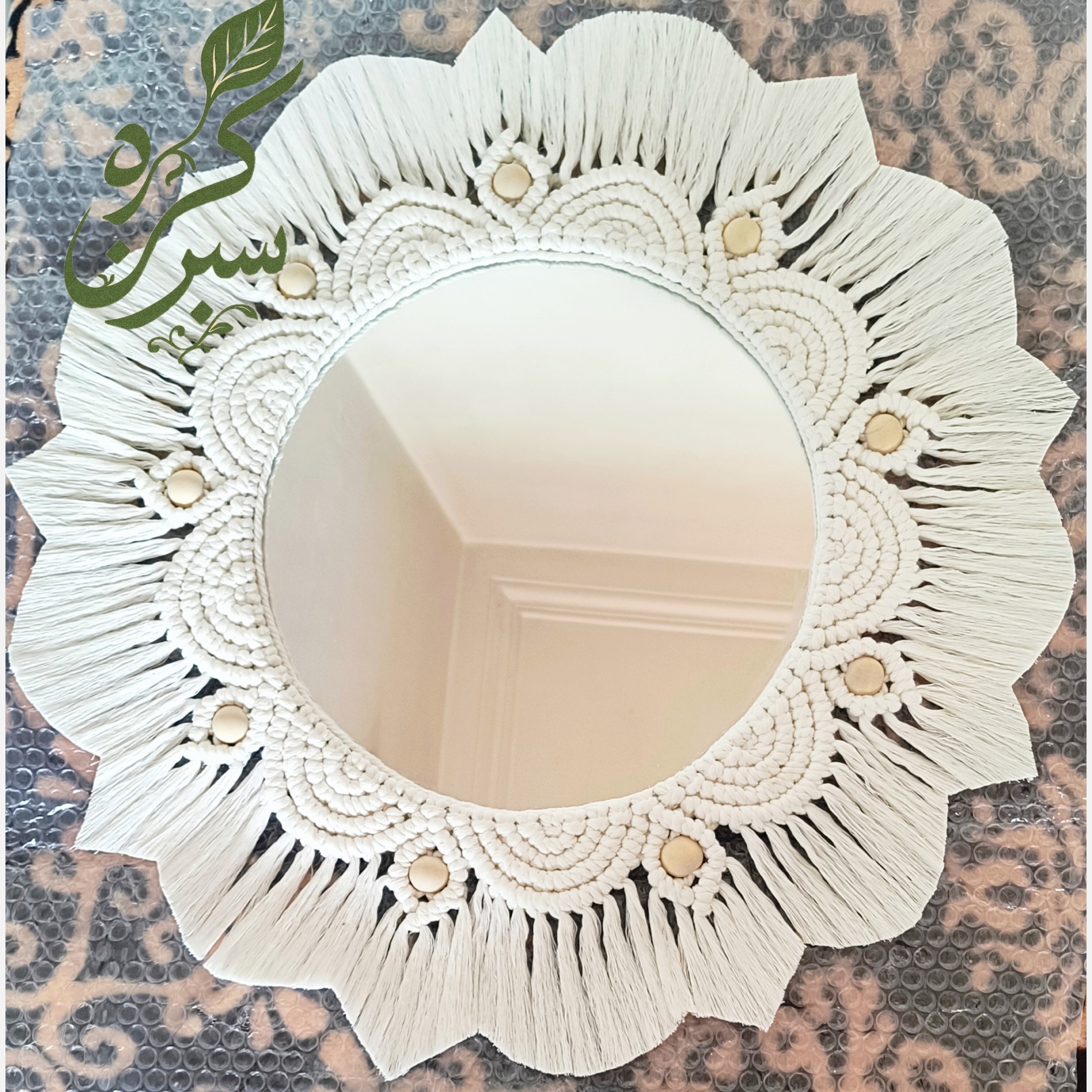آینه مکرومه بافی قطر آینه 30 سانت قطر کل کار 55 سانت جنس نخ مکرومه کتان مهره کار شده پشت کار با چسب چوب و چسب حرارتی محکم شده و برای آویزان کردن بند دارد. بسیار زیبا و شیک