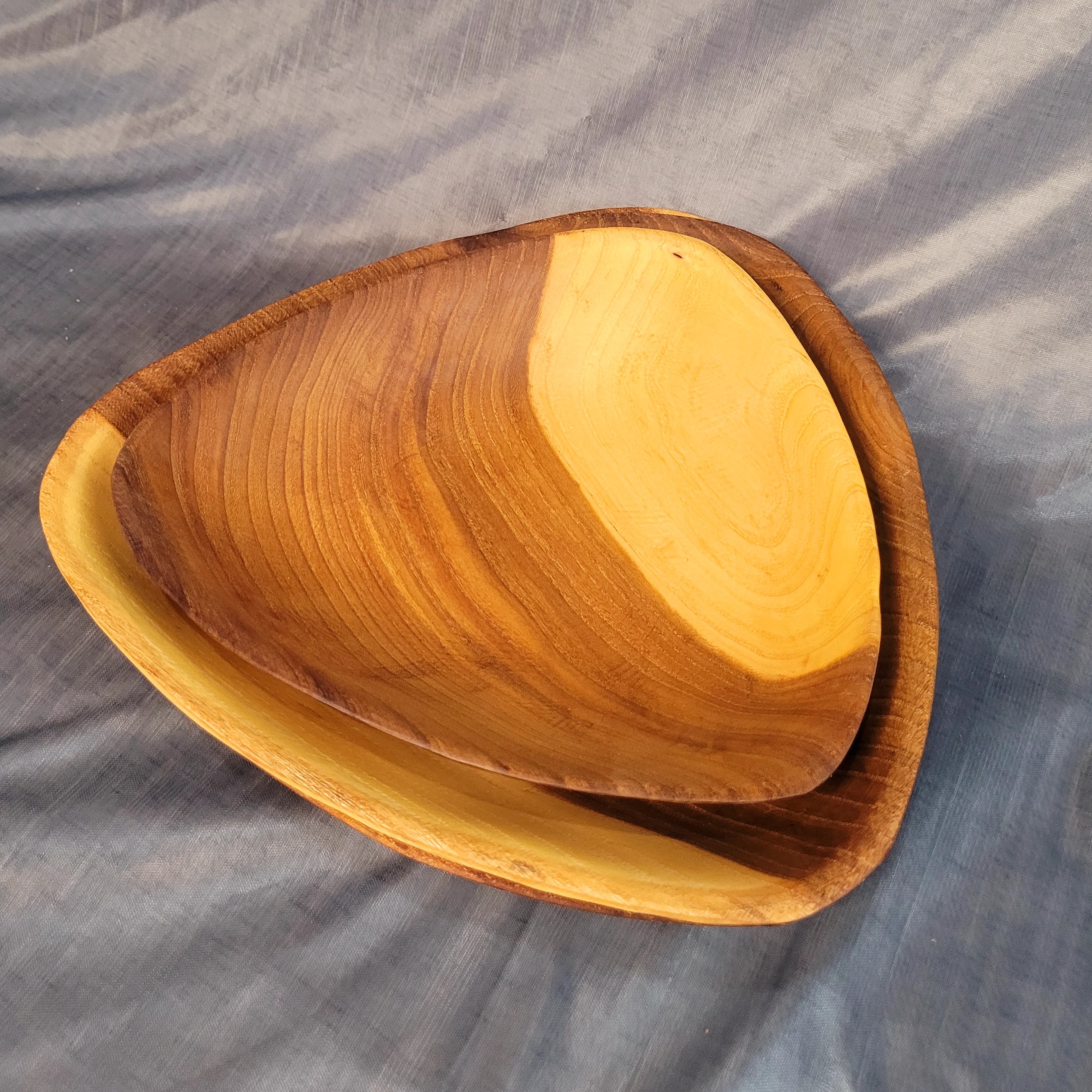 کاسه های مثلثی یکی از جذابترین مدلهای ظروف هست که ضمن زیبایی و خاص بودن ، هنر دست استادکار رو هم به نمایش میزاره این اثر با چوب نارون ساخته شده که با رنگهای گرمی که داره زیبایی میز پذیرایی تون رو دو چندان میکنه کاملا ضد آب بوده و میتونی با خیال راحت استفاده کنی ظرف بزرگ 550 ظرف کوچک 420