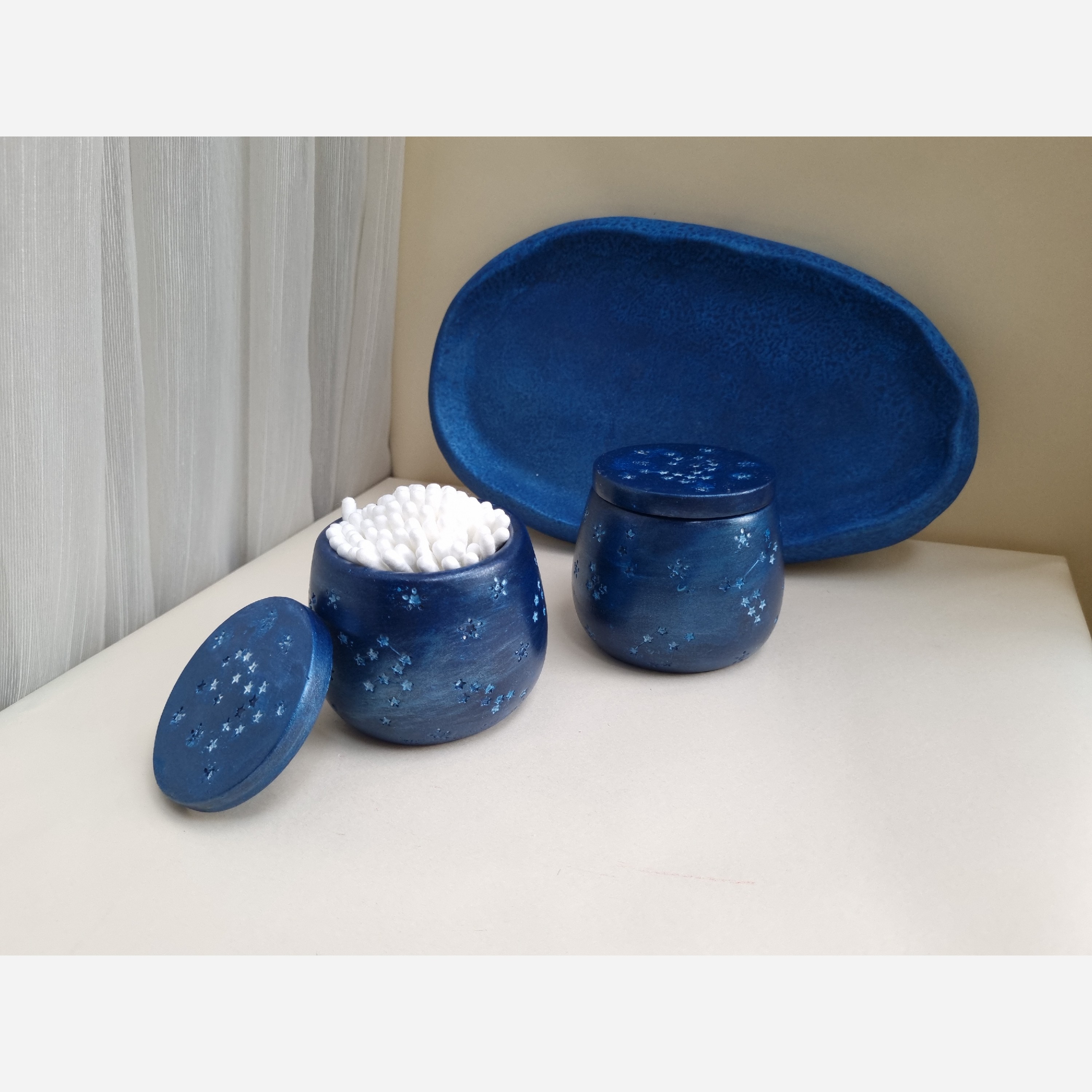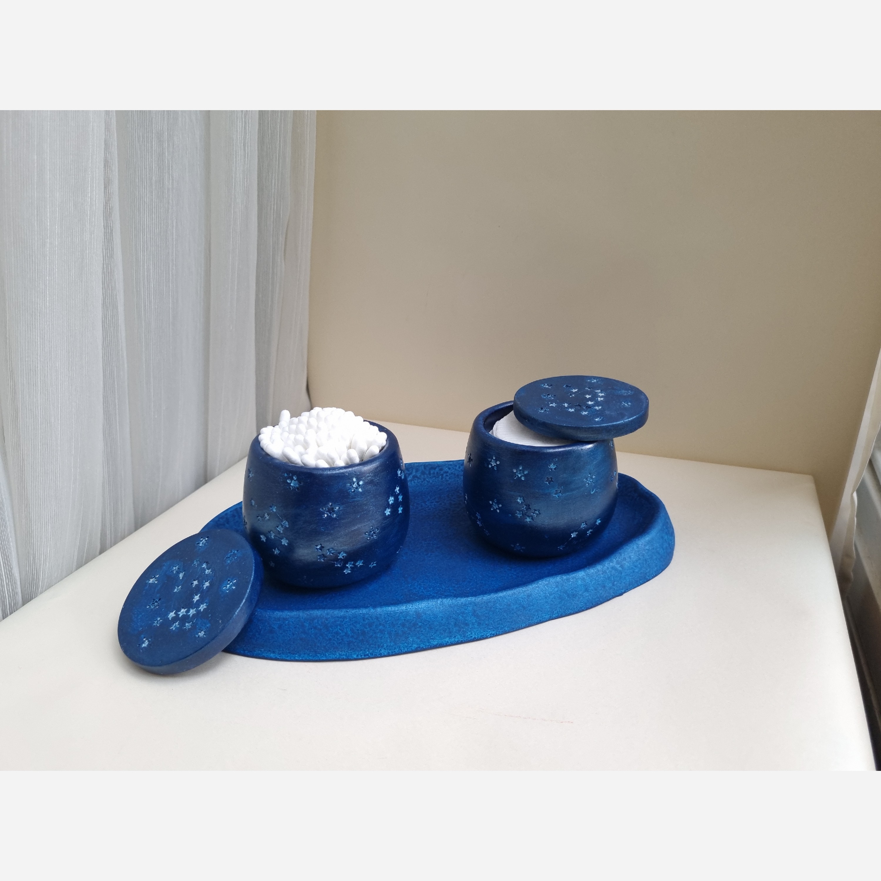 ✨ ست سنگ مصنوعی تزئینی – طرح آسمان پرستاره 🟦 برای اونایی که زیبایی و نظم رو همزمان میخوان! این ست زیبا شامل دو ظرف کاربردی با درب، روی یک سینی هماهنگ و چشمنوازه که با الهام از آسمان شب طراحی شده. جنسش از سنگ مصنوعی با دوام بالاست و با رنگ آبی خاص و ستارههای درخشان تزئین شده. هم شیکه، هم محکم، هم پرکاربرد! 🧴 موارد استفاده پیشنهادی: • جای گوشپاککن • نگهداری پد آرایشی • نگهدارنده جواهرات، کش مو یا هر چیز کوچیک دیگه • مناسب برای سرویس بهداشتی، میز آرایش، یا حتی روی میز کار
