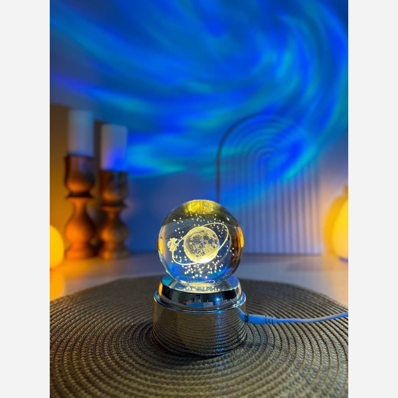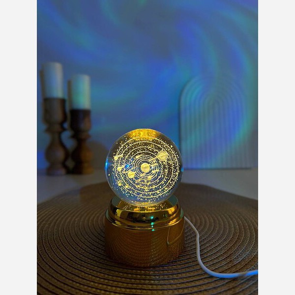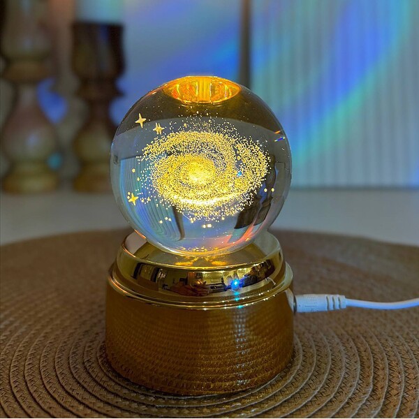 چراغ خواب گوی کریستالی میتواند یک هدیه بسیار زیبا به کودکان و حتی بزرگسالان باشد. پایه ی طلایی رنگ زیر گوی از طریق کابل مربوطه به برق متصل می گردد و سپس LED های روشنایی که داخل پایه ی طلایی رنگ طراحی شده اند و با اهرم چرخش خودکاری که در وسط چراغ های ال ای دی دارد گوی به طور خودکار میچرخد و روشنایی دل انگیزی به گوی می دهند طوری که طرح داخل گوی به زیبایی می درخشد و نور بر روی سقف اتاق می تابد . این محصول یکی از استثنایی ترین محصولات دکوراسیون داخلی می باشد . طرح این گوی کریستالی به صورت ماه و دختر می باشد که اگر به USB وصل شود یک ماه و دختر بسیار زیبا نمایان می شود .
