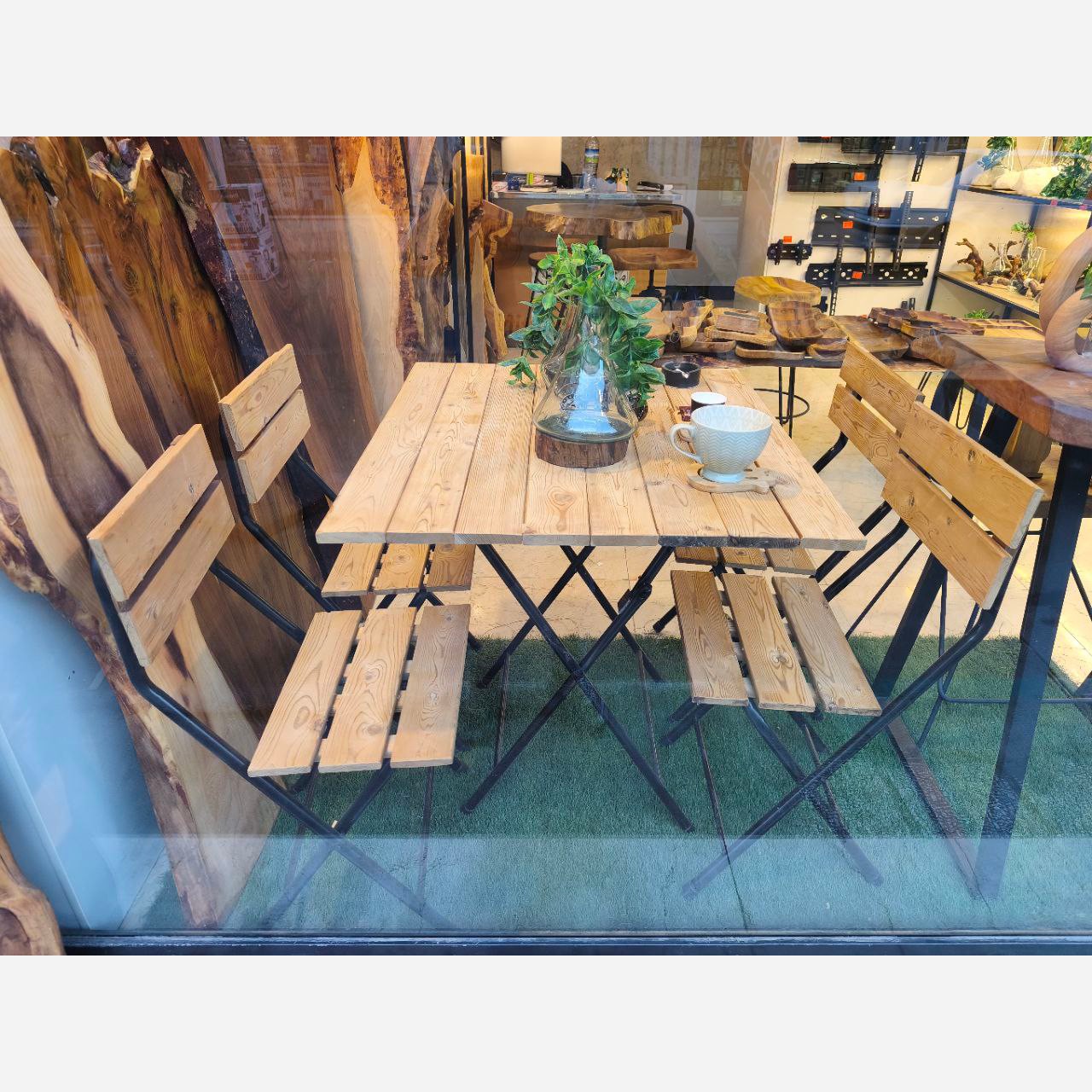 ساخته شده از چوب روس 7 میل و ستون ها ساخته شده از ورق آهن دو میل. تحمل وزن تا 150 کیلو. هم میز و هم صندلی ها قابلیت تاشو دارند.